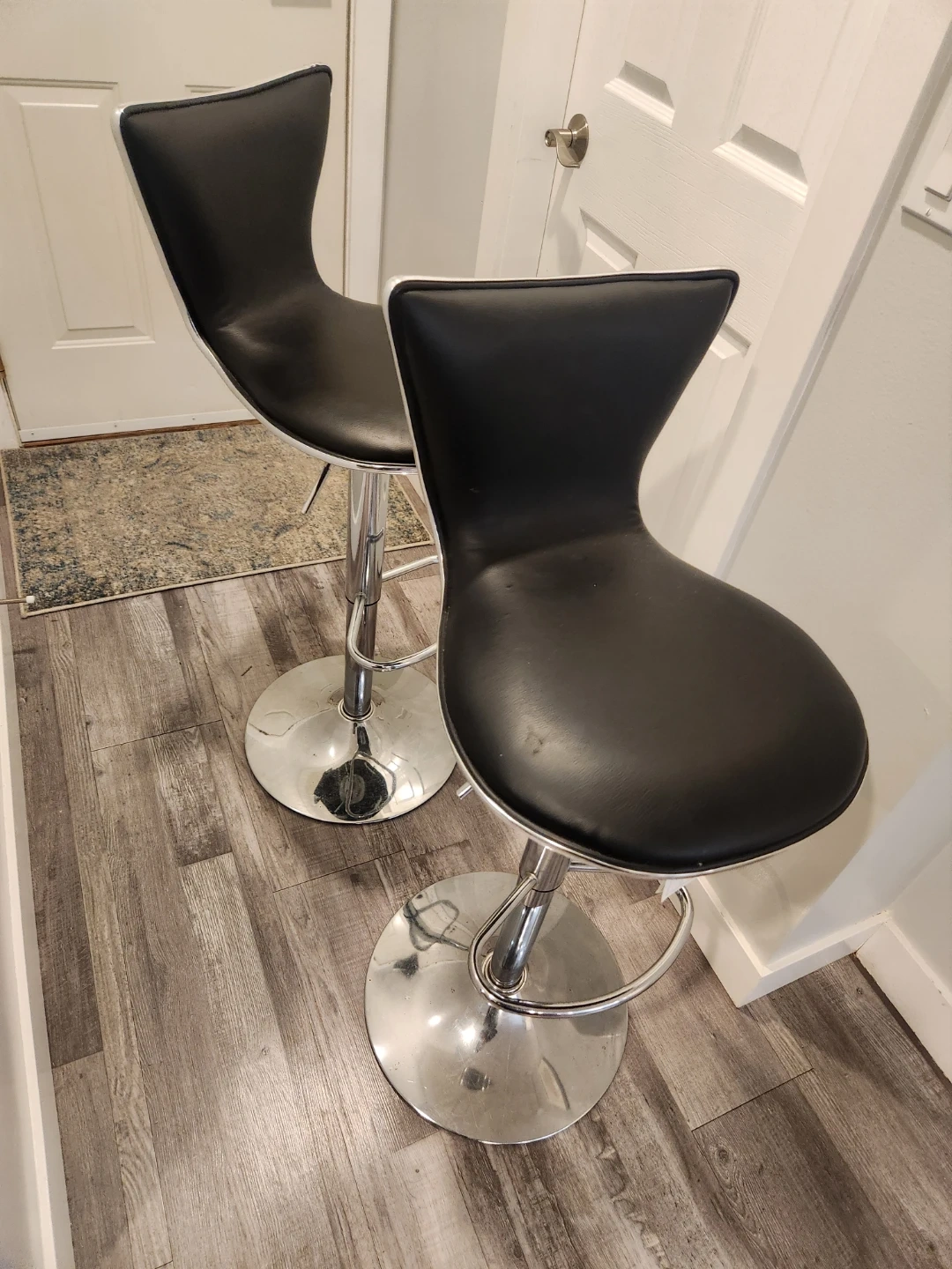 Selling a set of two black bar stools. They're adjustable in height with a chrome base. The seats are cushioned for comfort.
