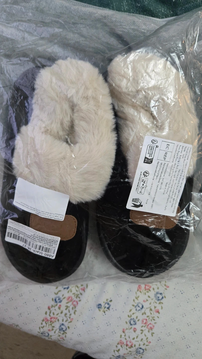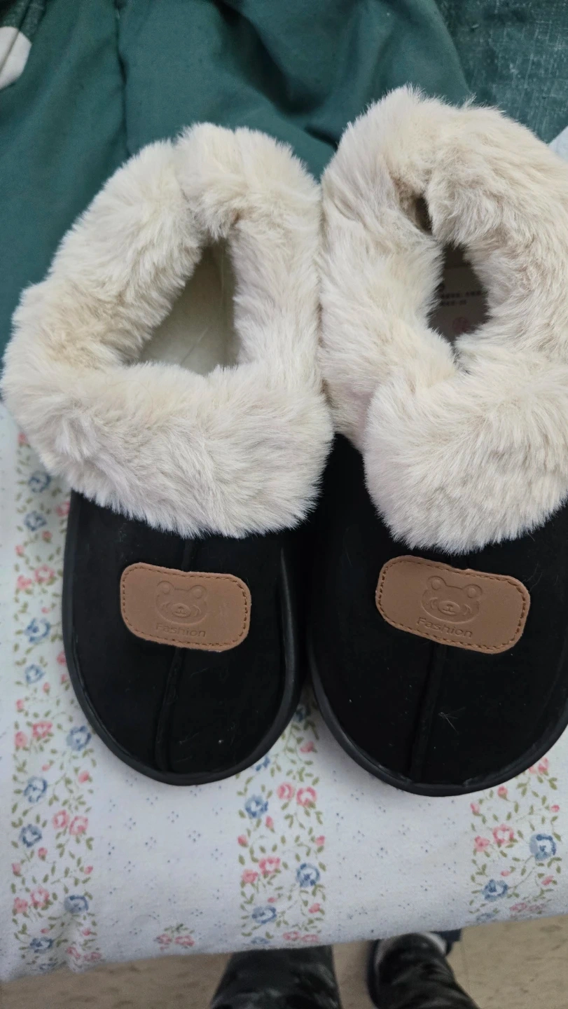Comfy black boots with a fuzzy cream-coloured lining. These slip-on shoes feature a cute bear detail on the front they are to small for me