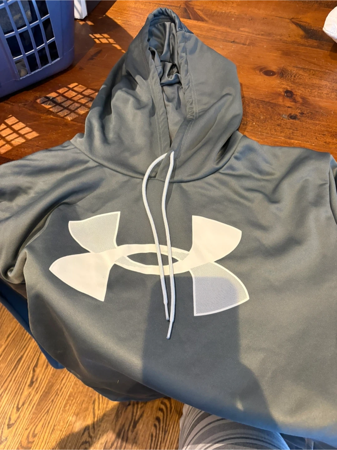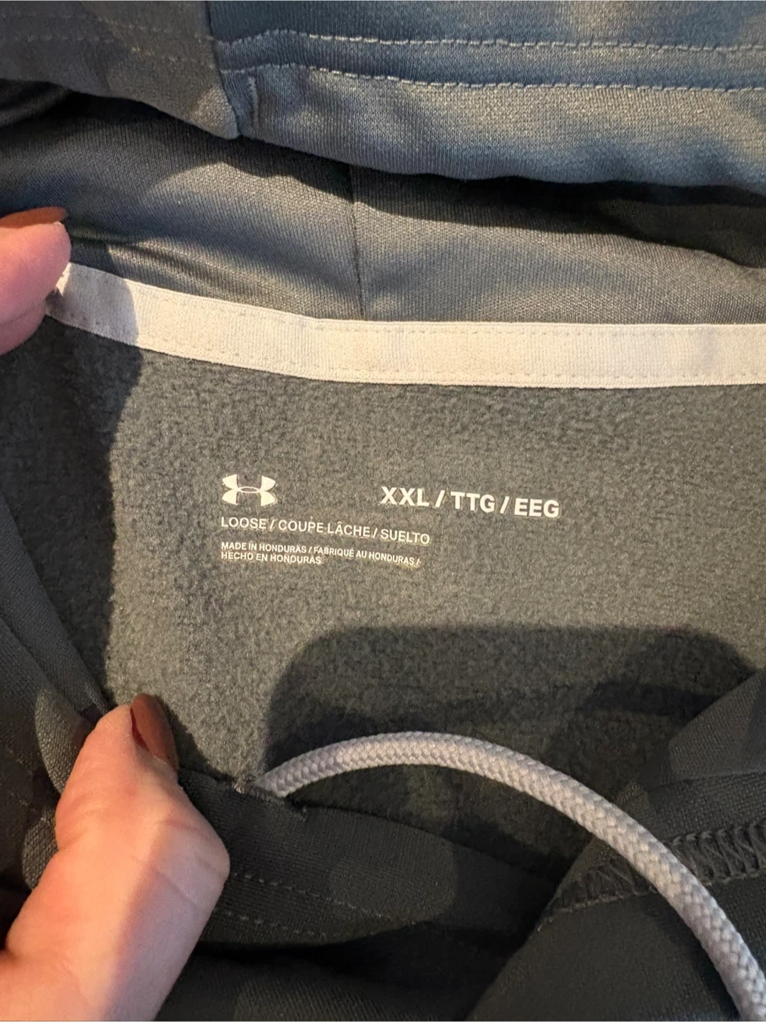 Under Armour hooded sweatshirt in grey. Features the signature Under Armour logo on the front. Made of soft, comfortable material. Size is XX-Large.