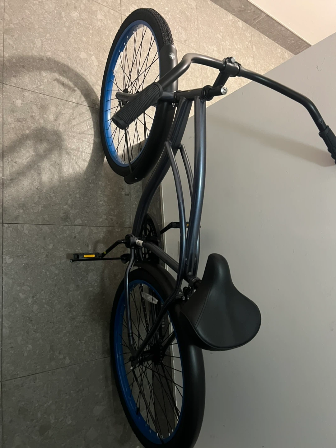 Dark grey cruiser bicycle with blue rims. It has a comfortable black seat and wide handlebars for a relaxed ride. This bike is great for cruising around town on sunny days!