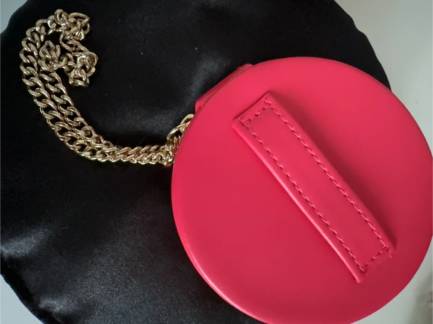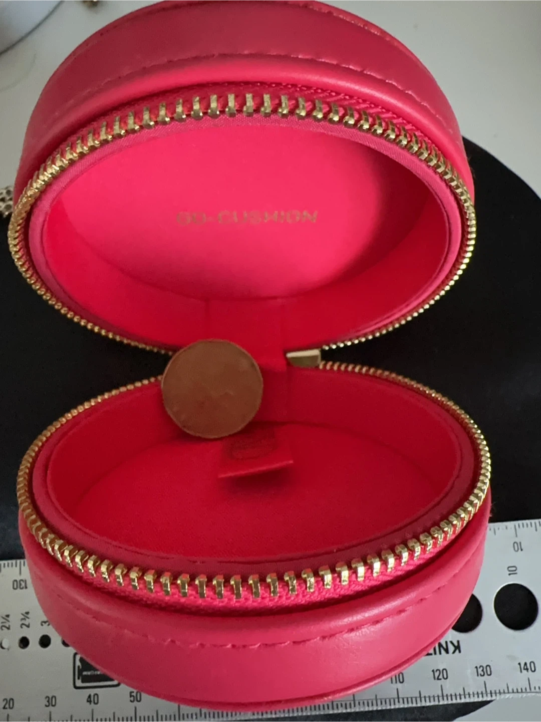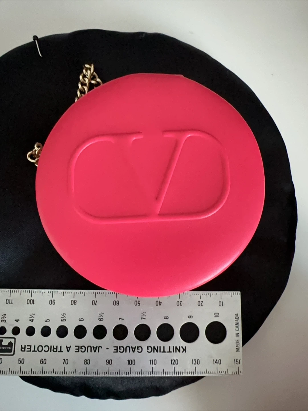 This pink round cosmetic case features the iconic Valentino "V" logo embossed on the outside. It's labelled "GO-CUSHION" inside and has a zipper closure with a gold chain strap. Its compact size makes it handy for travel or on-the-go touch-ups!