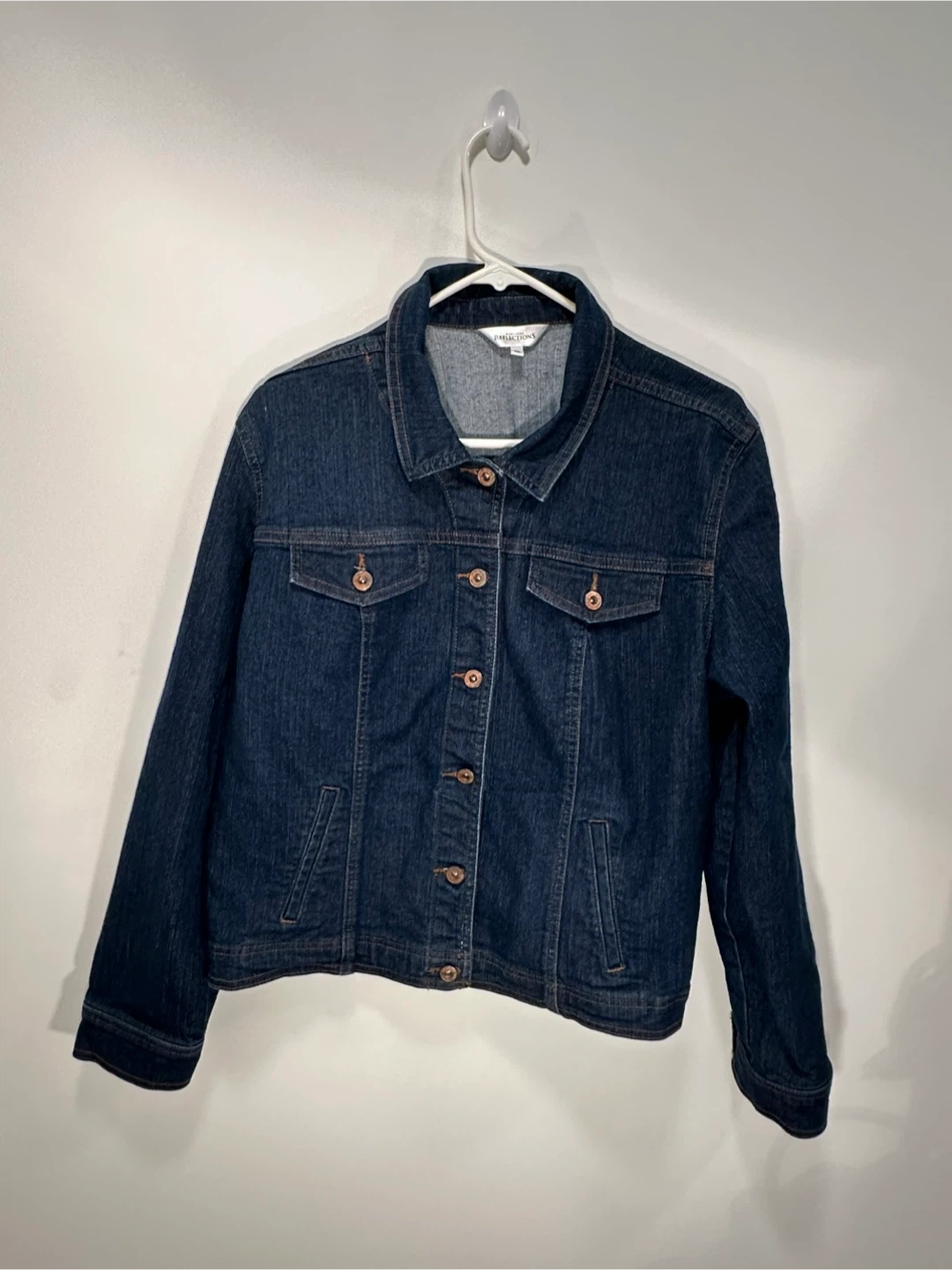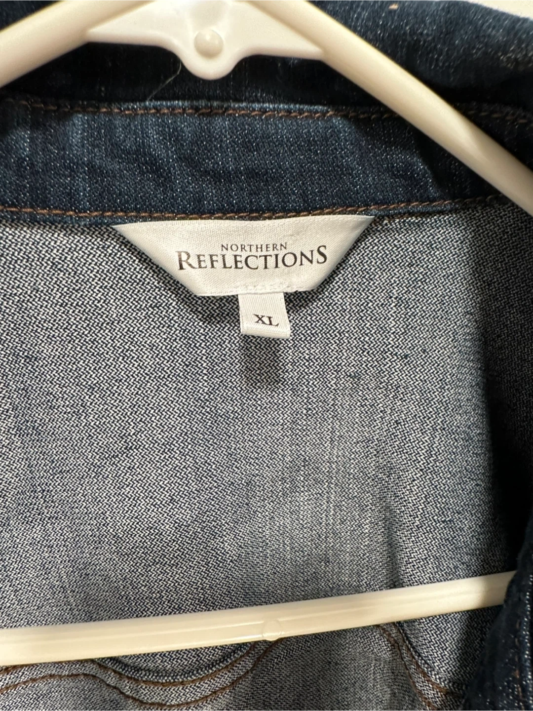 A classic dark wash denim jacket from Northern Reflections. It's a size XL with a button-up front and chest pockets. This jacket is perfect for layering on cooler days. It's made of durable denim.