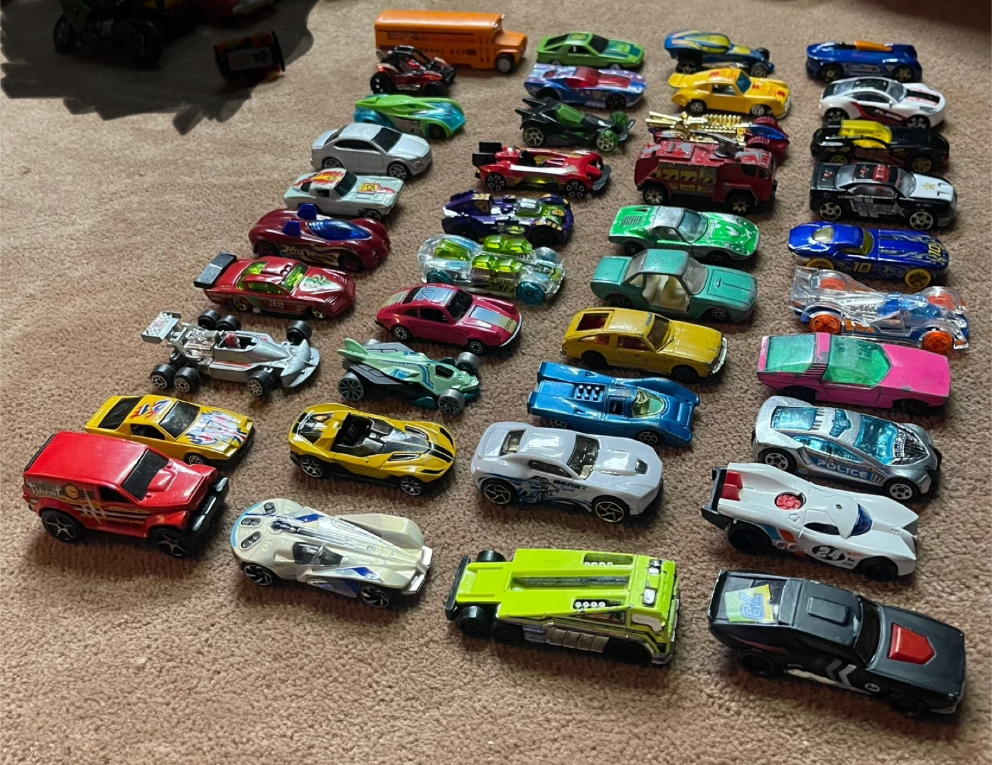 This is a collection of assorted toy cars, including Hot Wheels. They're made of die-cast metal and plastic. This lot is great for collectors or kids who love cars!
