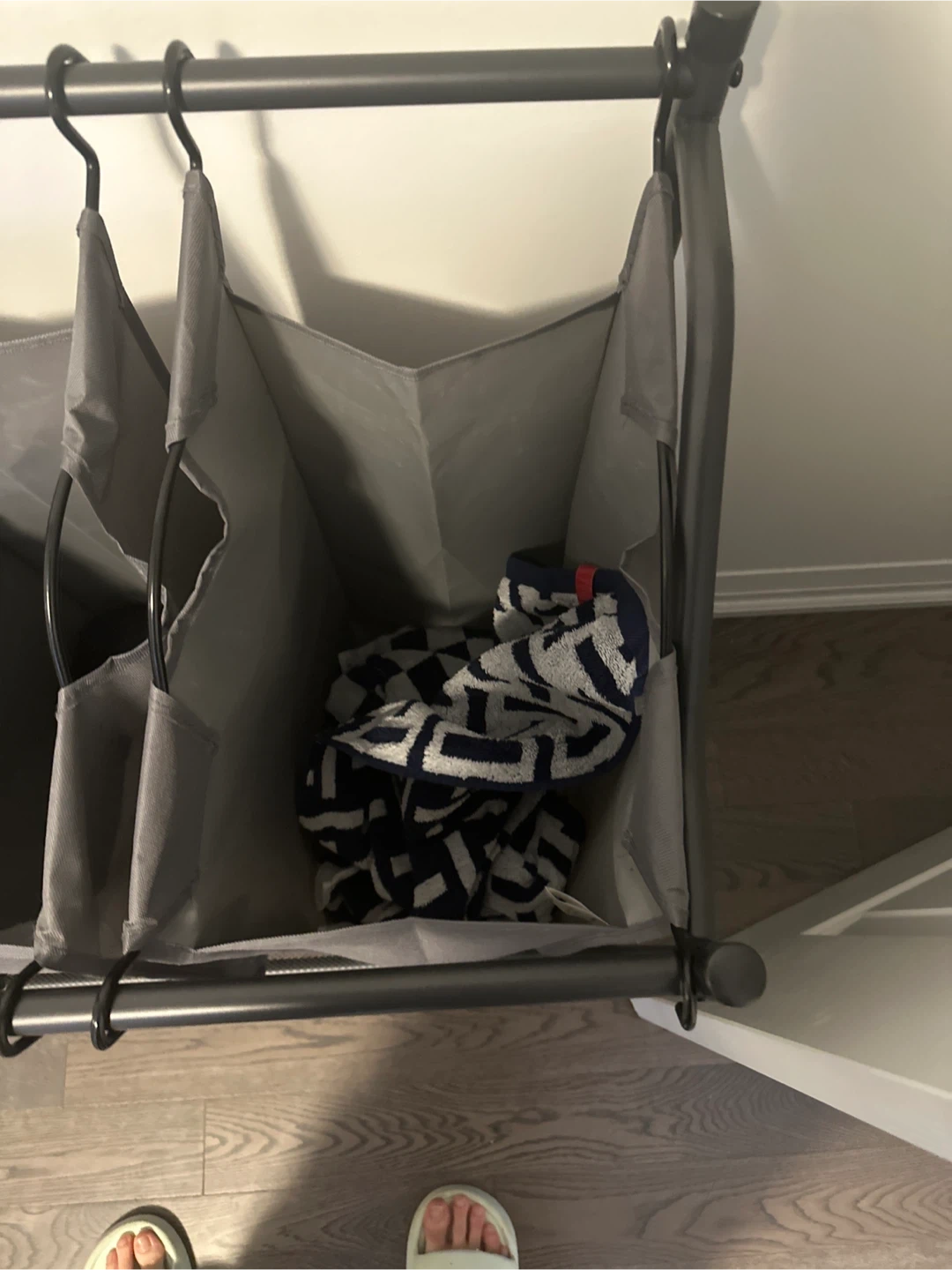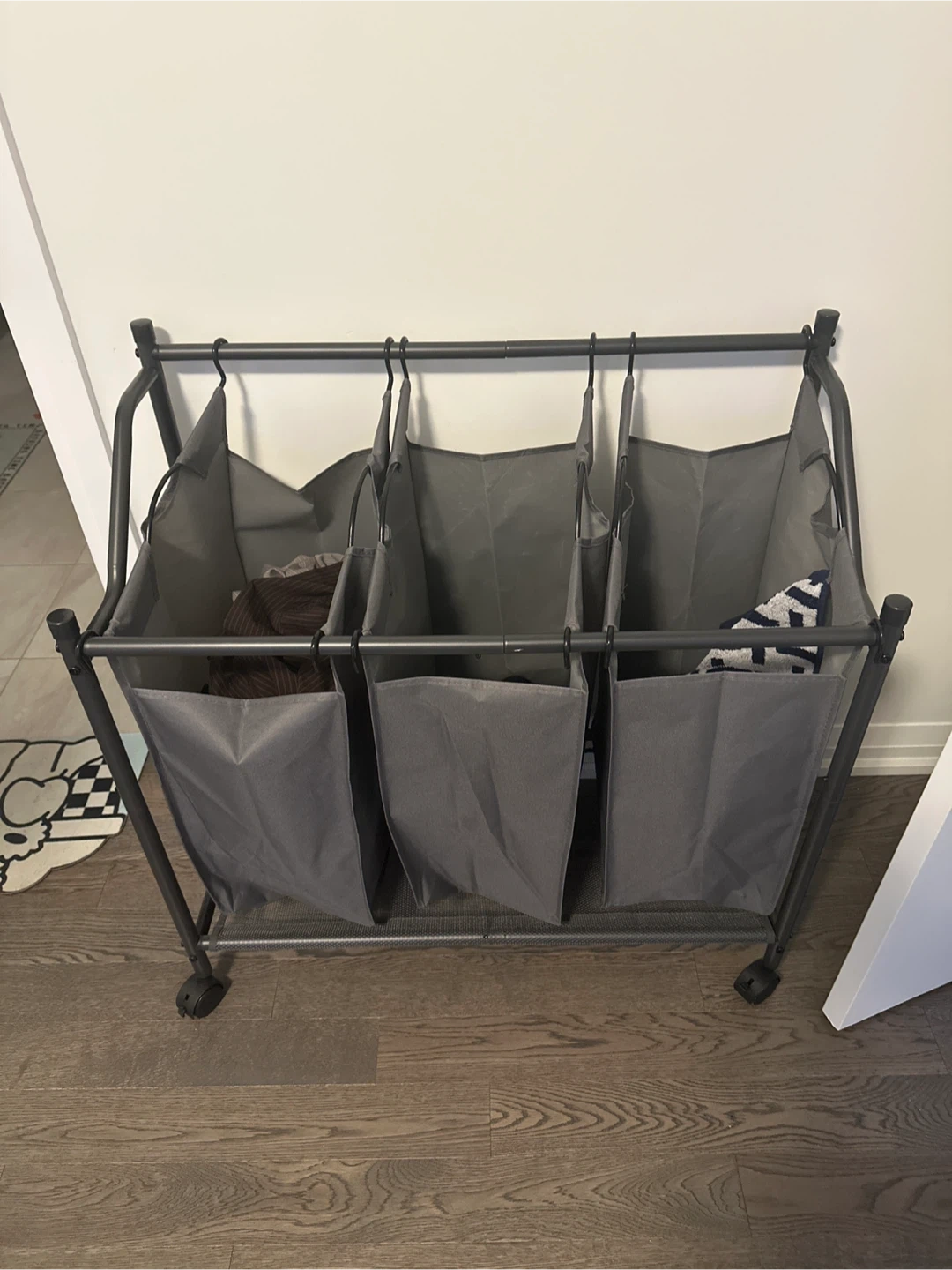 This grey laundry sorter features three separate bins for organizing your clothes. It's constructed with a metal frame and fabric bags. It rolls easily on wheels, making laundry day a breeze!