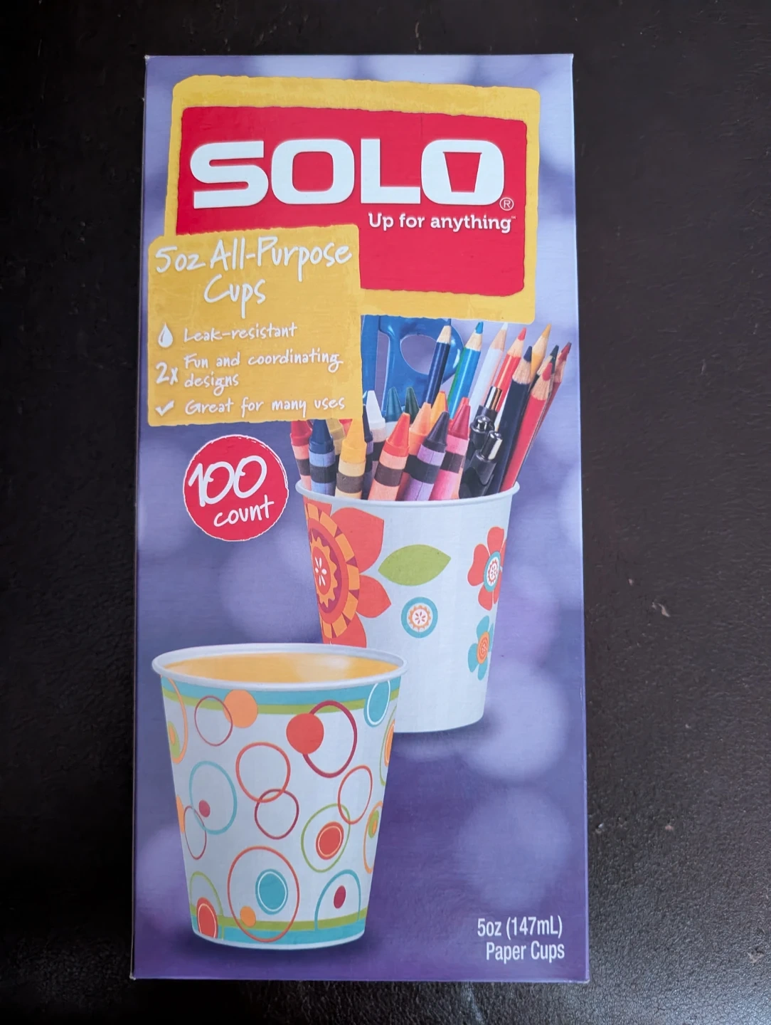 This box contains 100 SOLO 5oz paper cups. They're leak-resistant with fun and coordinating designs. Great for kids' drinks, snacks, or arts and crafts!