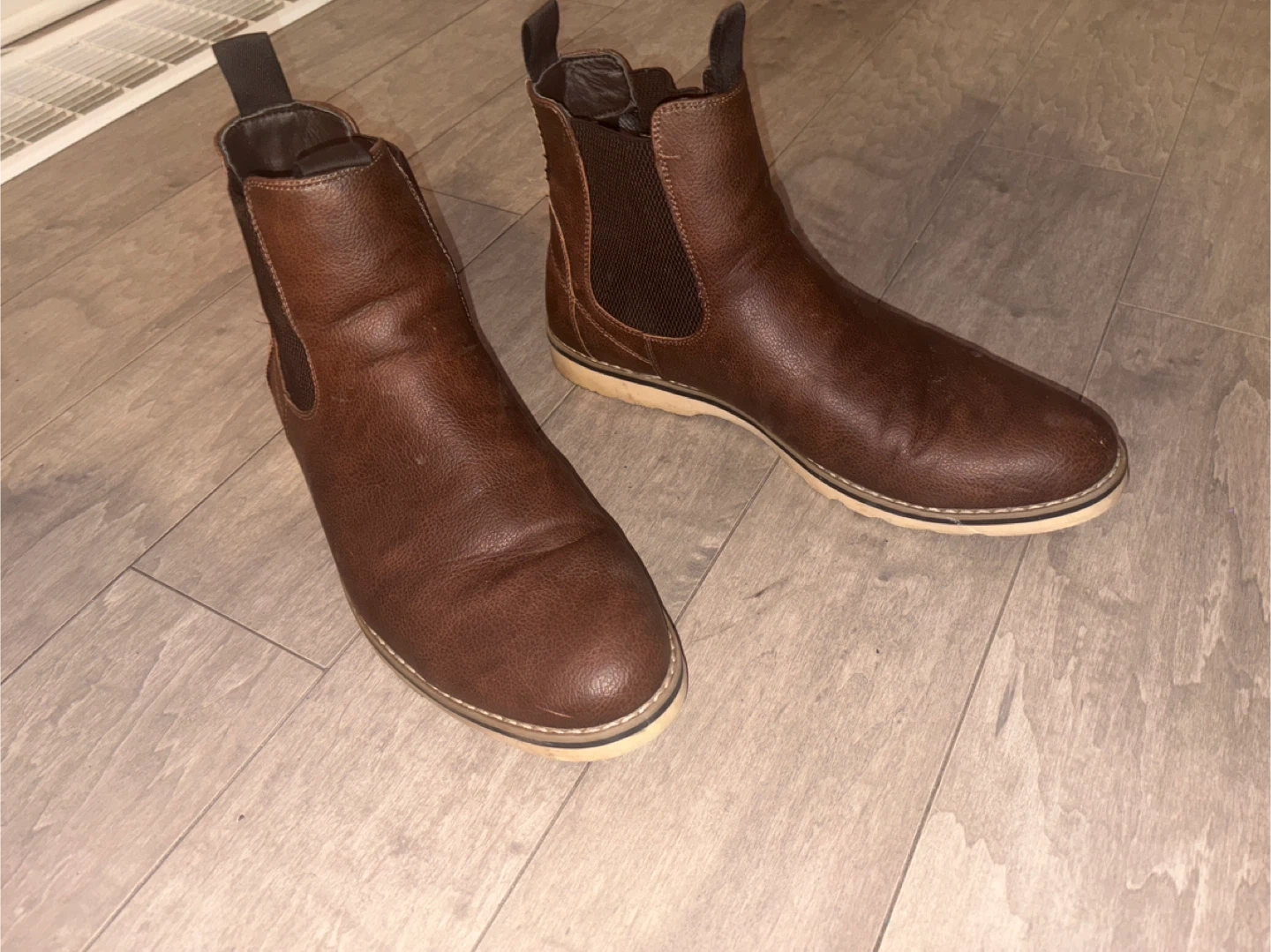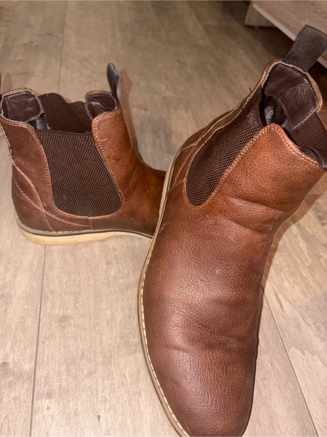 These are Steve Madden waterproof brown leather Chelsea boots. They're made with genuine leather and feature elastic side panels for an easy slip-on style. Great for rainy days!