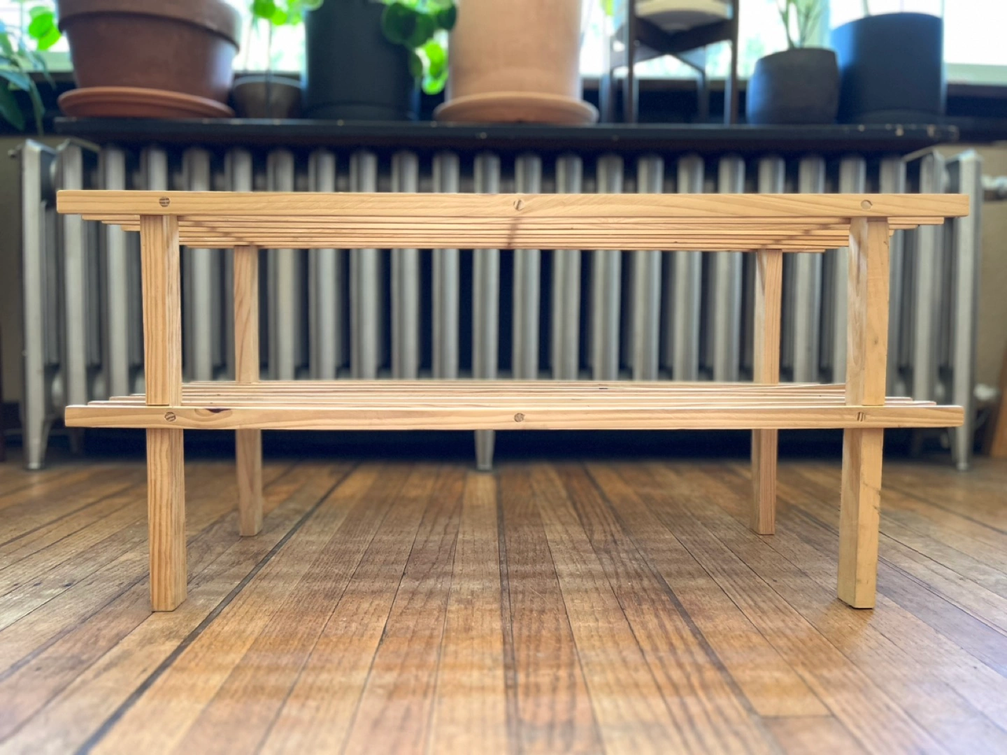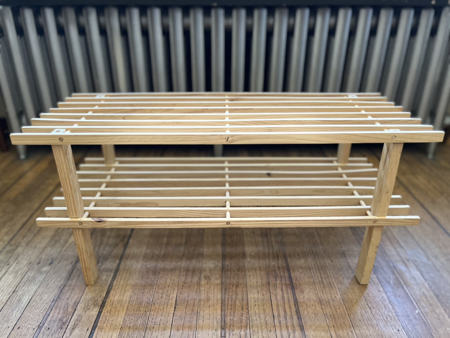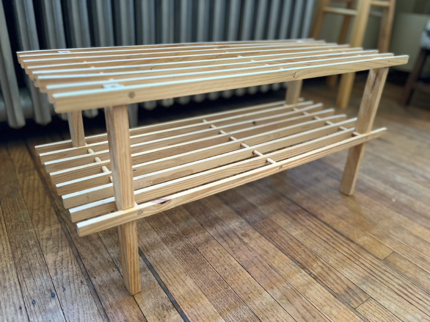 Wood slat shoe rack with two tiers.