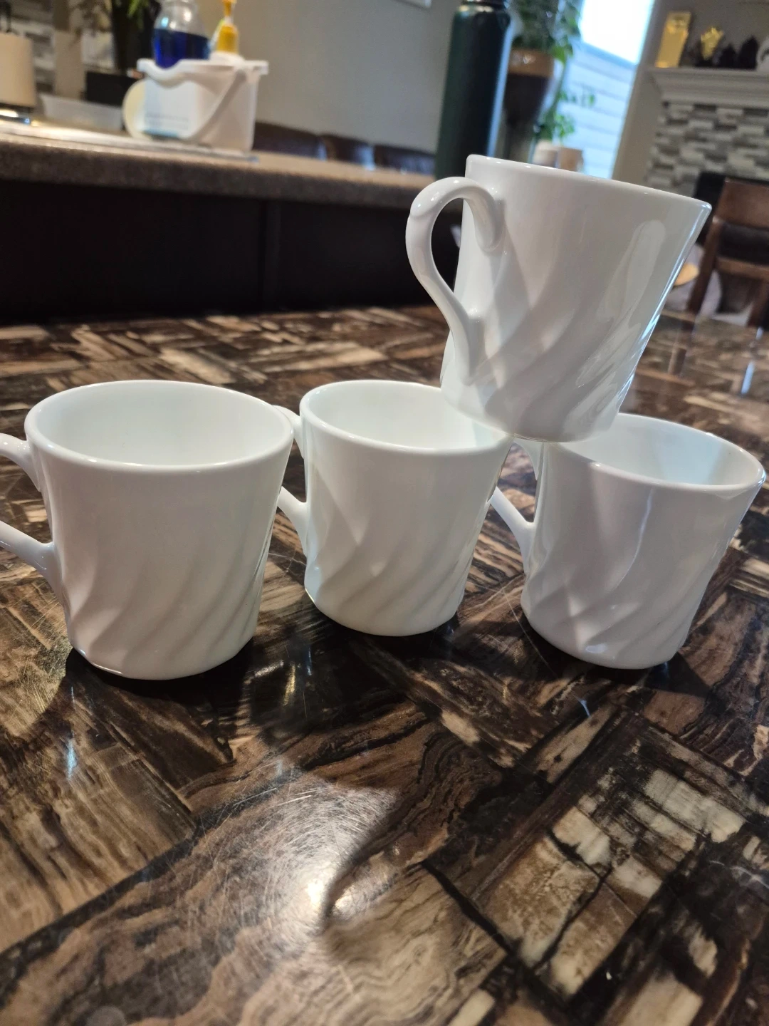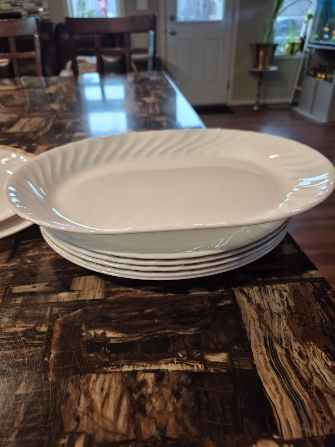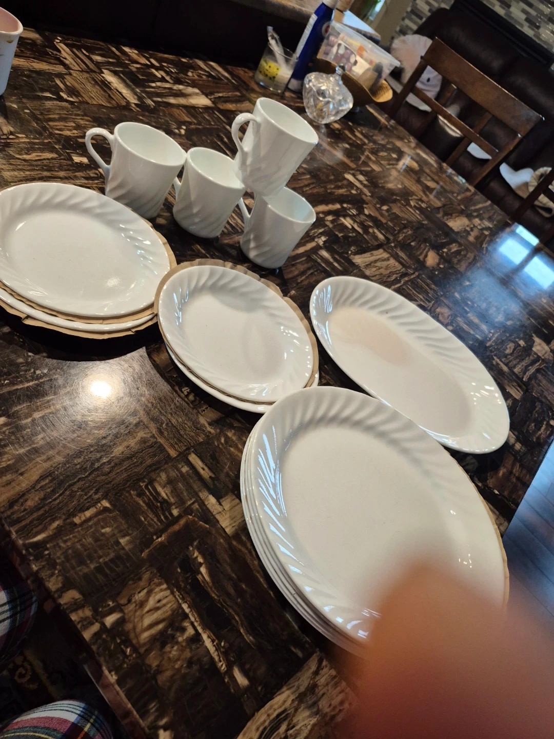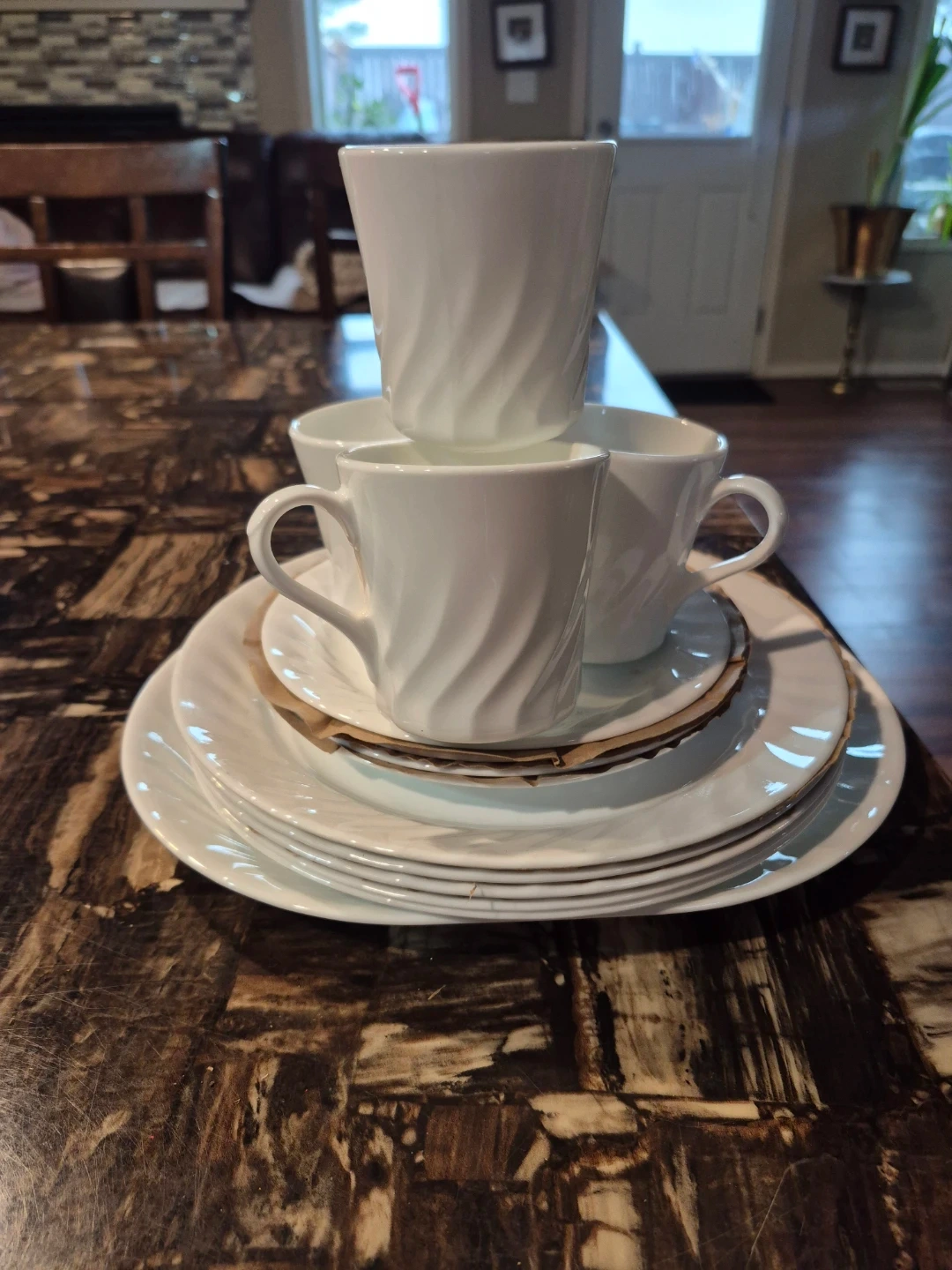 Corelle dish set that includes 5 dinner plates, 4 salad plates, 4 cups and one serving plate in excellent conditios. Total 14 pieces. Some plates are never used.