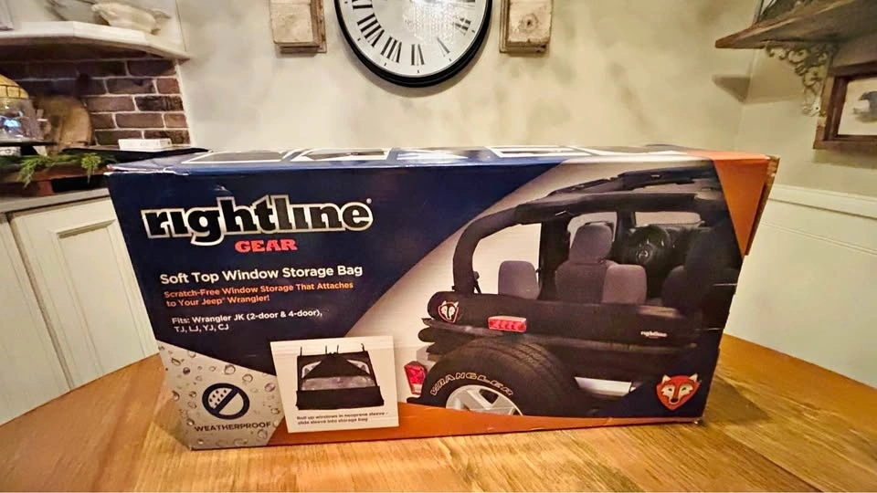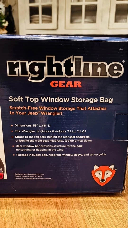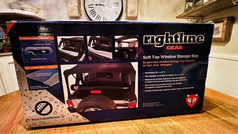 Brand new in box, still plastic wrapped from the factory and has never been used. Scratch-free window storage that attaches to your Jeep Wrangler! The Rightline Gear Soft Top Window Storage Bag holds (3) windows inside individual pockets of the neoprene window sleeve. The neoprene sleeve is nonabrasive, highly protective, water resistant, and does not pick up dirt, lint, or other debris from the ground. The sleeve is rolled up, quick release buckled tight, and slid inside the Window Storage Bag. The rear window bar provides structure for the bag, keeping it from sagging or flapping in the wind. The Soft Top Window Storage Bag is made from tough PVC Coated Mesh that is re-enforced for strength and UV protected. Dimensions: 55 L x 6.5 D. Weatherproof with welded seams and a urethane coated zipper. Fits: Wrangler JK (2-door & 4-door), TJ, LJ, YJ, CJ. Straps to the roll bars, behind the rear seat headrests, or behind the front seat headrests, top up or top down. Color: Black. Includes: bag, neoprene window sleeve, and set up guide.