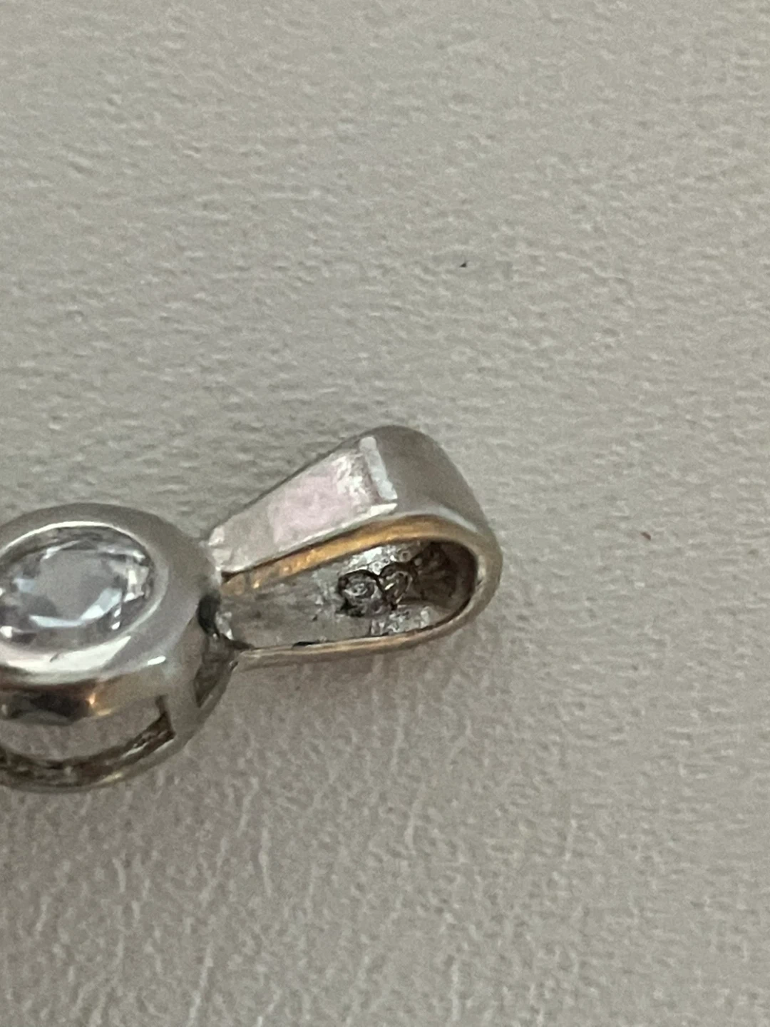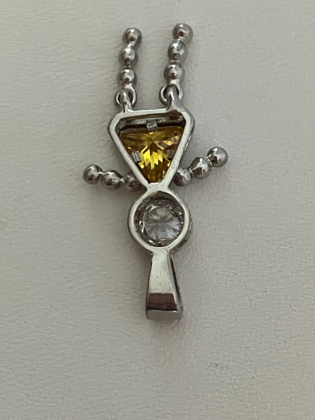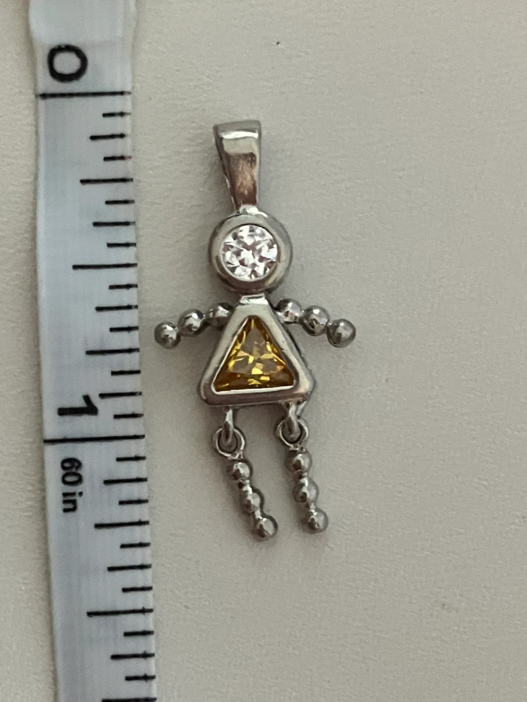 A cute silver pendant shaped like a child. It features a clear cubic zirconia in the head and a citrine stone in the torso. The bail is stamped with '925'.