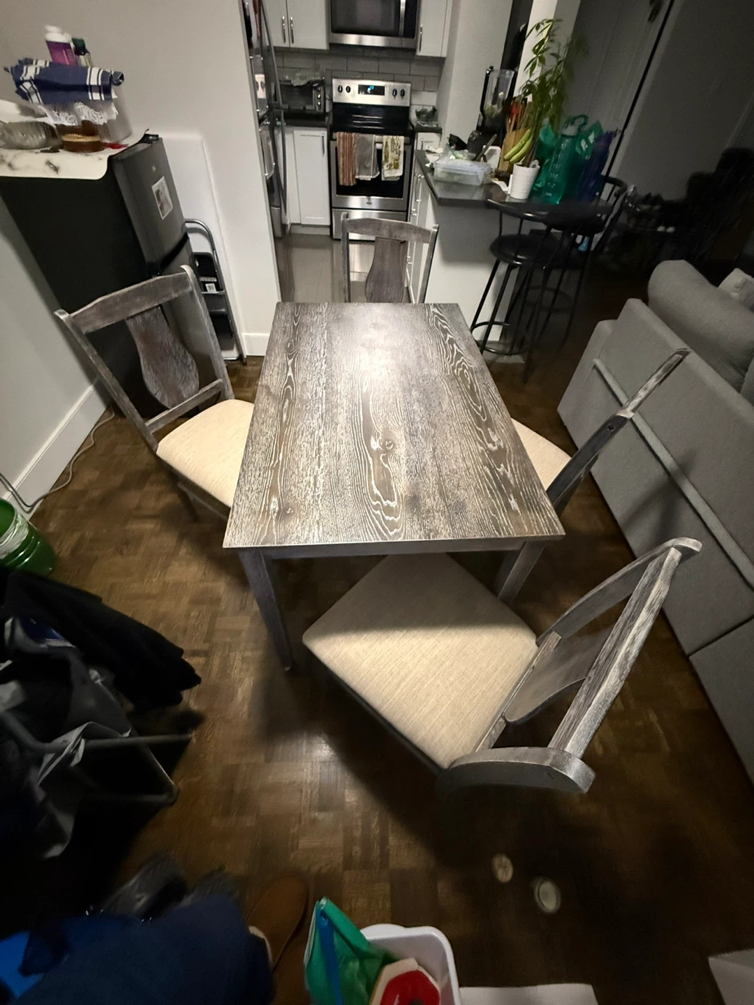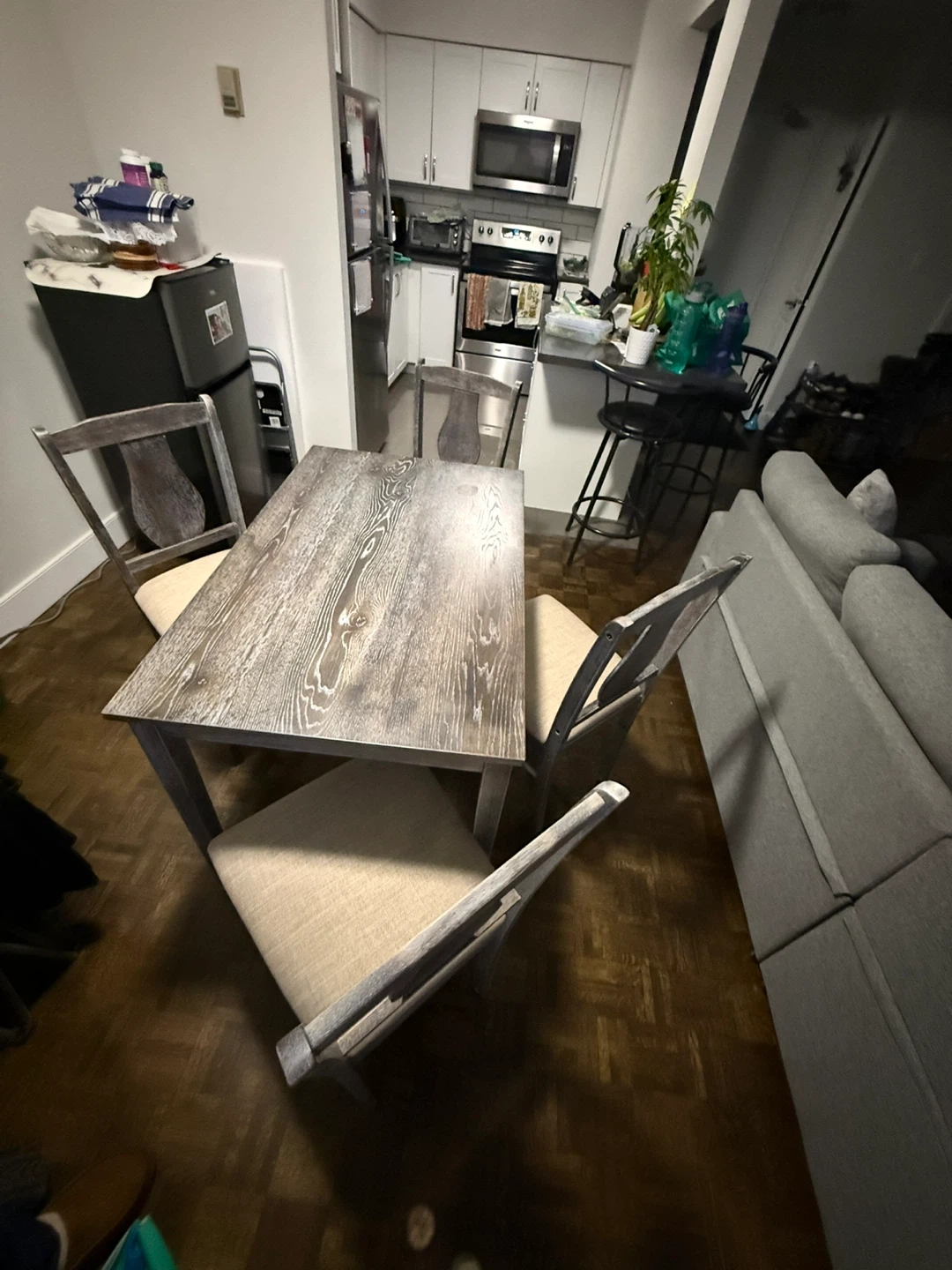 A four-piece dining set featuring a rectangular distressed wood table and four upholstered chairs. Chairs have light beige fabric seats and backs with a grey wash wood frame. Perfect for a small dining area or kitchen nook!