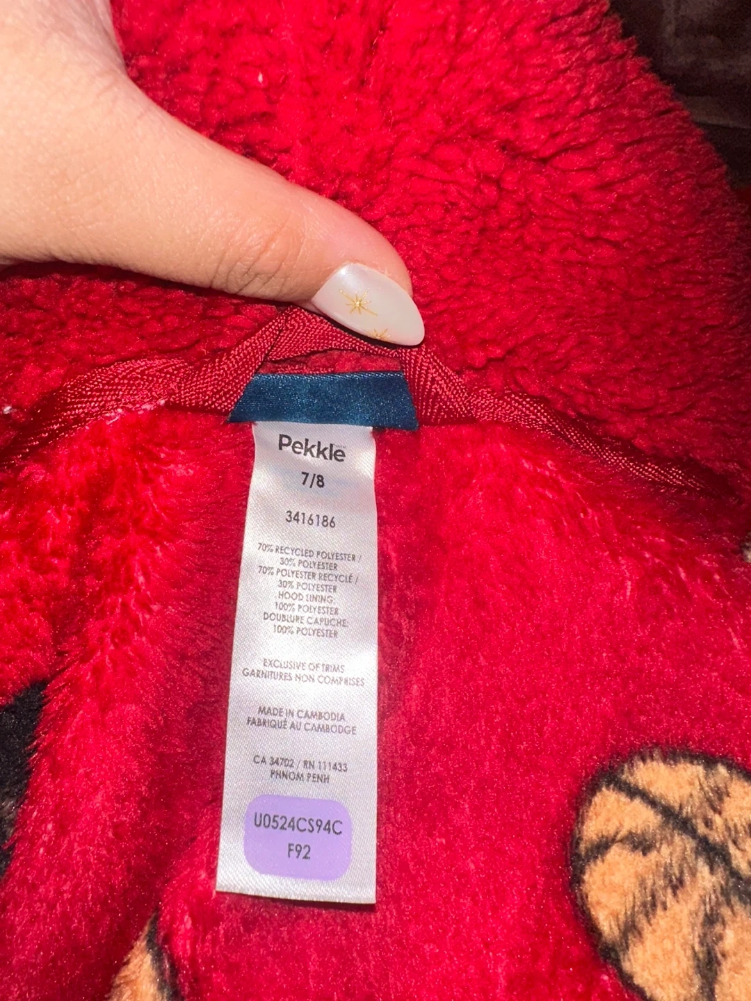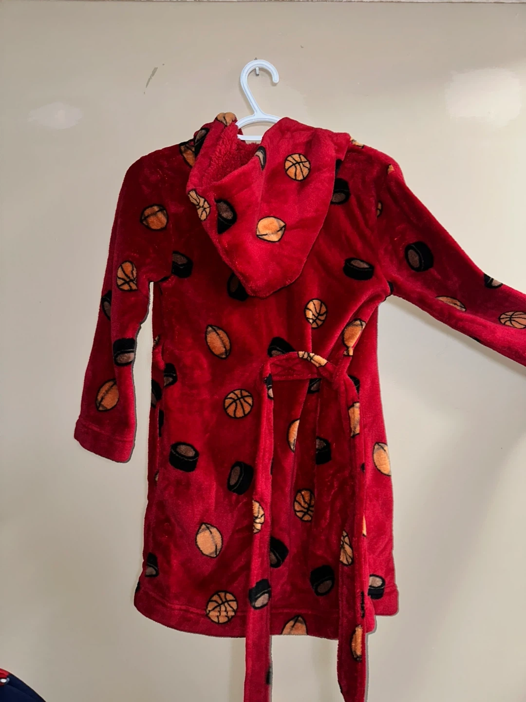 Kids' red plush robe with a sports theme featuring basketballs, footballs, and hockey pucks. It's made from 100% polyester for cozy comfort. This robe would be great for lounging around the house after a bath or on a chilly morning!