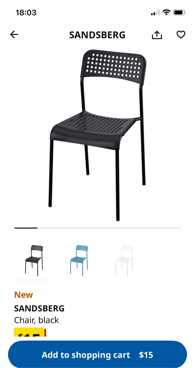 This is an IKEA SANDSBERG chair in black. It's made of durable plastic and features a perforated seat and back. Perfect for adding seating to an office or dining area.