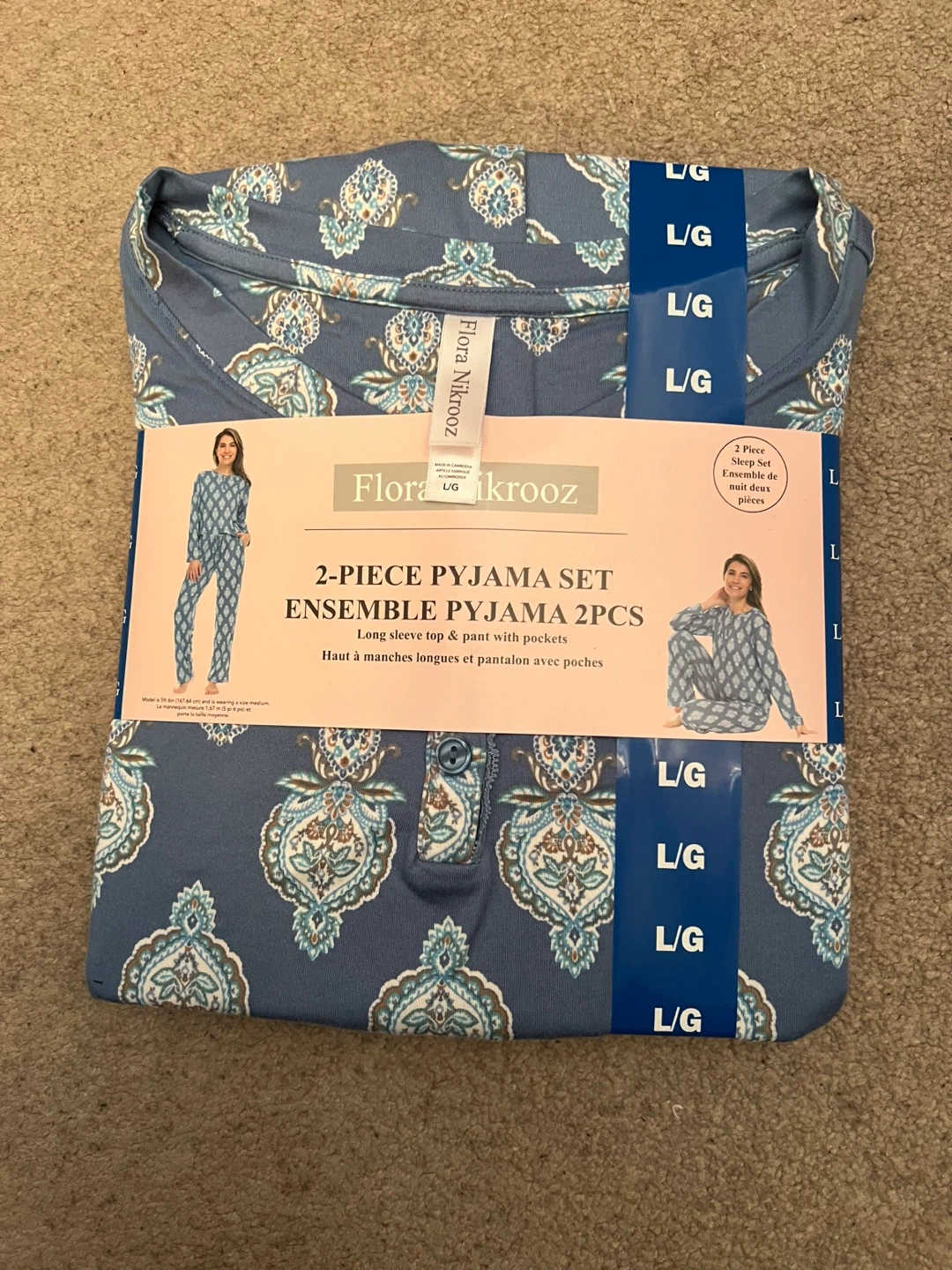 Flora Nikrooz two-piece pyjama set with a long sleeve top and pants with pockets. Made from 95% recycled polyester and 5% elastane. Machine wash cold separately on gentle cycle. Tumble dry low. Promptly cool when needed.