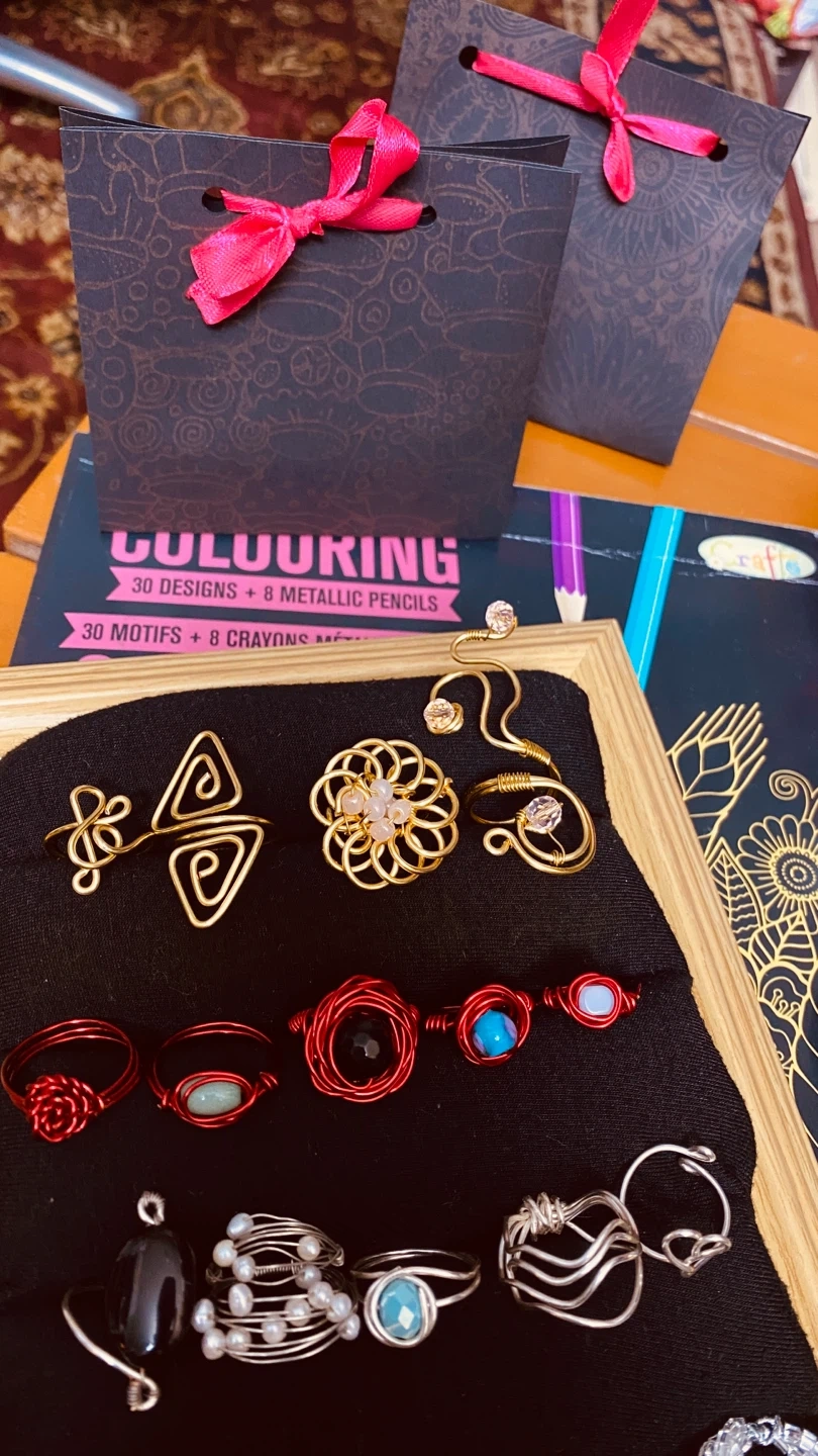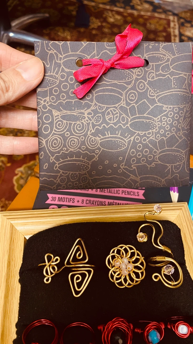 A collection of unique wire-wrapped rings in various colours and designs. It also includes a set of metallic pencils for creative projects. This set would be fun for an artist or crafter!