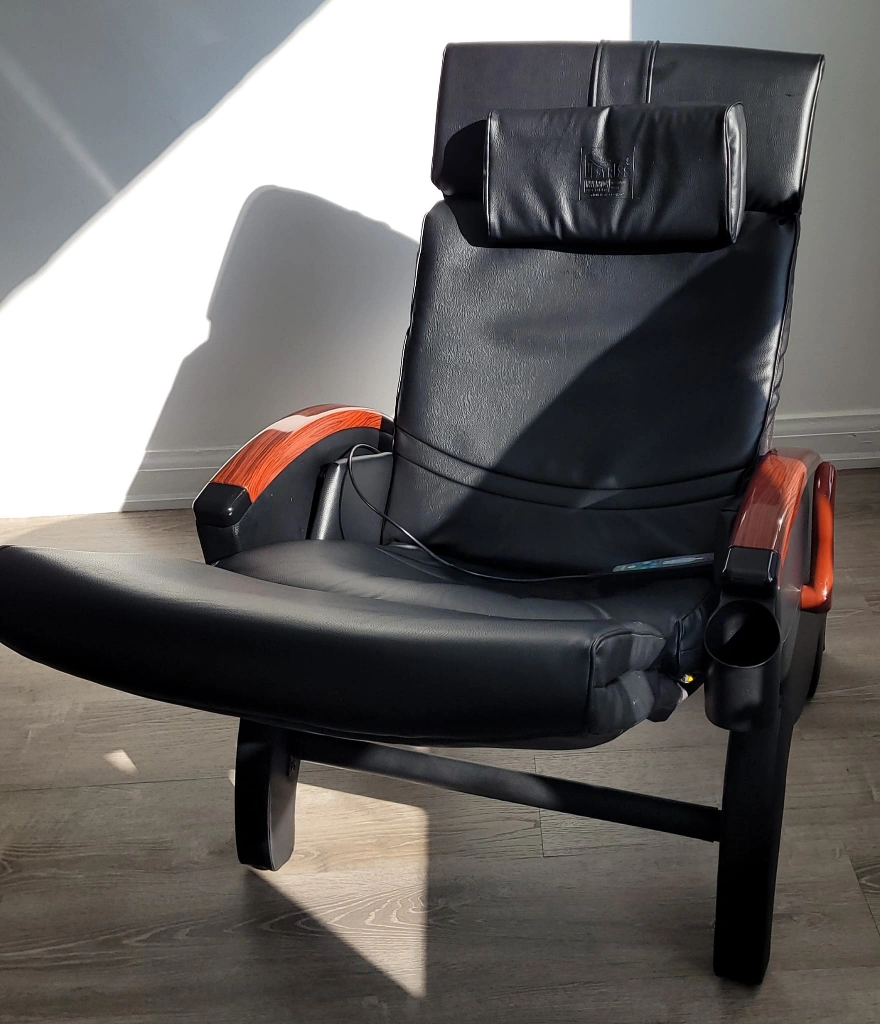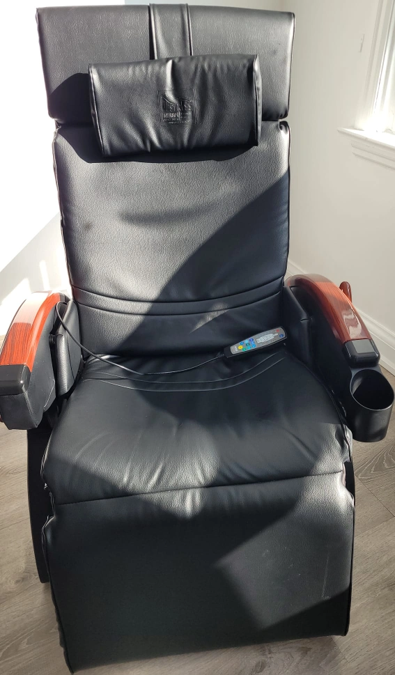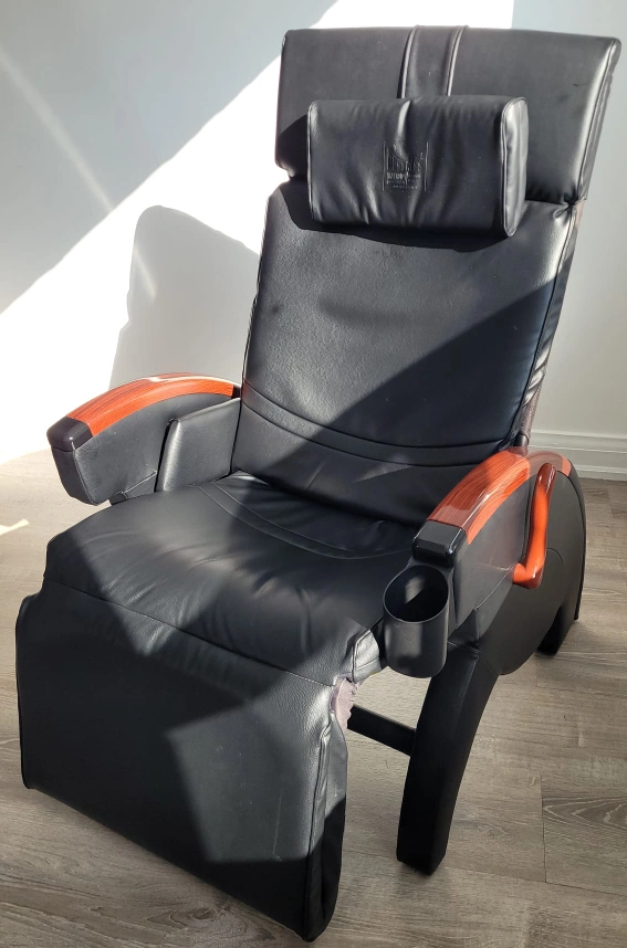 Black leather Inada massage chair with wood accents. It reclines and includes a footrest. The chair has a built-in cup holder. It's great for relaxation.