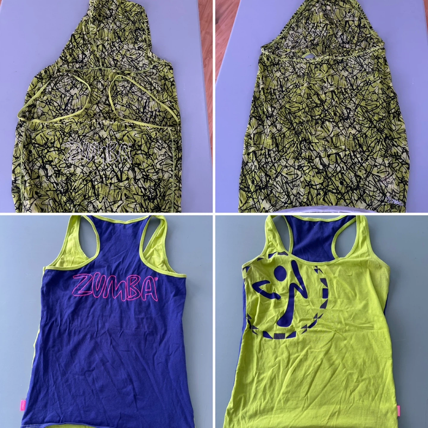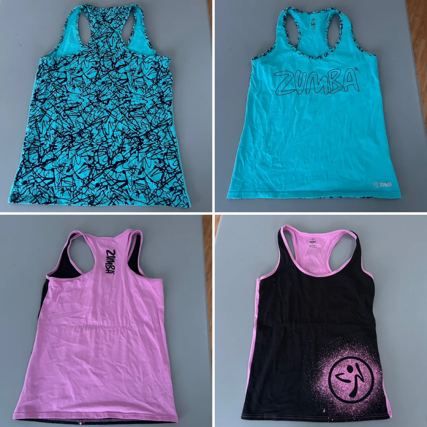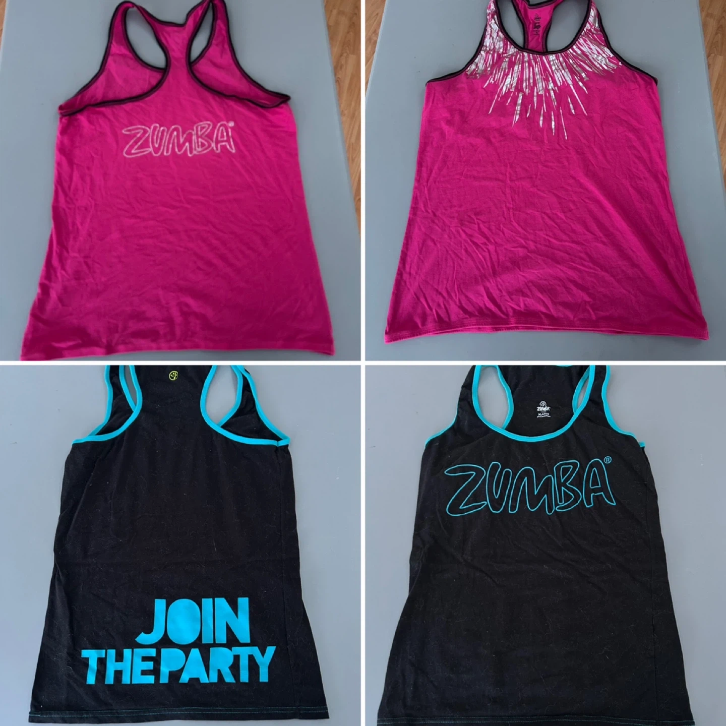 Bundle of various Zumba tank tops for your workouts. Includes multiple colours and styles, perfect for fitness enthusiasts. Made for active wear.