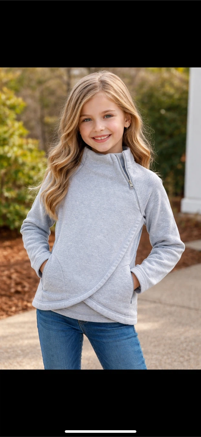 Cozy light purple fleece pullover for girls. It features a mock neck with a diagonal zipper closure and a crossover front hem. This soft sweatshirt has long sleeves and side pockets. It's made of polyester material.