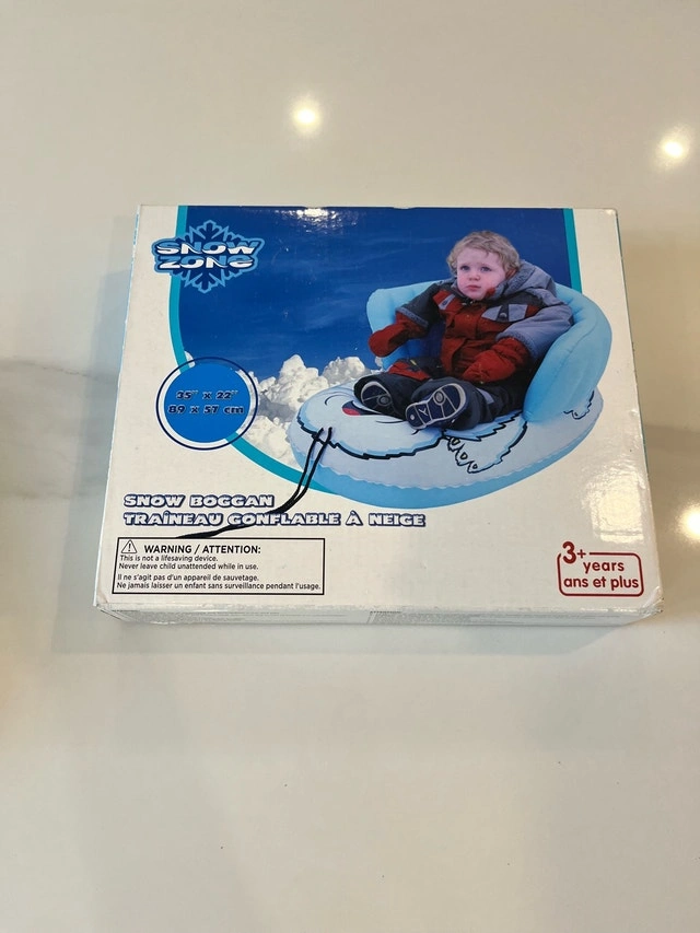 New Snow Zone Snow Boggan, perfect for winter fun! This inflatable snow sled is designed for children aged 3 years and up, offering a safe and enjoyable ride down snowy hills. The boggan measures 35" x 22". Key Features: Inflatable design for comfortable and cushioned rides. Suitable for children ages 3+. Size: 25 x 22 inches. Cash accepted.