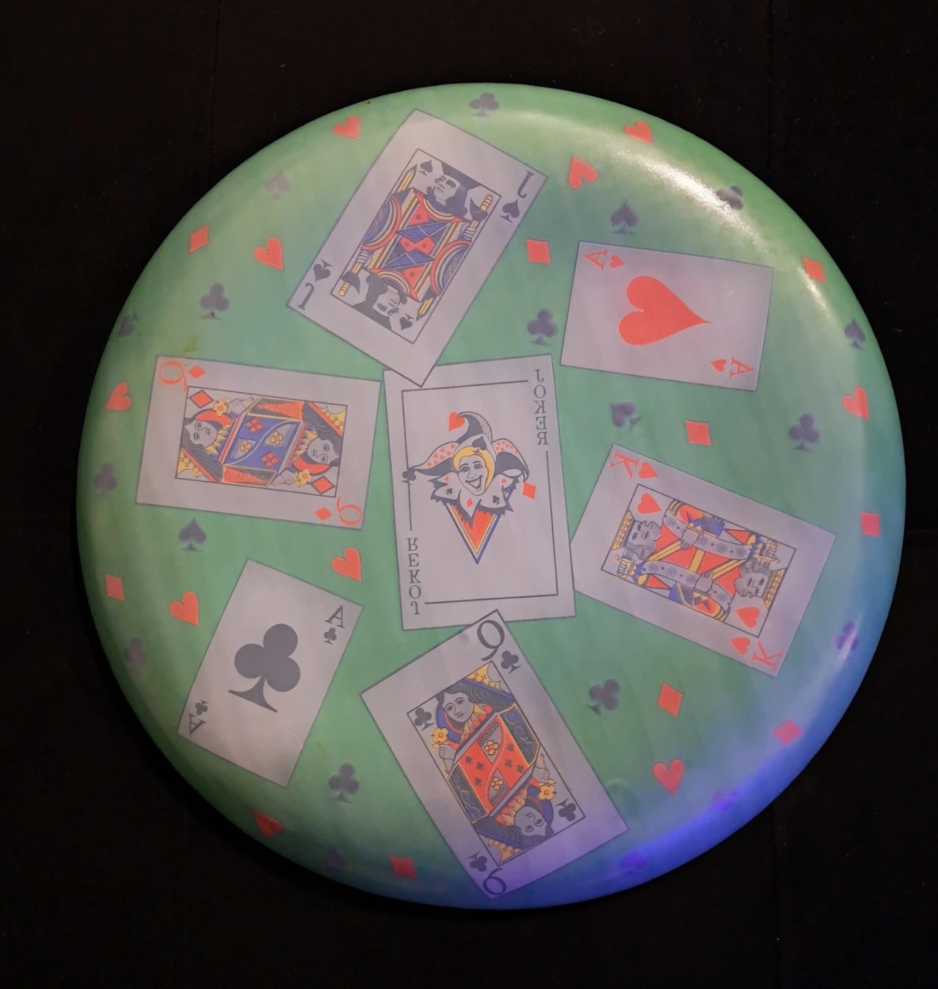 This vintage originally made in france round serving tray features a green background with a repeating pattern of playing card suits. It has various playing cards, including Jokers, Kings, Queens, and Aces, printed on its surface. This tray's design makes it a fun addition to game nights or for serving snacks.