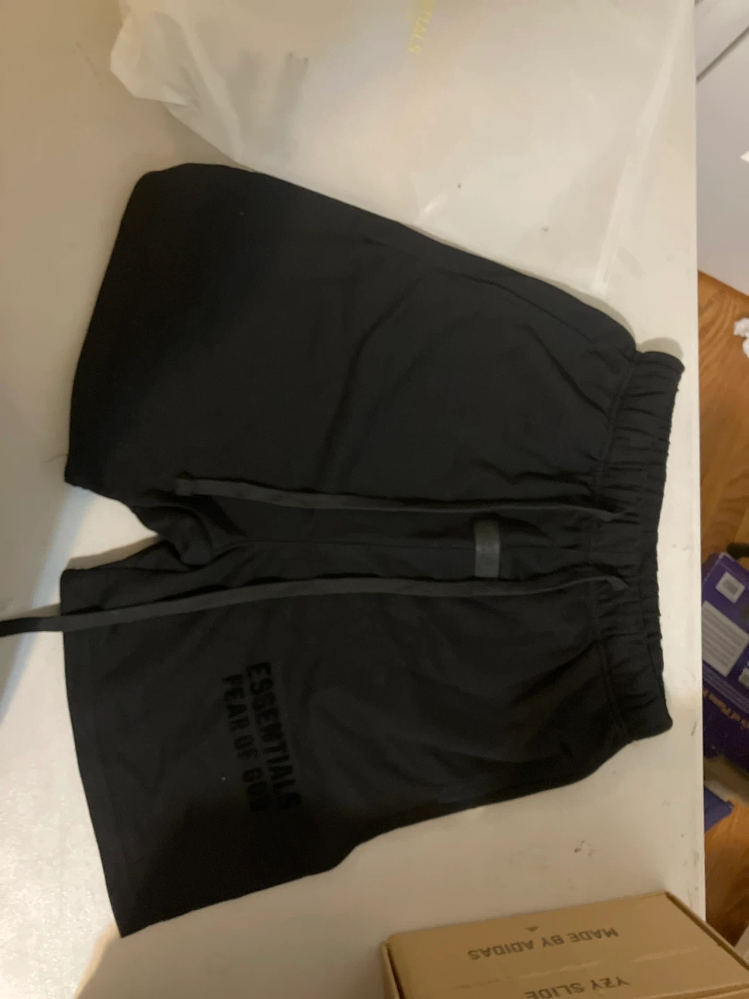 Black Essentials-style shorts in size small. These are replicas and not top-tier quality, but still decent for everyday wear. Made from a cotton & polyester blend, so they’re comfortable and lightweight.