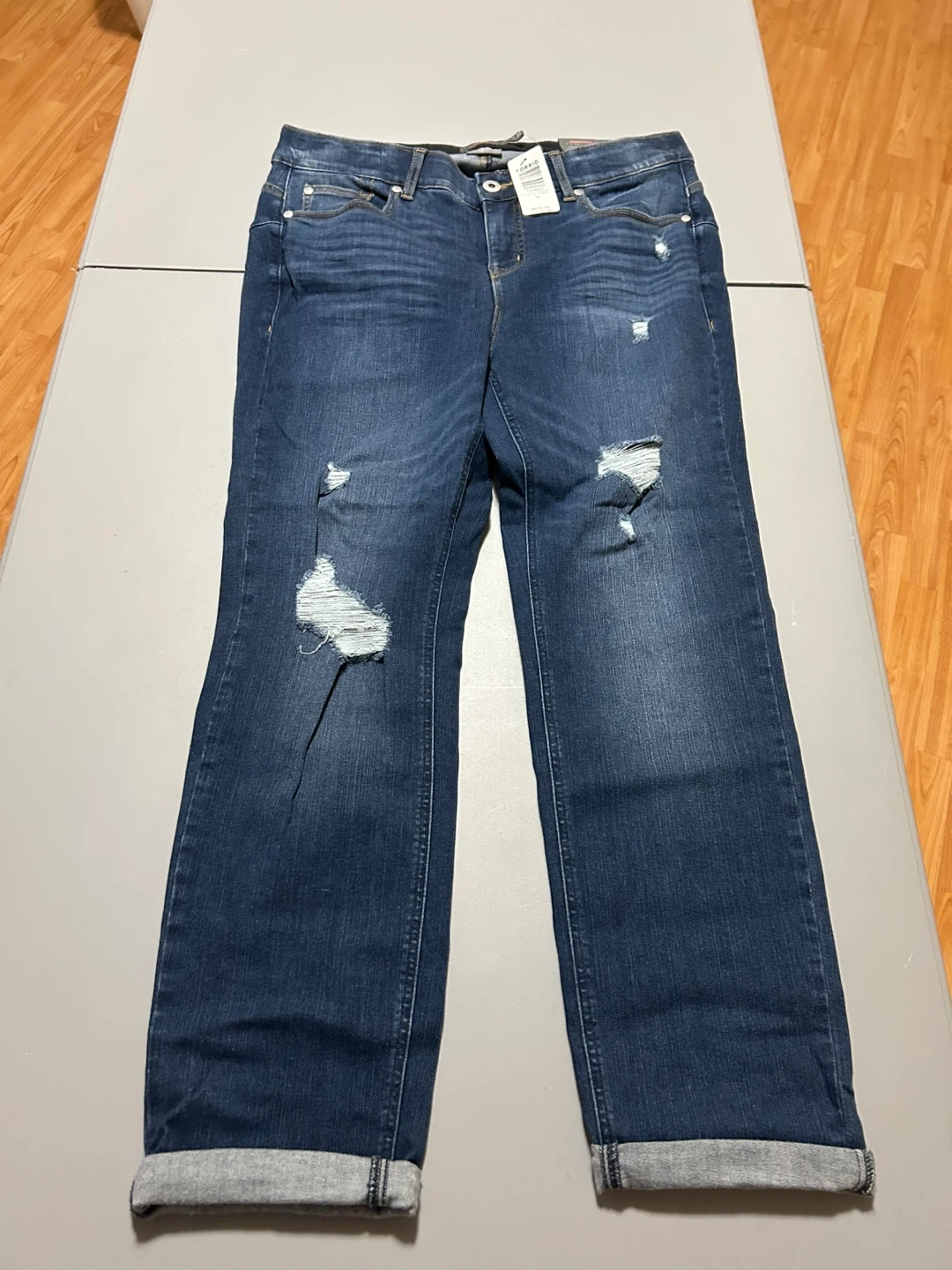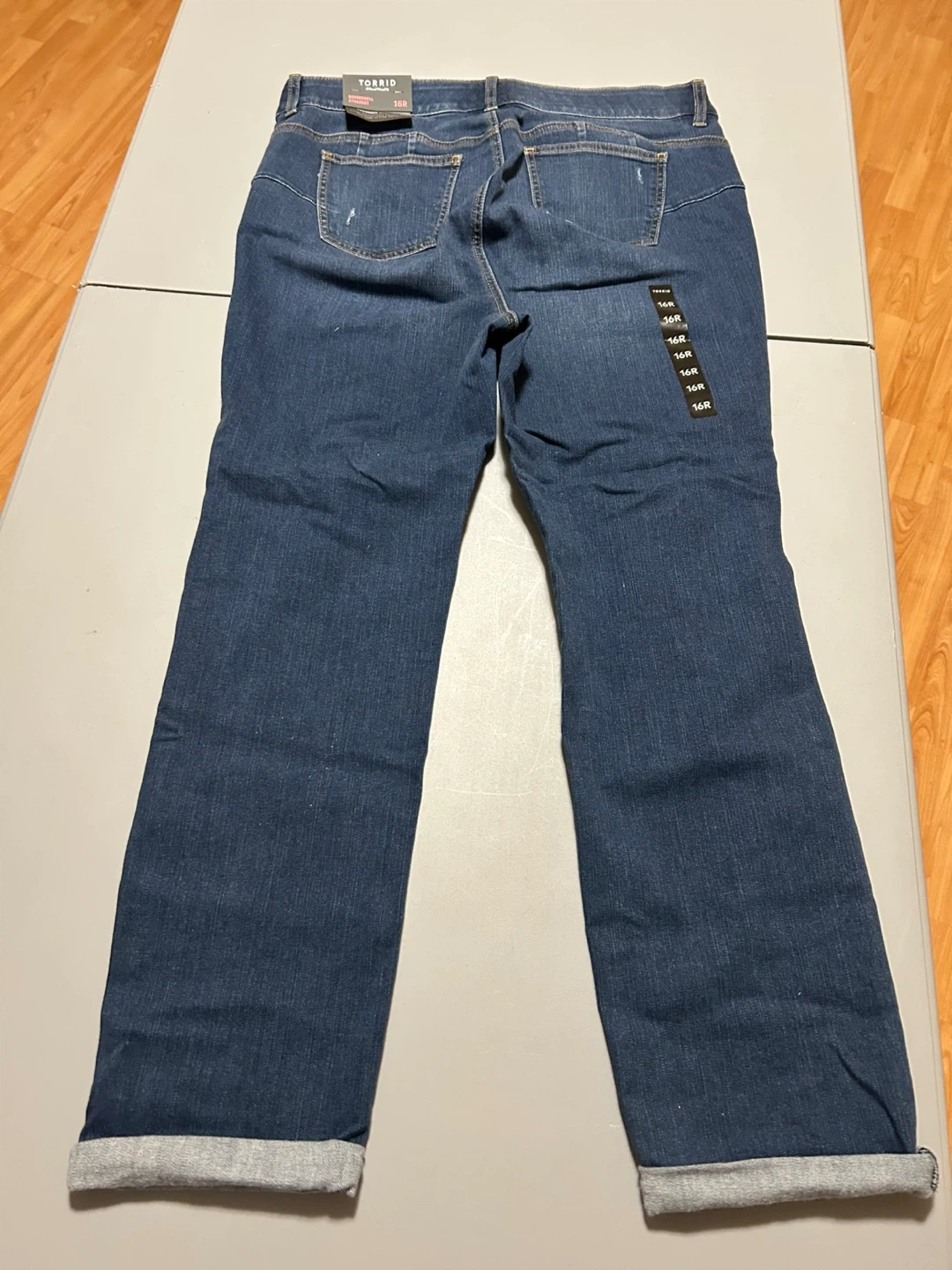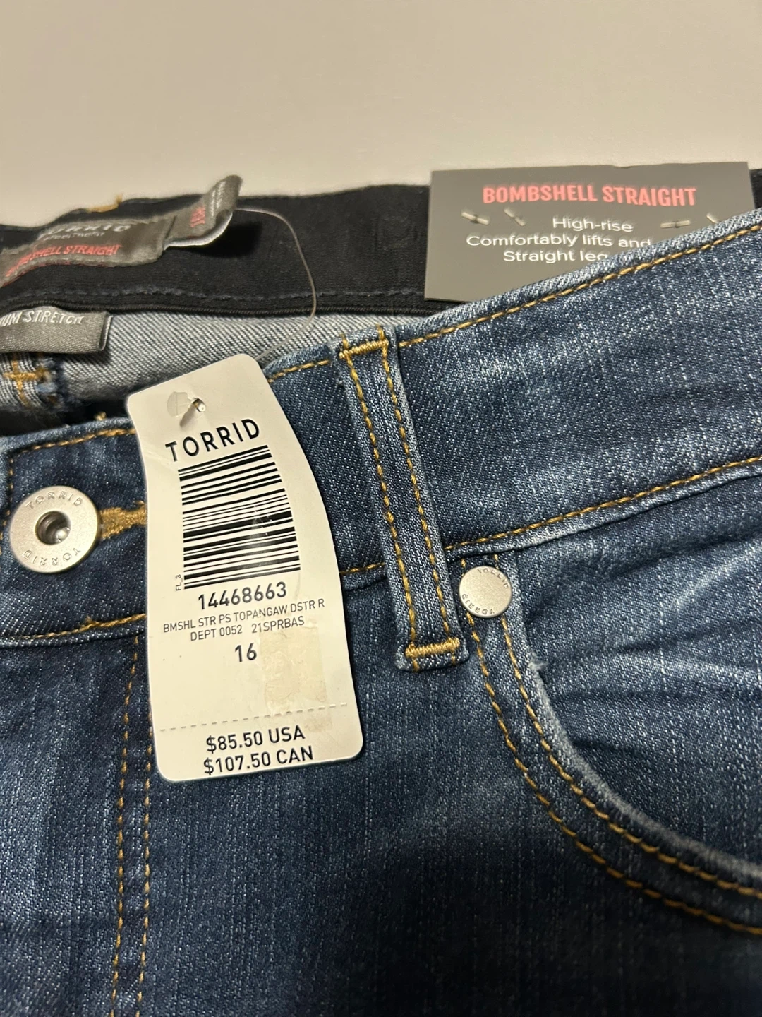 Brand new with tags. These Torrid Bombshell Straight jeans are a size 16. They feature a high-rise fit and distressed detailing. Made with stretch denim for comfort.