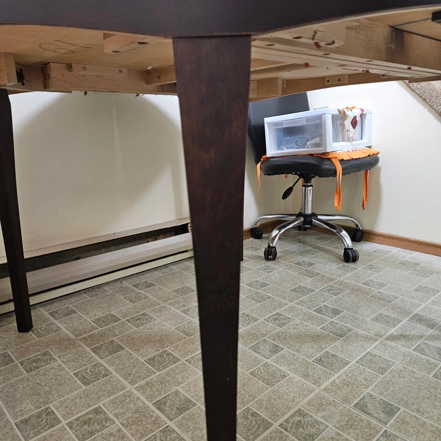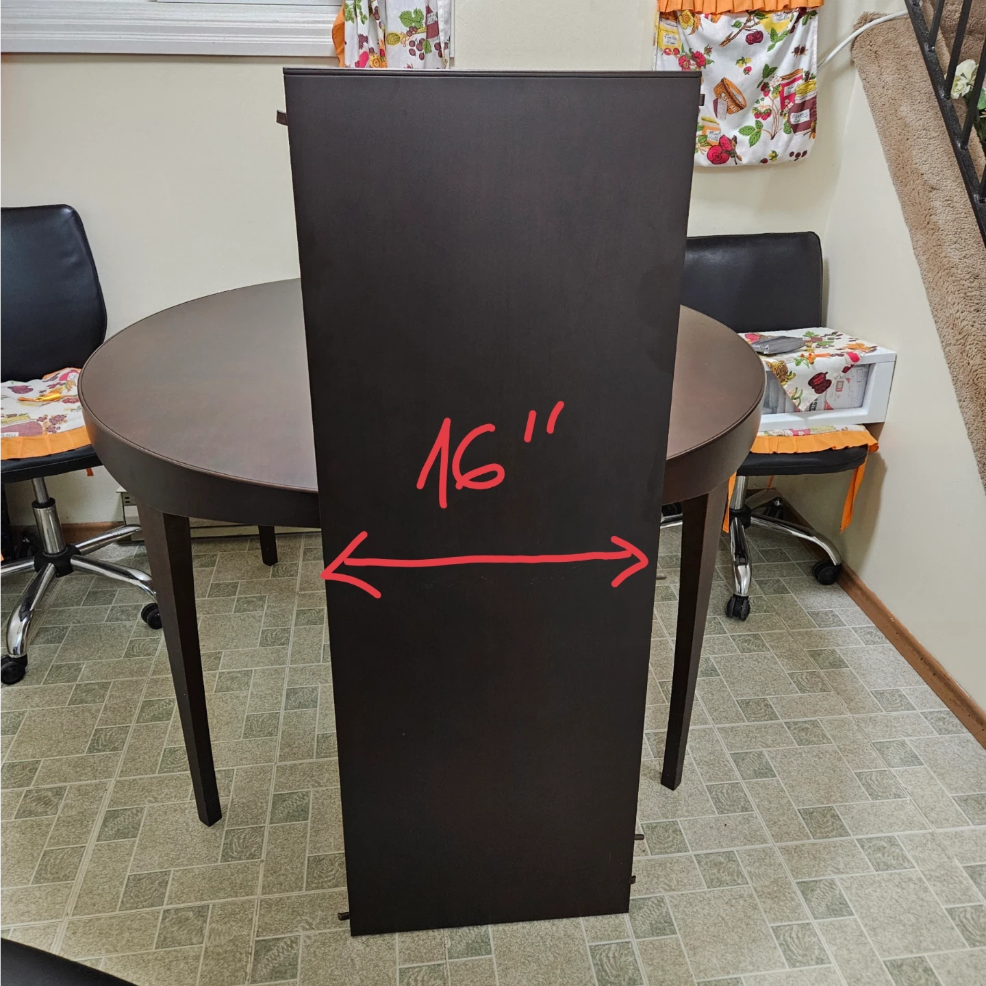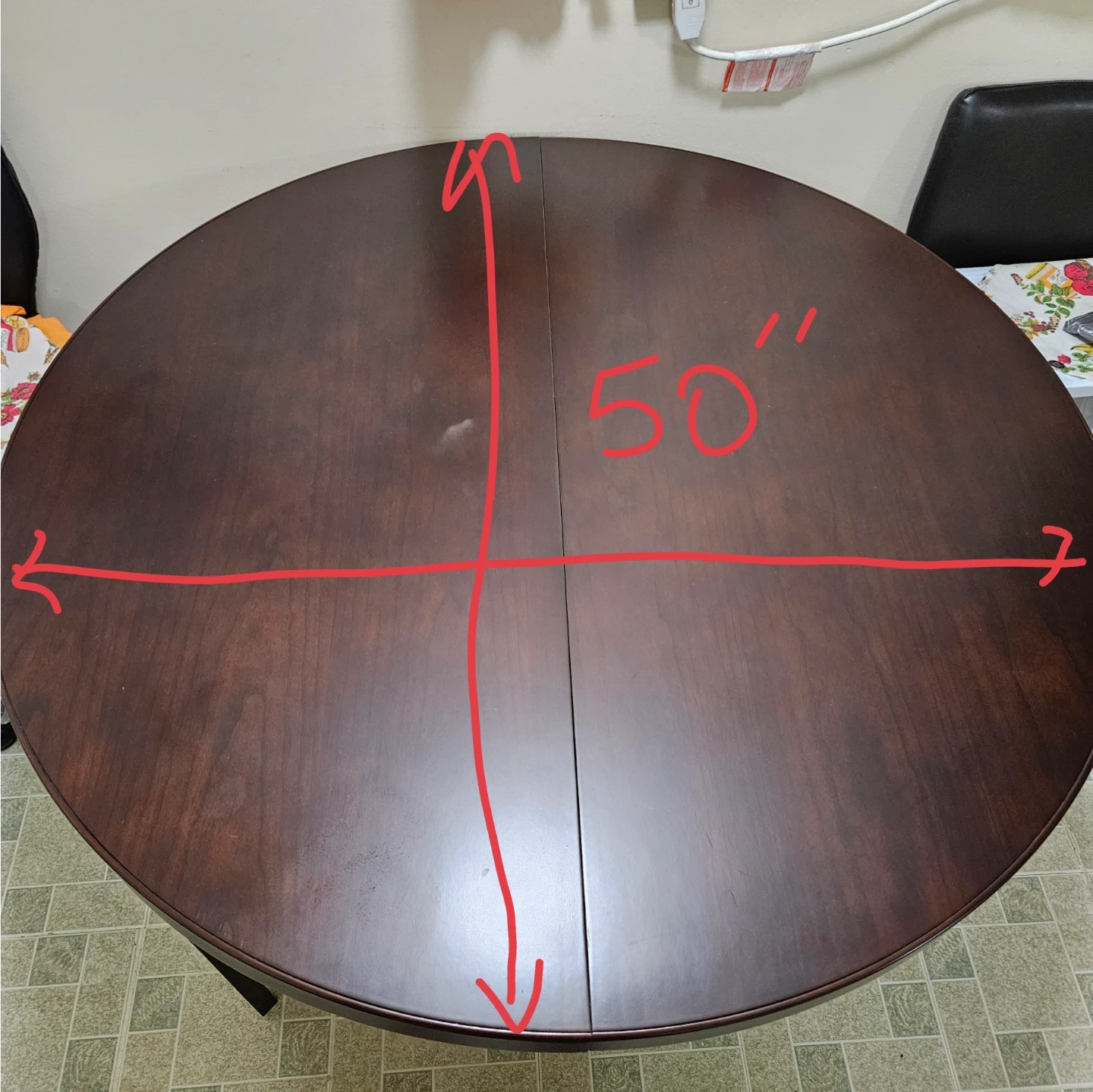 This dark wood dining table is round with an extension leaf. It measures 50 inches in diameter when fully extended and 16 inches for the leaf. Constructed from wood.