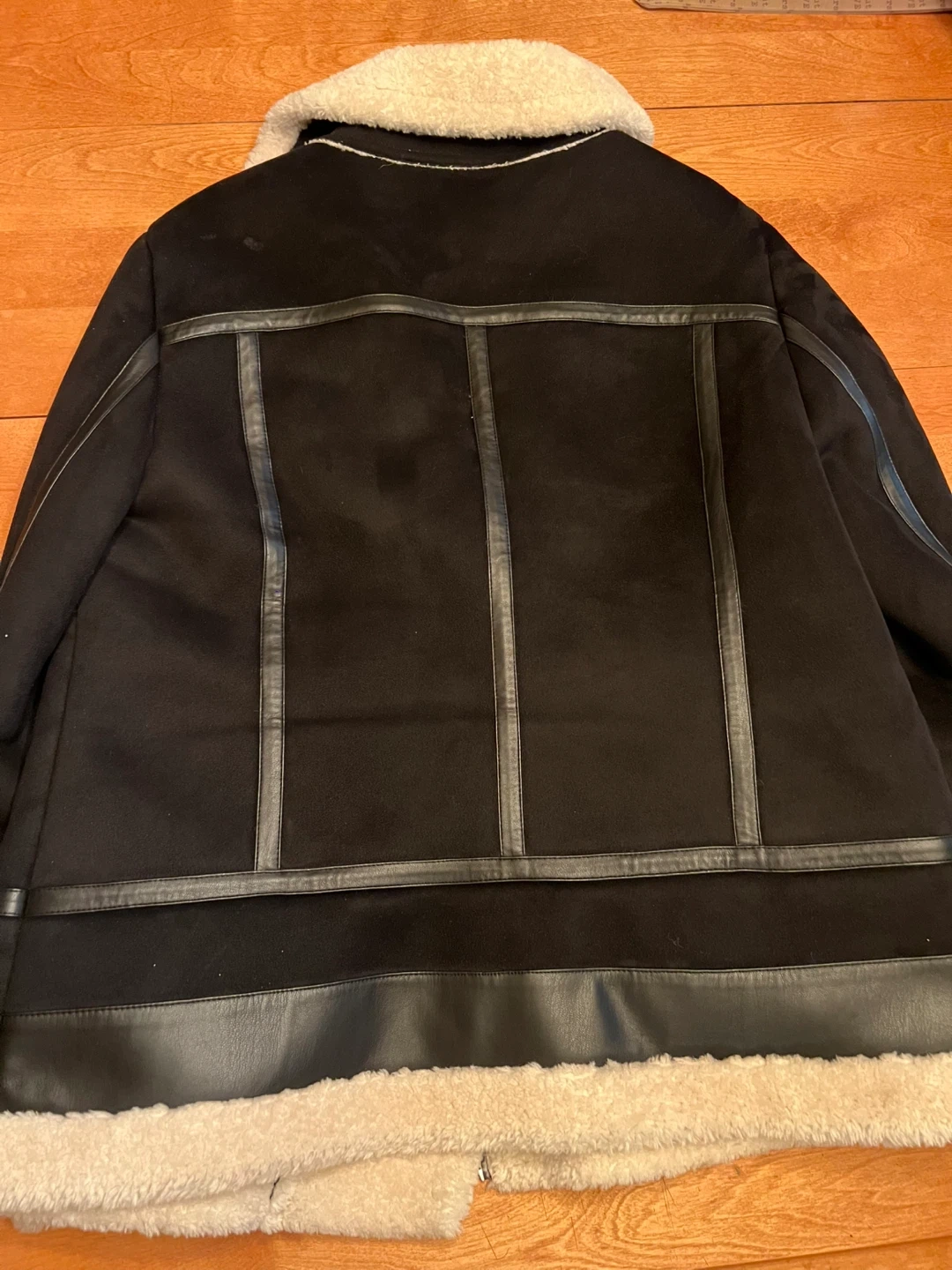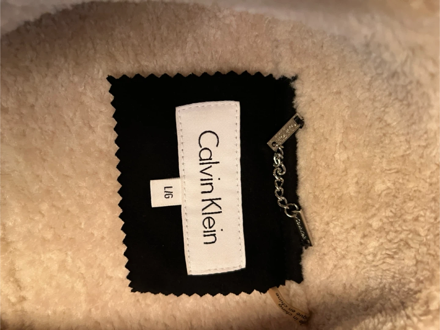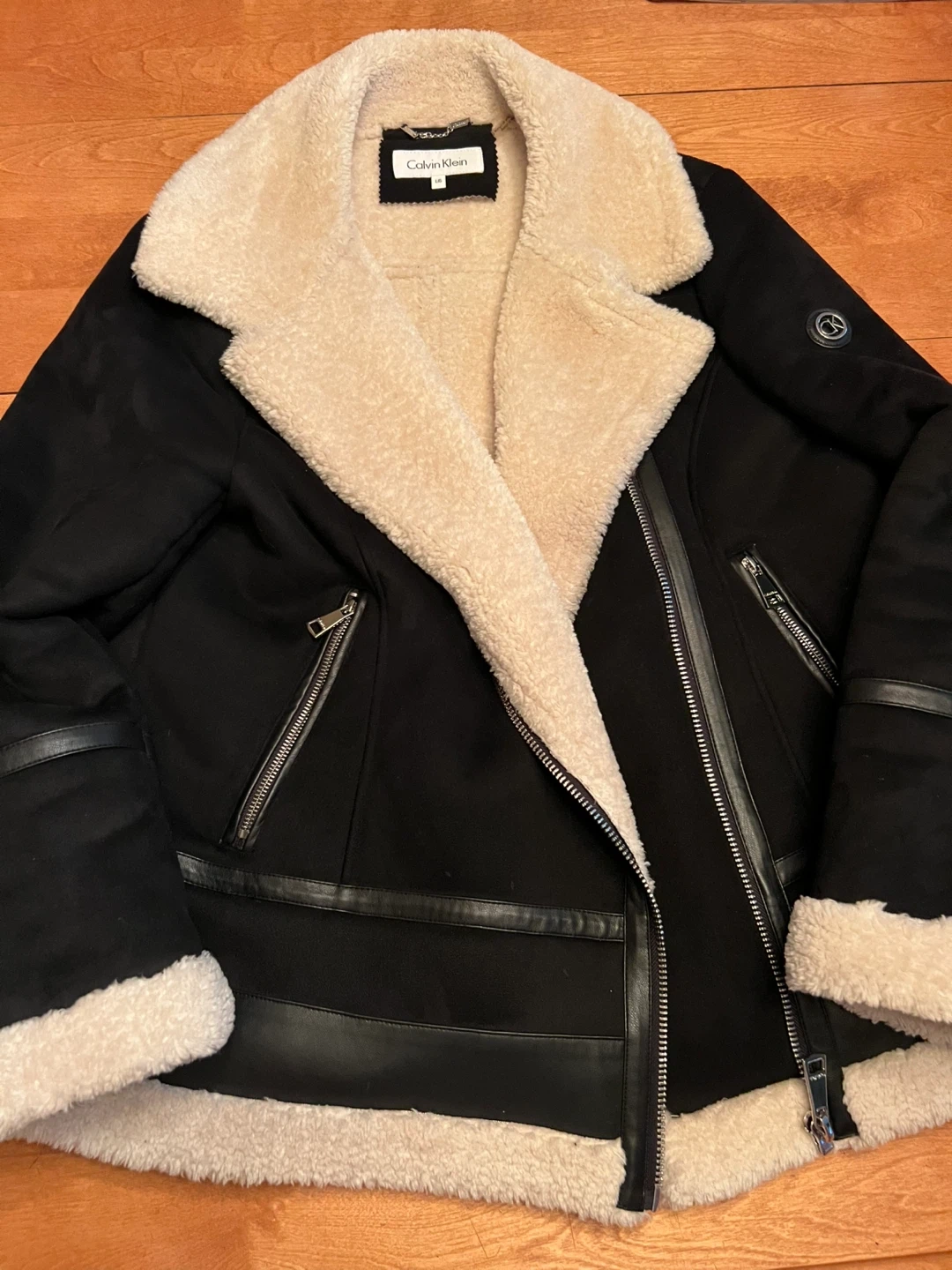 Calvin Klein jacket with a black suede-like exterior and cozy sherpa lining.
