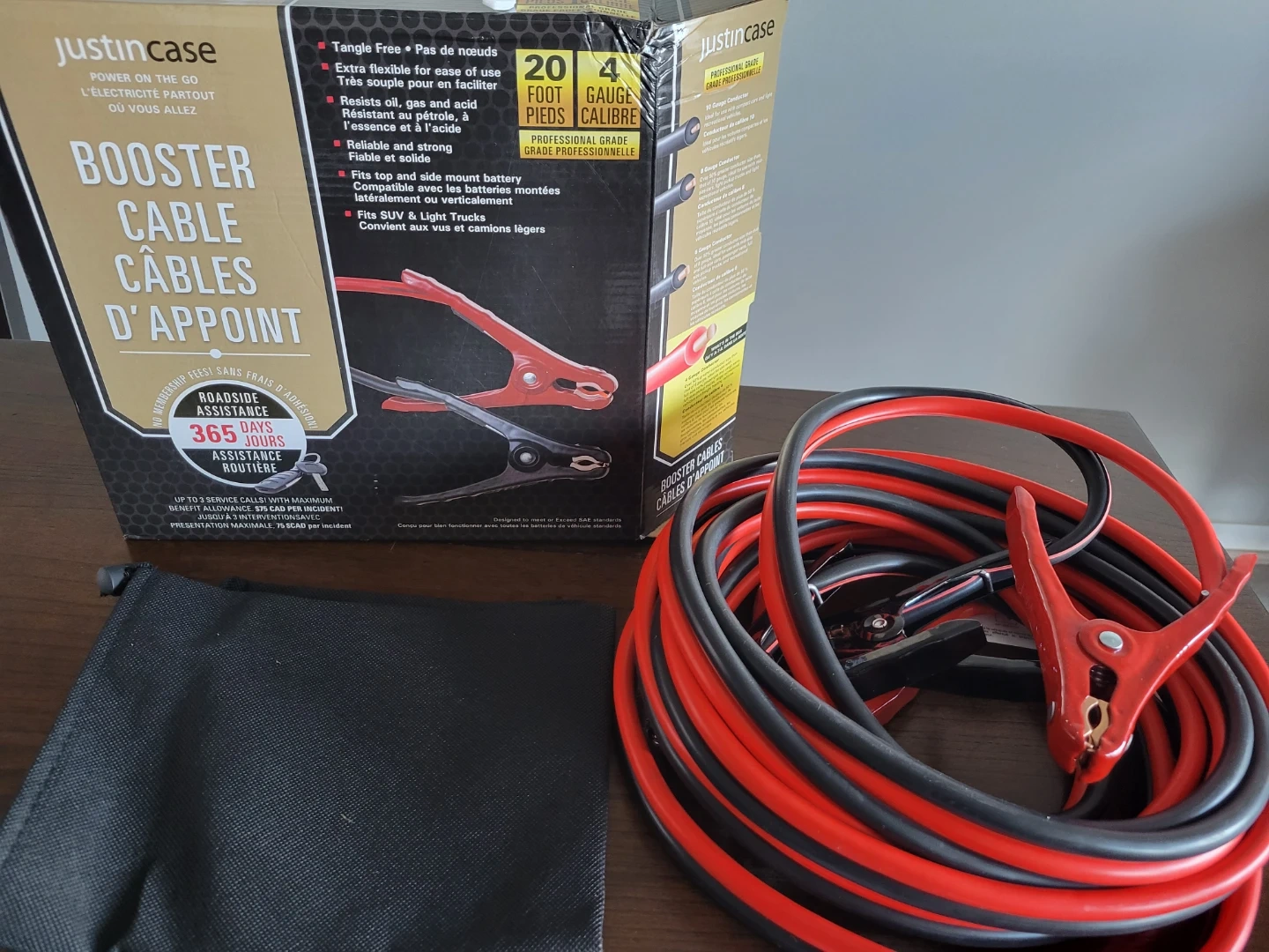 JustinCase booster cables for roadside assistance. They're 20 feet long with 4 gauge wire. The cables are tangle-free and resistant to oil, gas, and acid. They fit top and side mount batteries and are suitable for SUVs and light trucks.