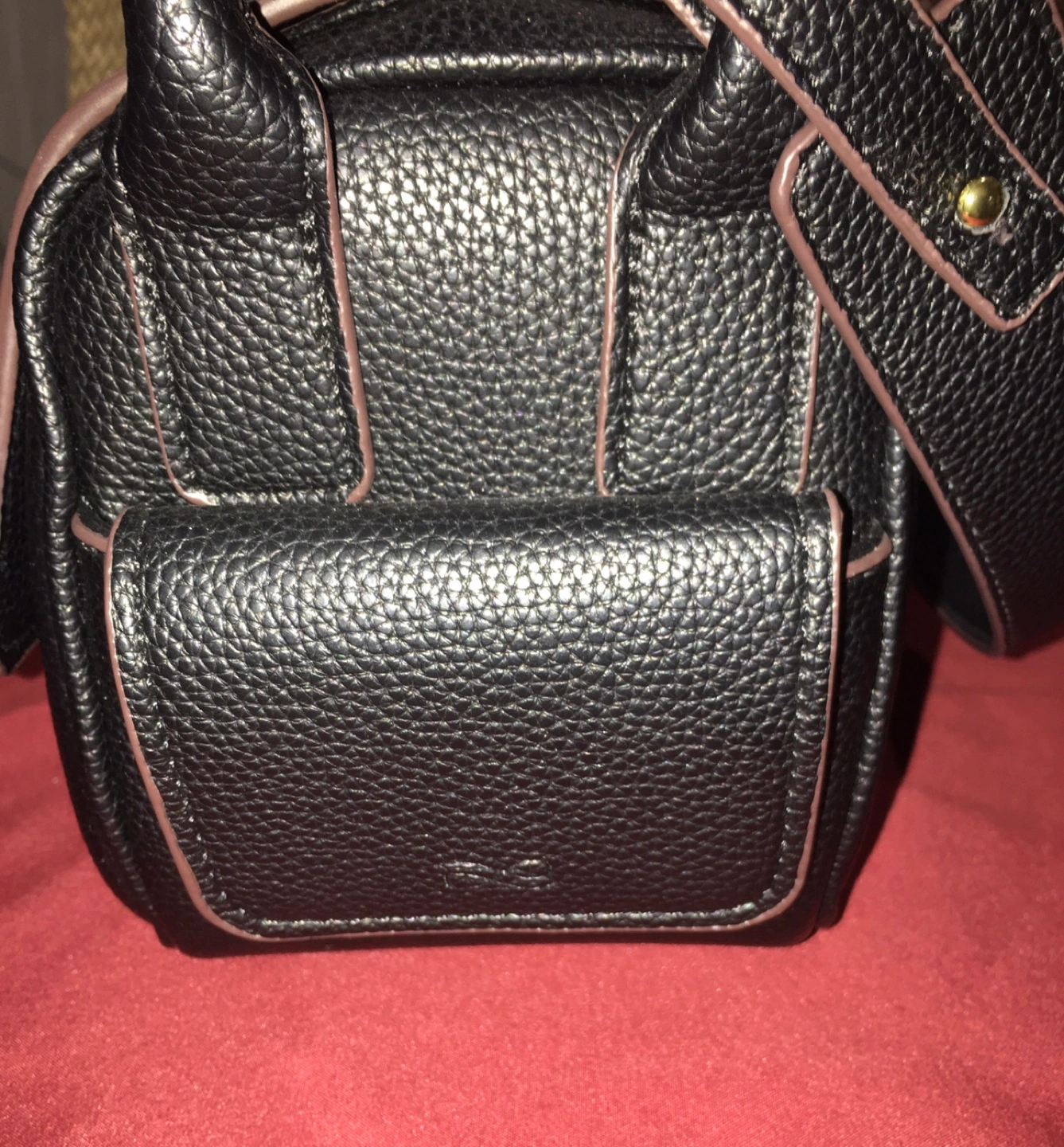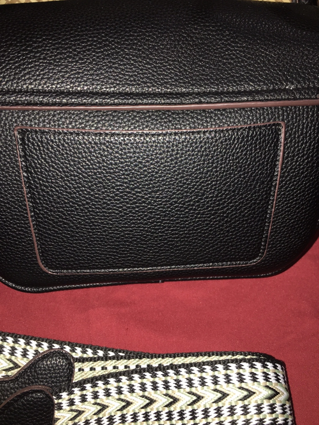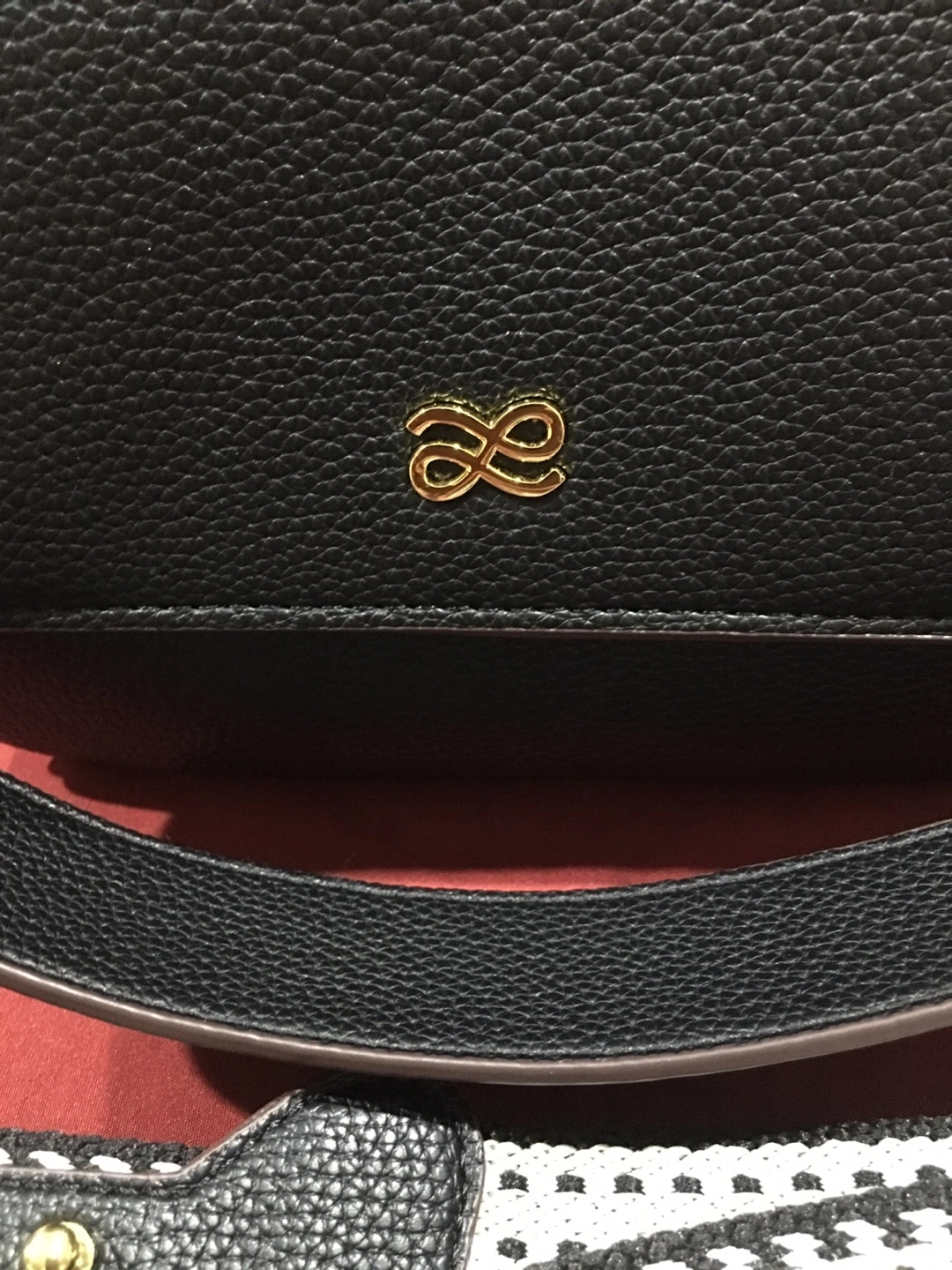Stylish black faux leather crossbody bag. It's got a pebble-grain texture and a gold-tone logo accent. Comes with a decorative patterned strap and an additional plain black strap.