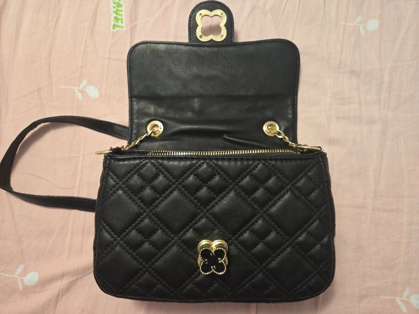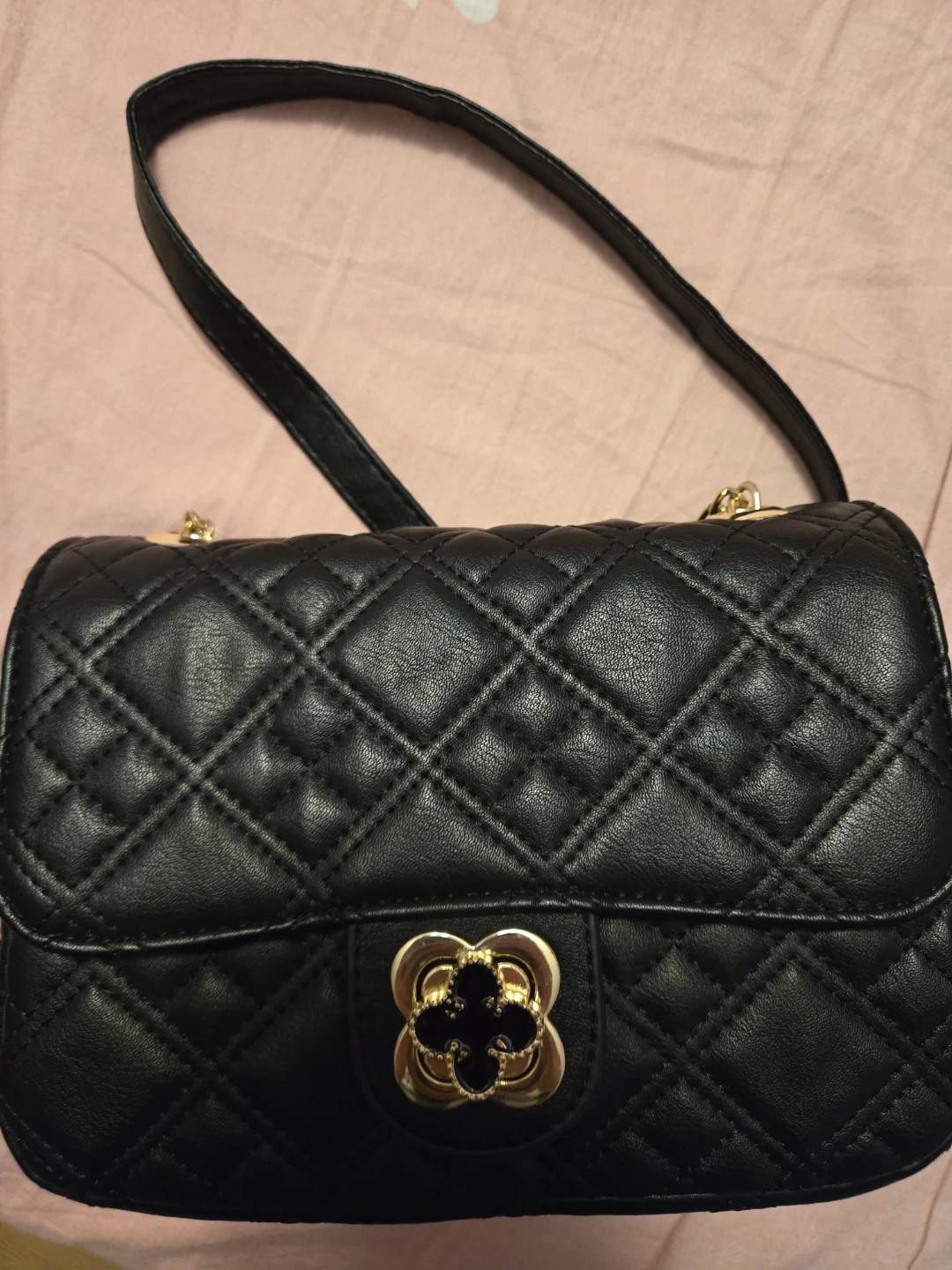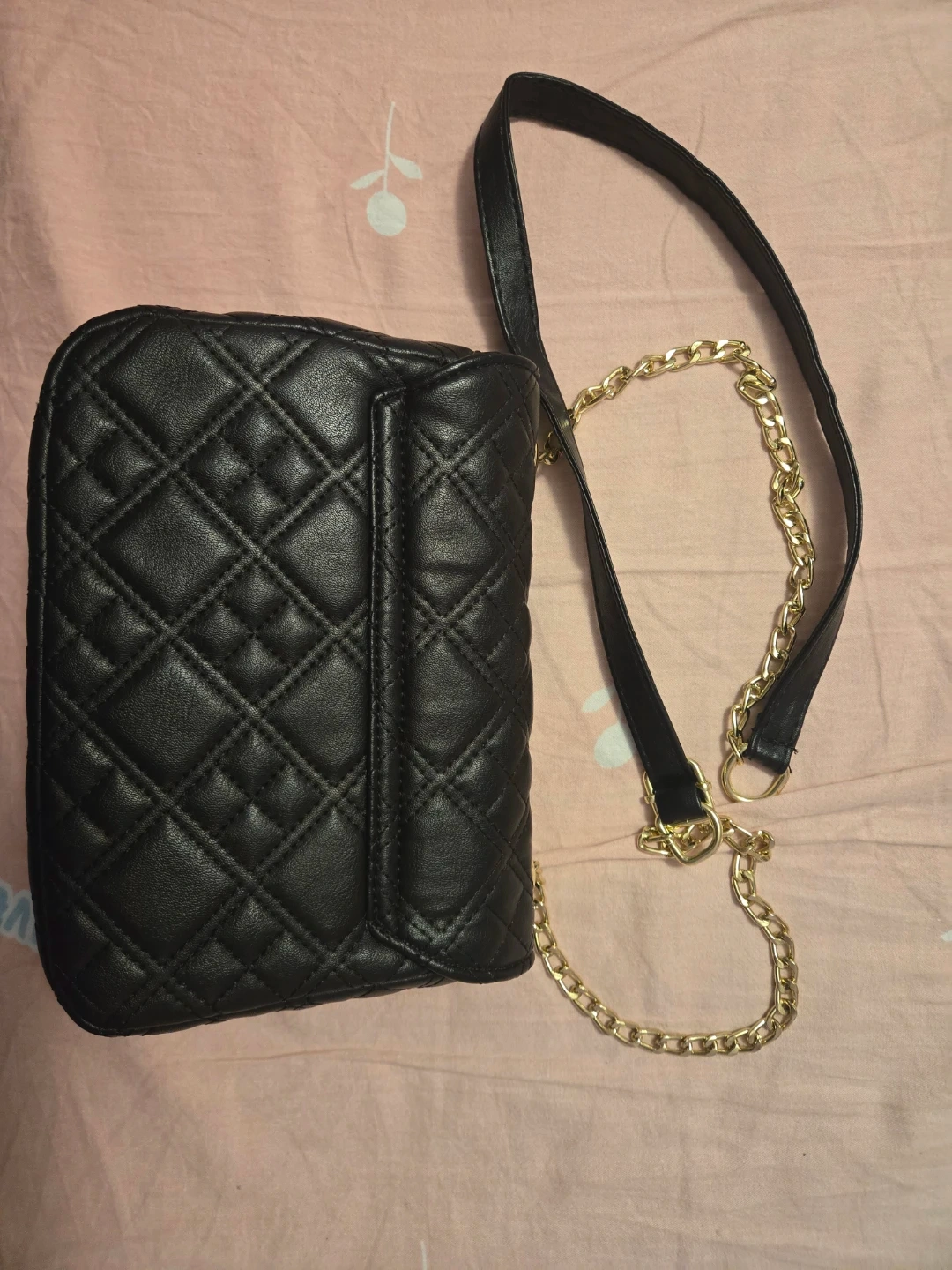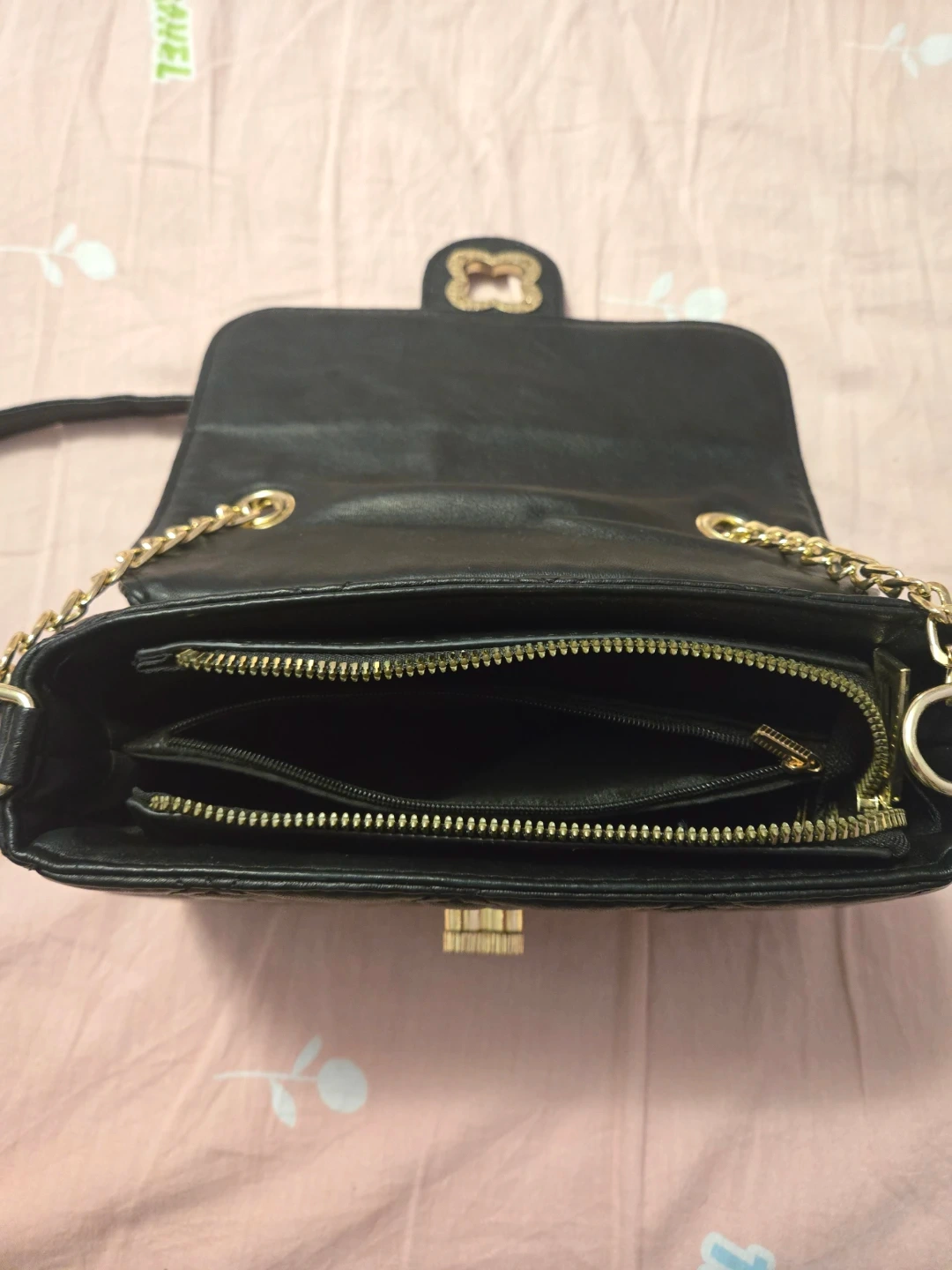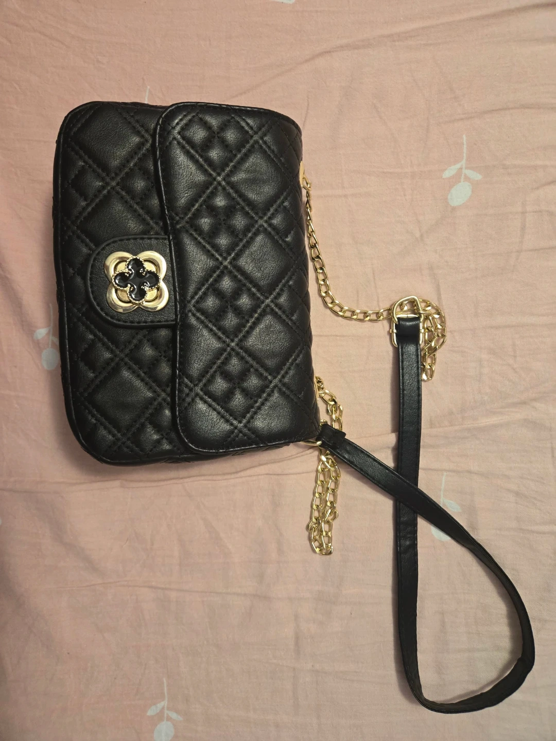 This black quilted purse has a gold chain strap and a decorative clasp. It features a zippered main compartment and an interior zippered pocket. It's a great size for essentials!