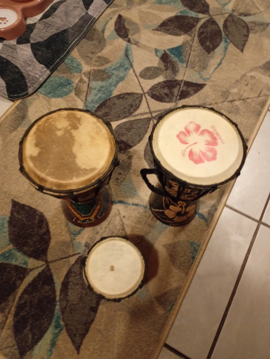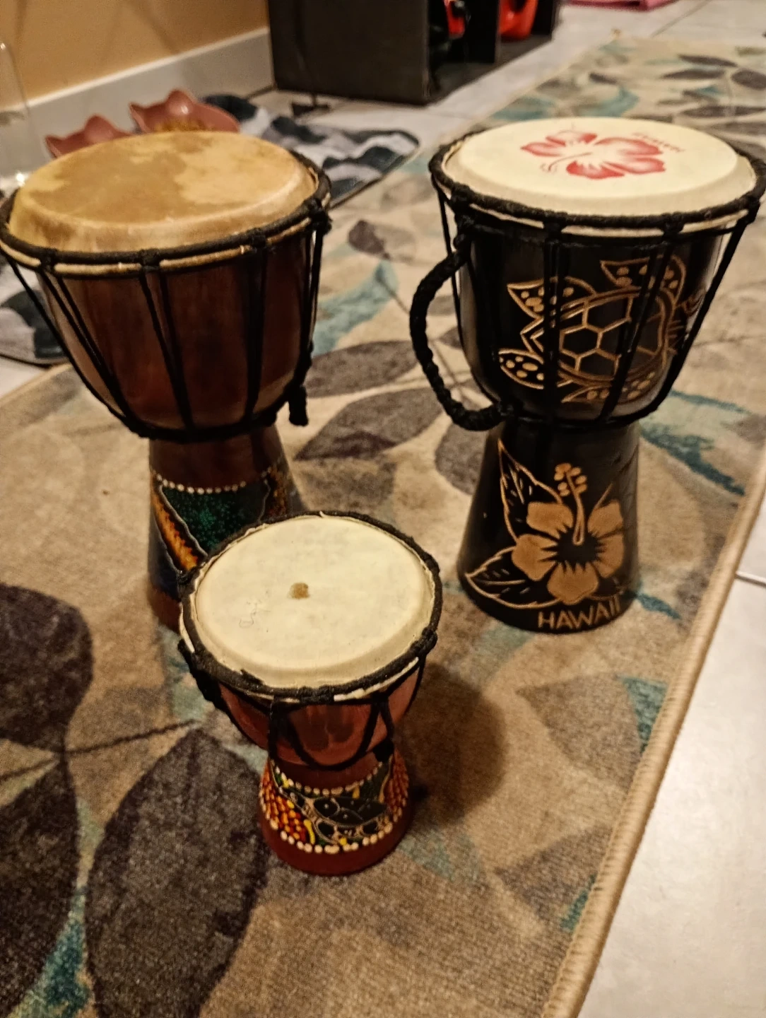 A set of three decorative djembe drums, with one featuring a Hawaii theme including a turtle and hibiscus design. The smallest drum has colourful tribal patterns. They're perfect for adding a touch of island flair to your decor or for casual drumming fun!