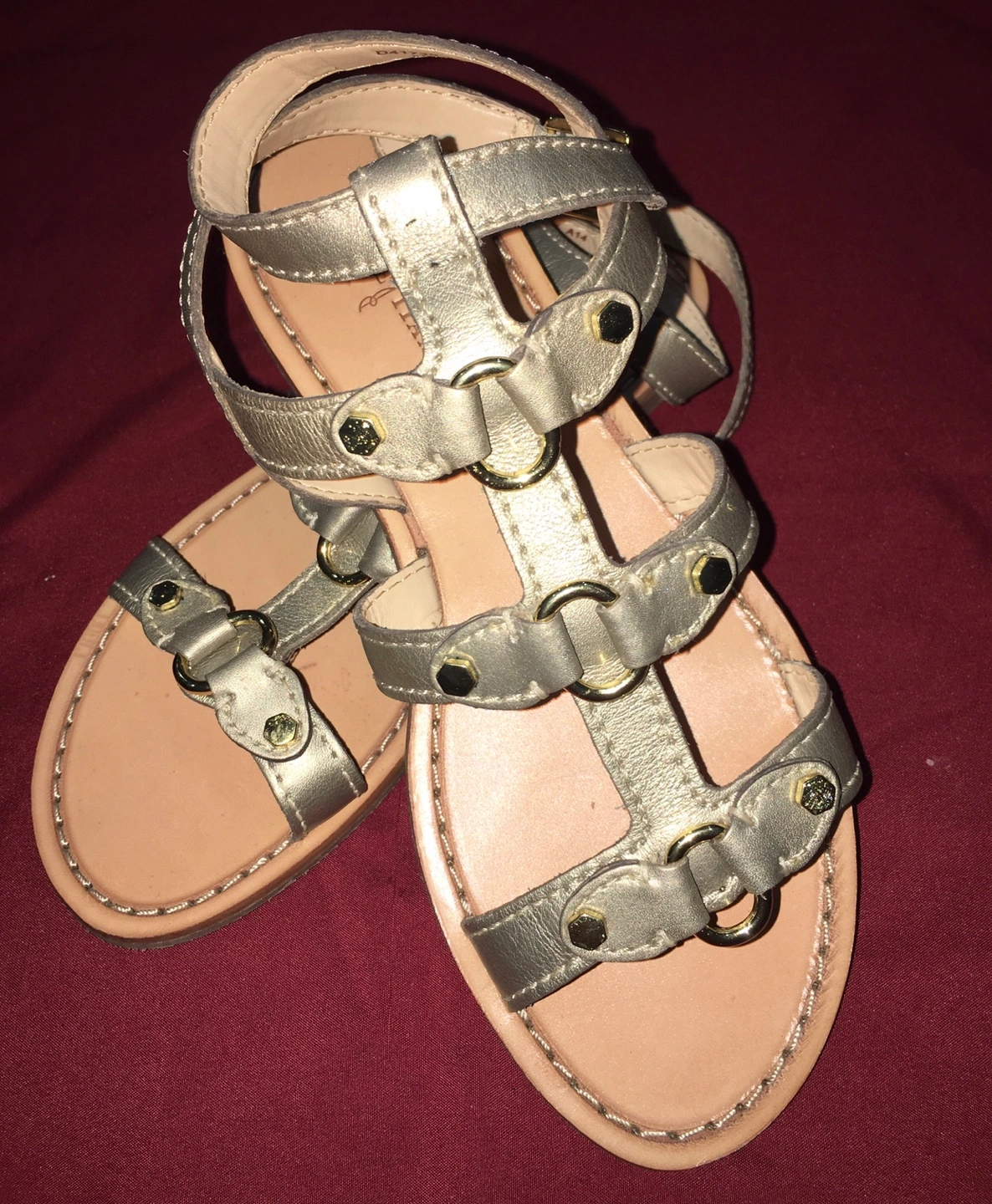 Cole Haan gold gladiator-style sandals for kids. These feature multiple straps and a secure buckle closure. Leather upper and sole. Perfect for warm weather adventures!