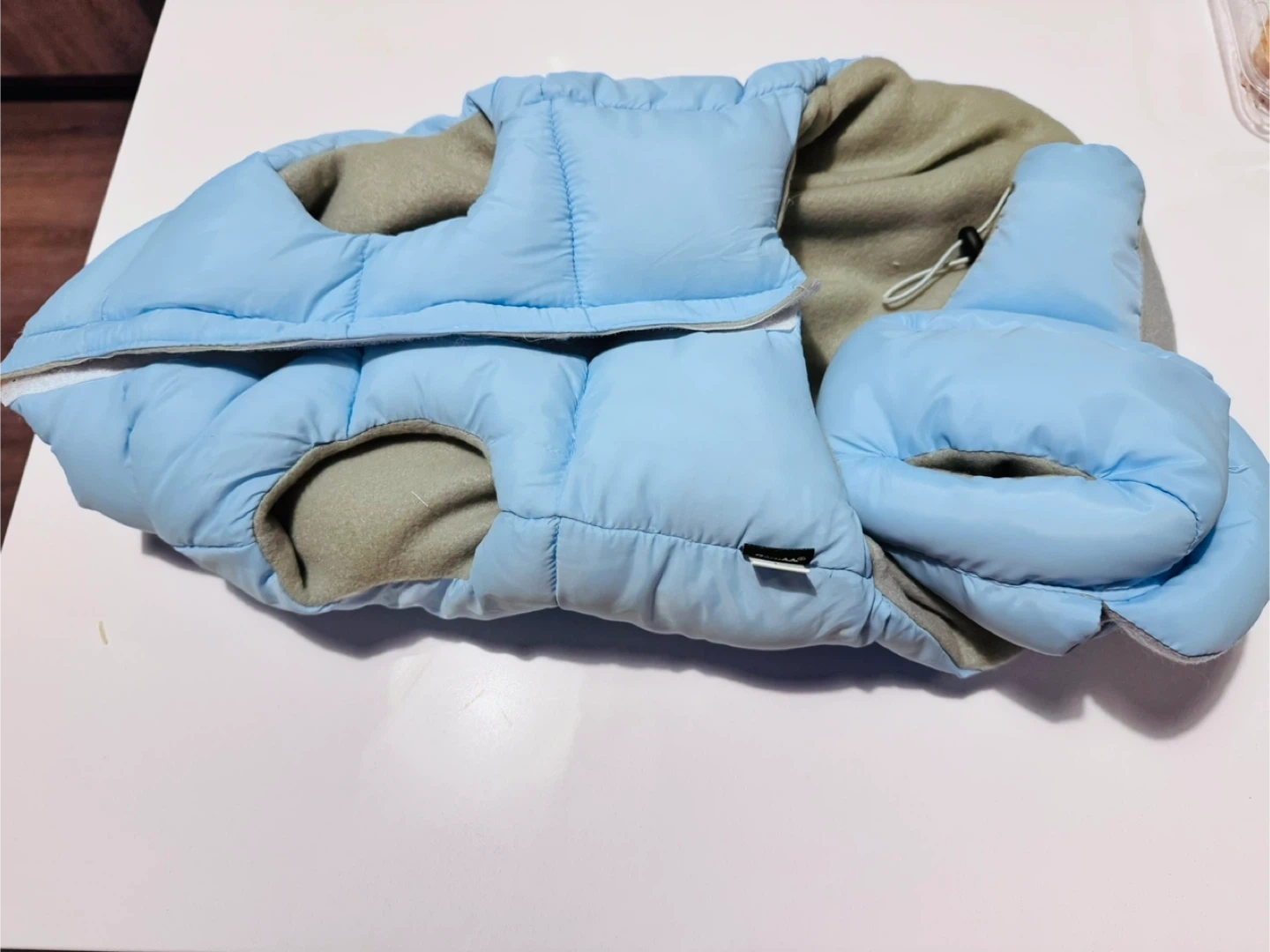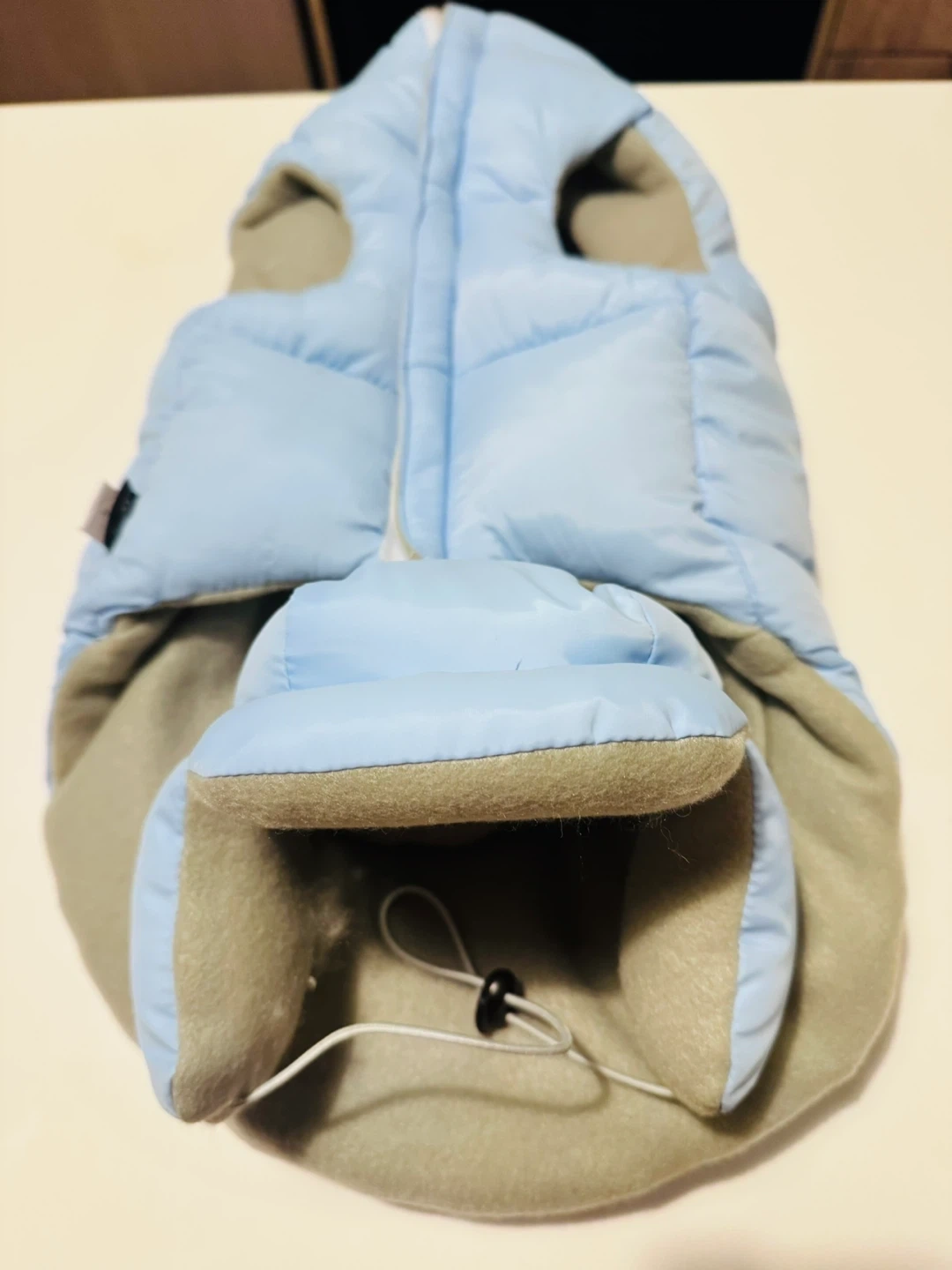 This light blue puffer coat is designed for pets, featuring a cozy fleece lining. It has a matching warm cap. It includes a drawstring for an adjustable fit and easy-to-use closures. Perfect for keeping your furry friend warm during colder weather!