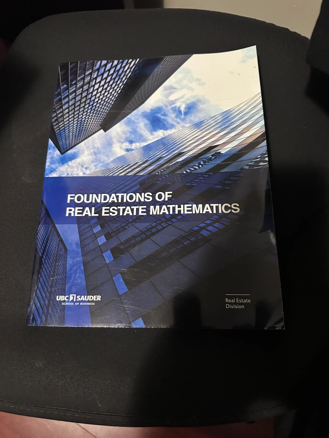 This textbook covers the essential mathematical principles for real estate. It's published by UBC Sauder School of Business. This book is for anyone studying BUSI 121 UBC Sauder $40 obo