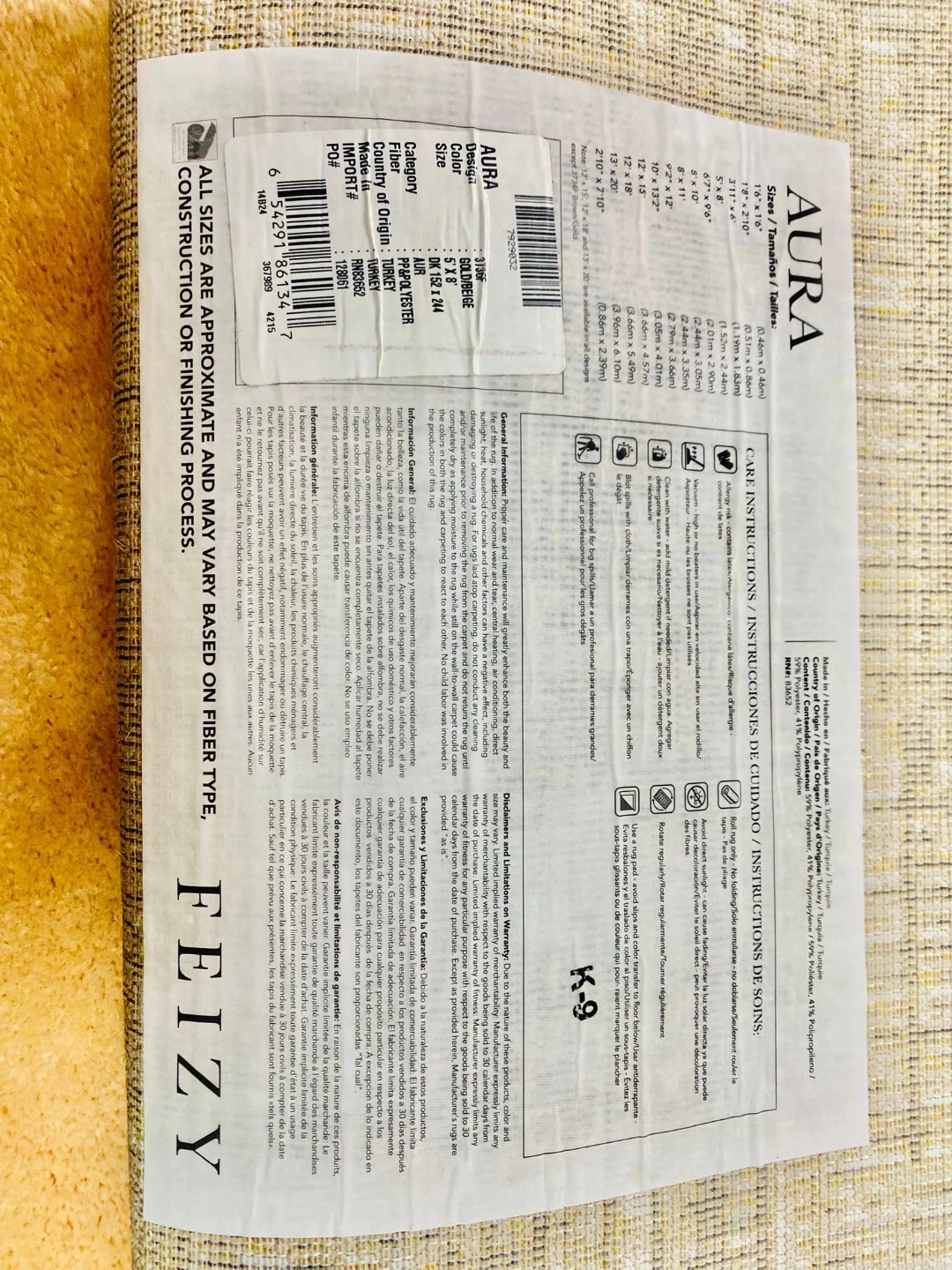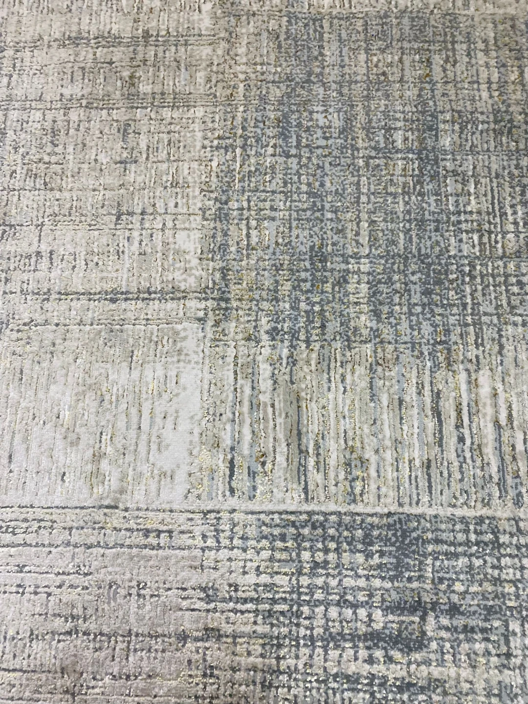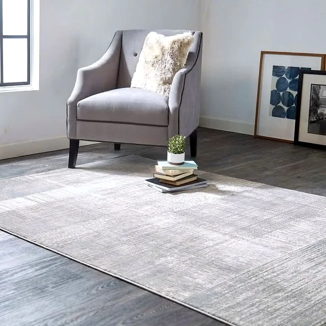 Stylish Aura area rug with a modern design. Features a blend of grey and cream tones. Made with polypropylene material for durability. Rug dimensions are 5'3" x 7'6".
