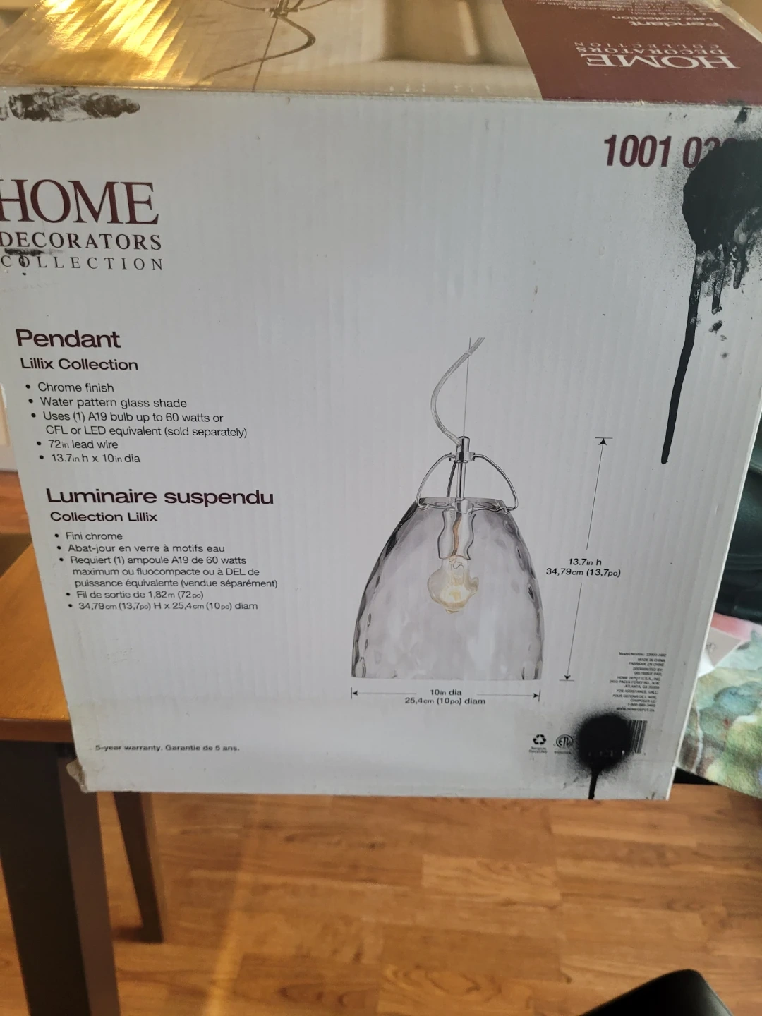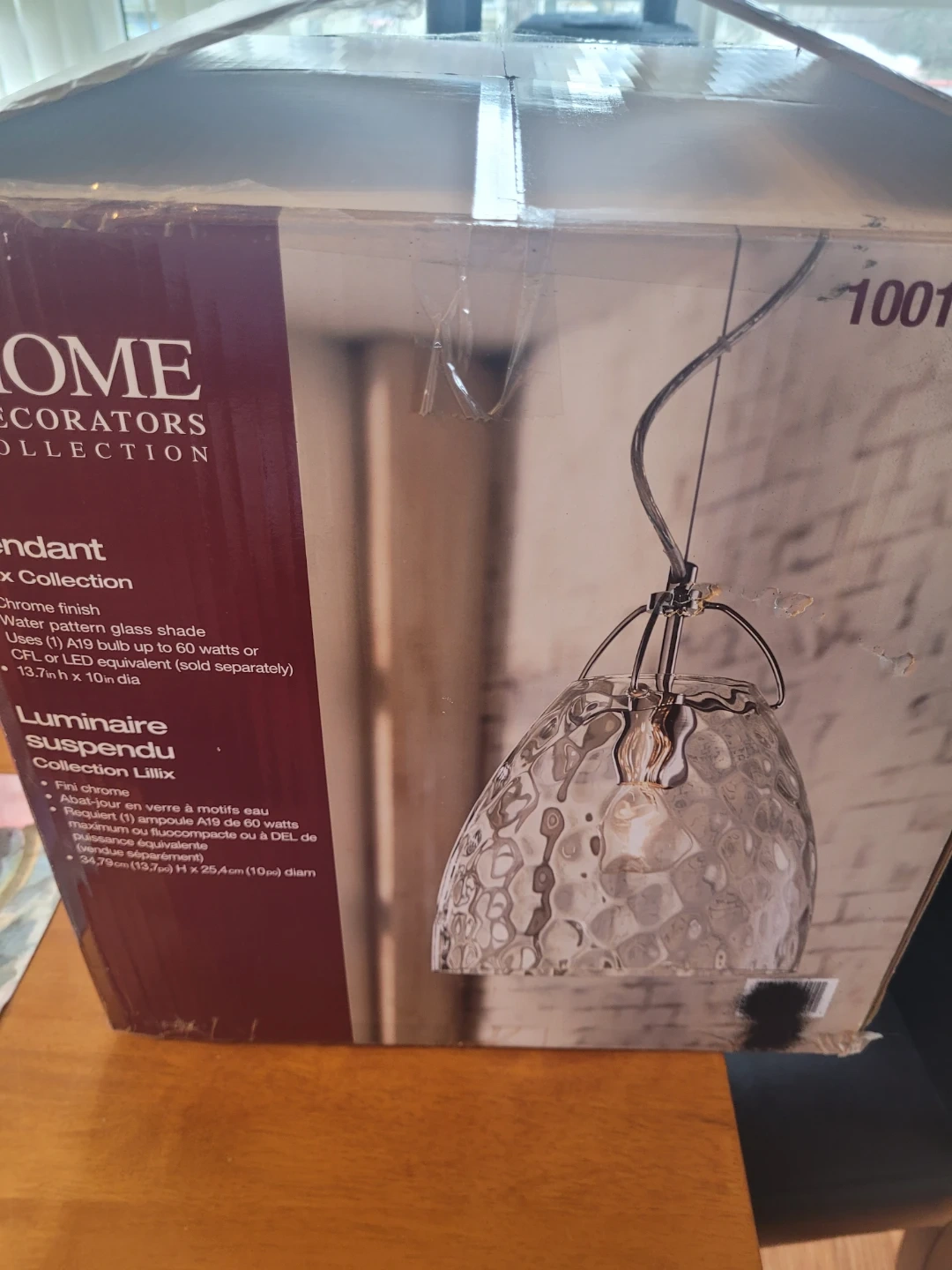 Chrome finish pendant light with a water pattern glass shade. Uses one A19 bulb up to 60 watts or CFL/LED equivalent. Dimensions are 13.7in h x 10in dia. This light's unique glass design adds a touch of style to any room.