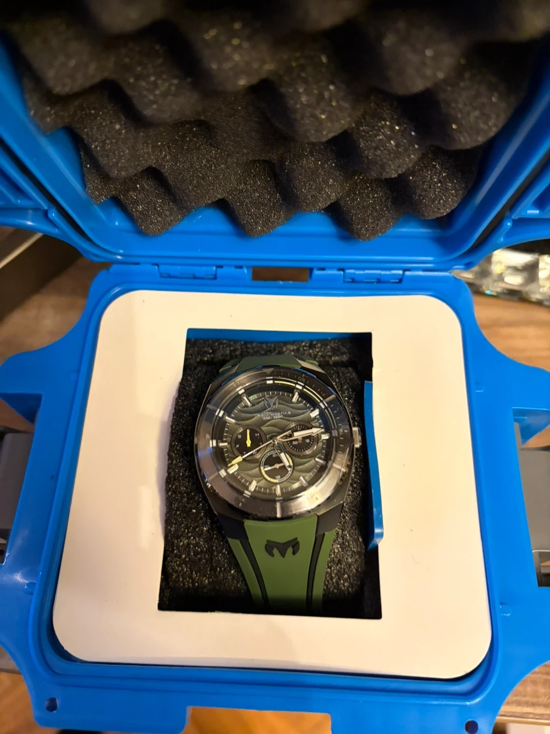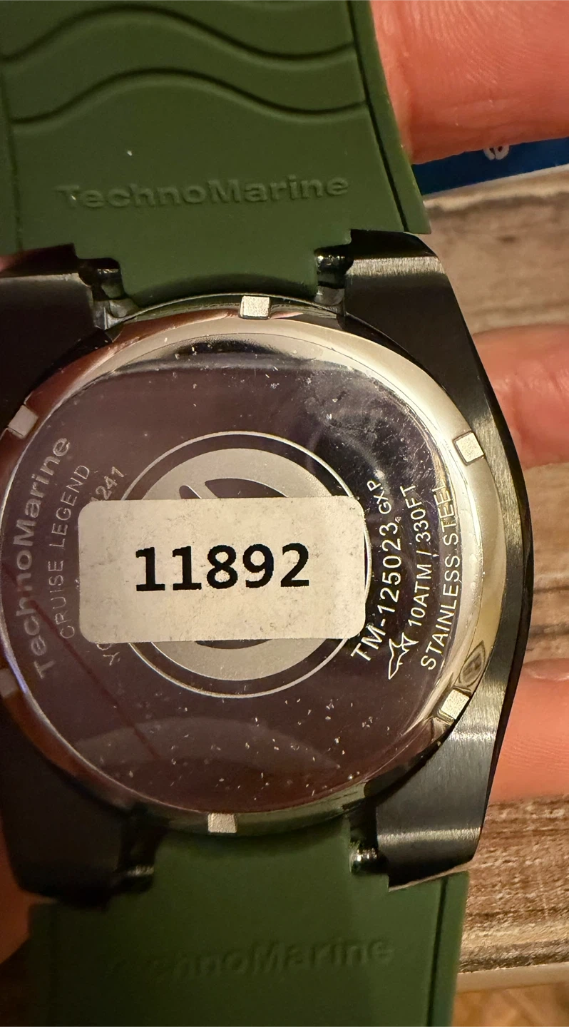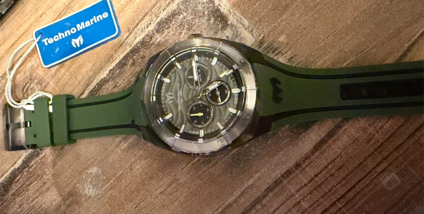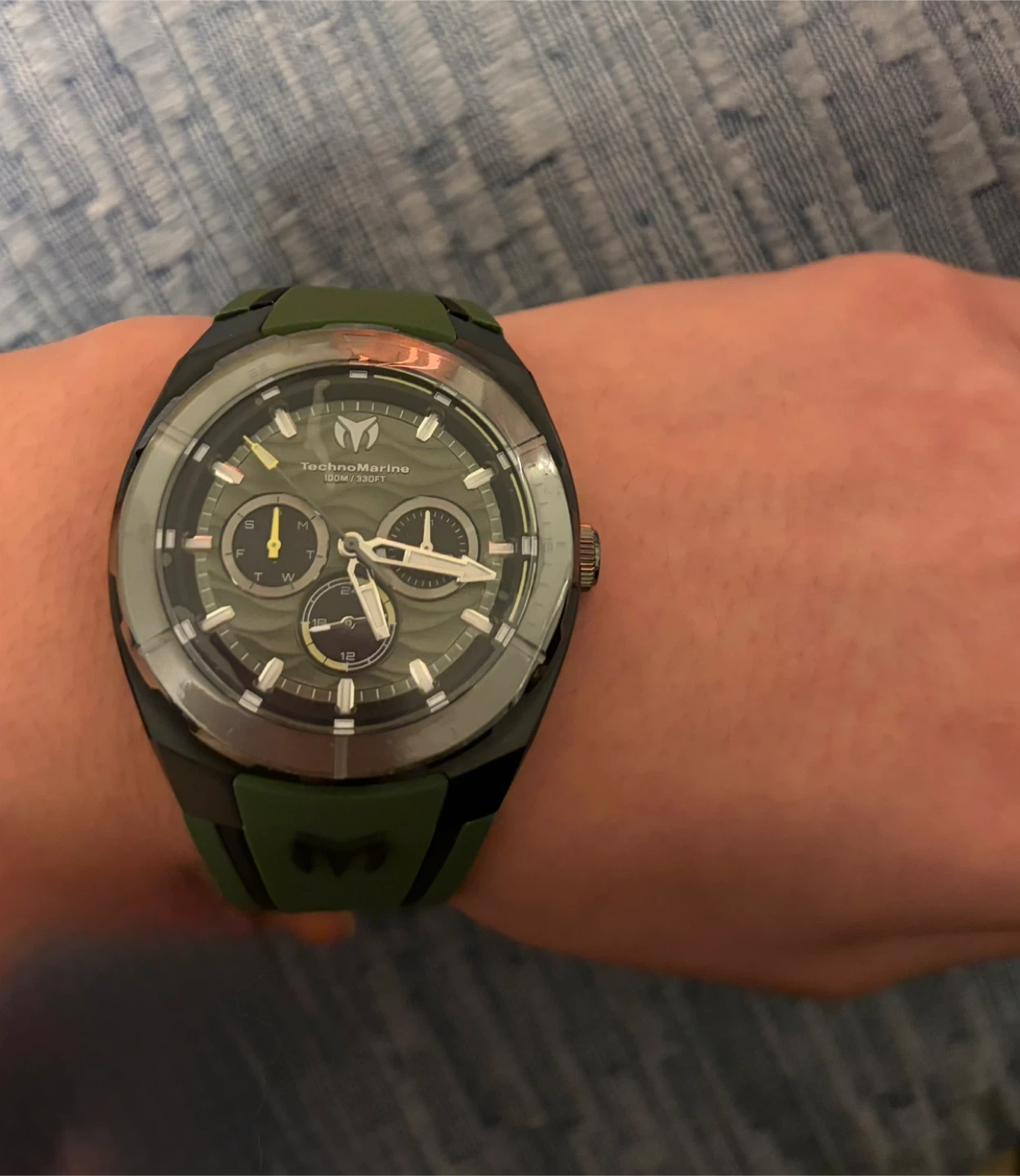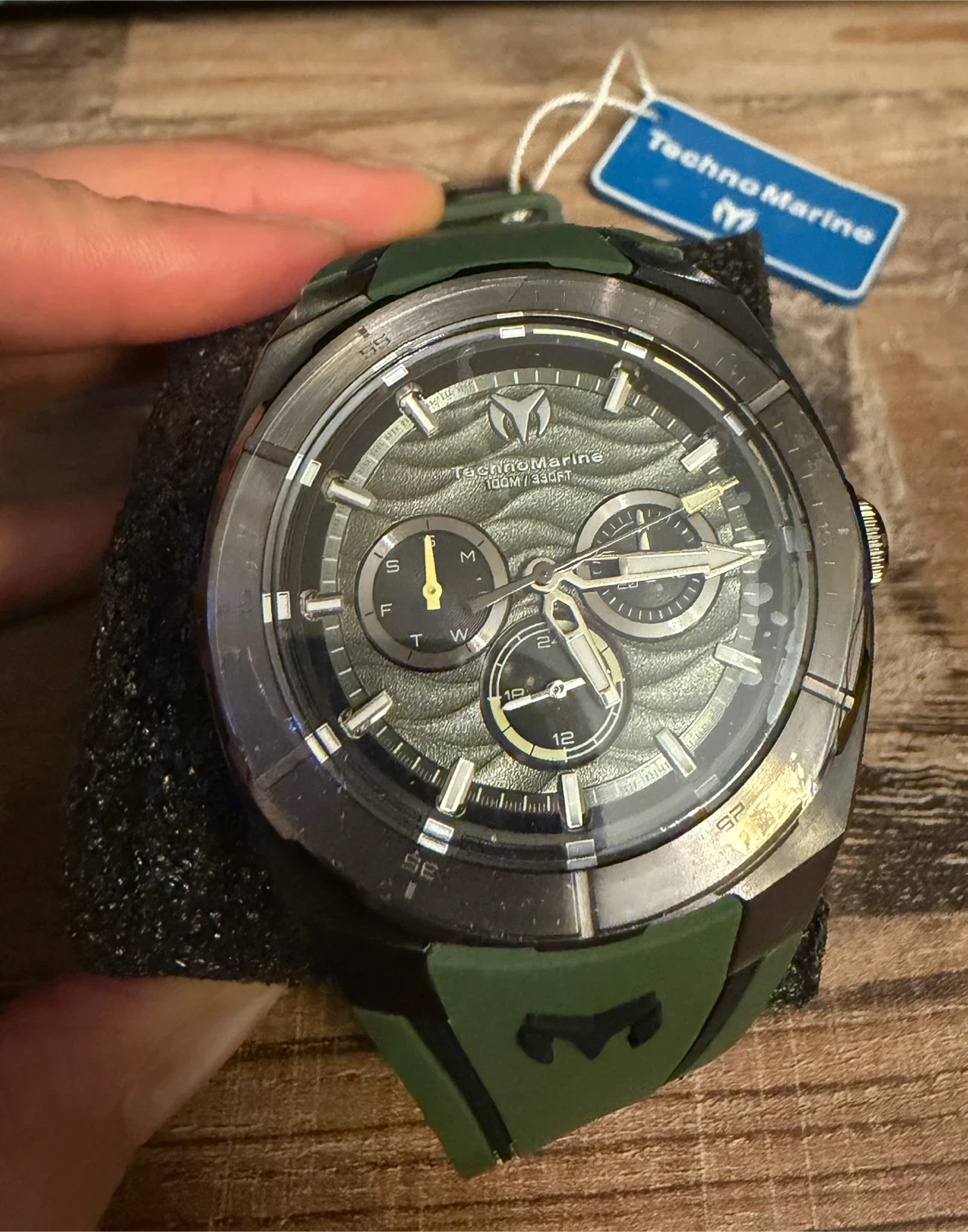 This TechnoMarine watch is the Cruise Legend model. It features a 100 m water resistance rating, making it suitable for swimming. The watch is made of stainless steel with a green silicone band. Comes in its original packaging.