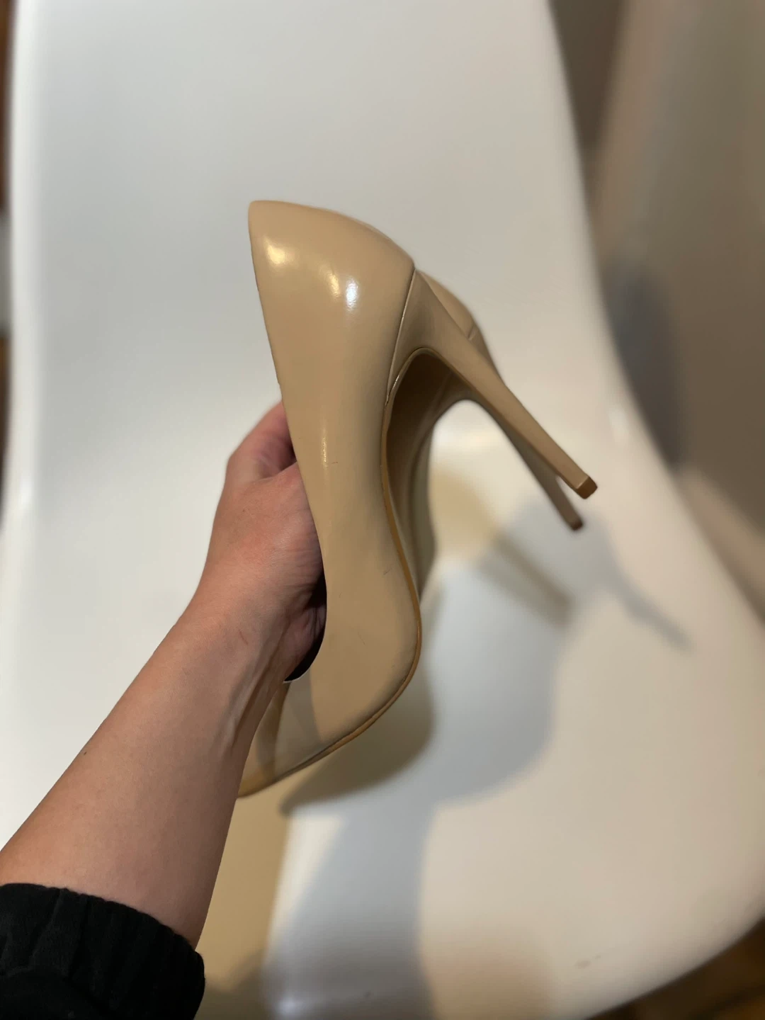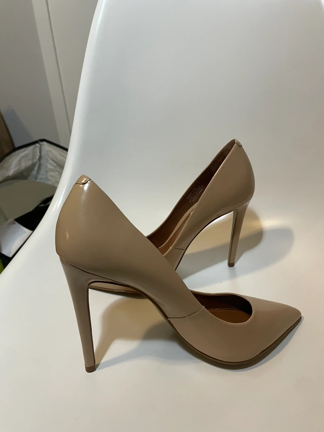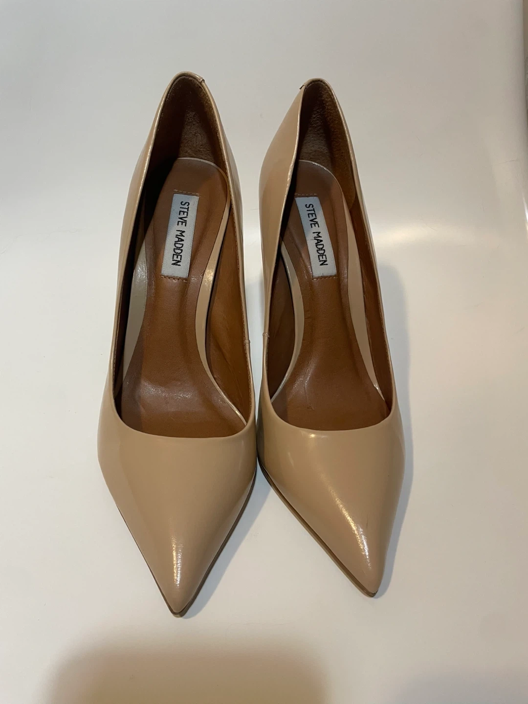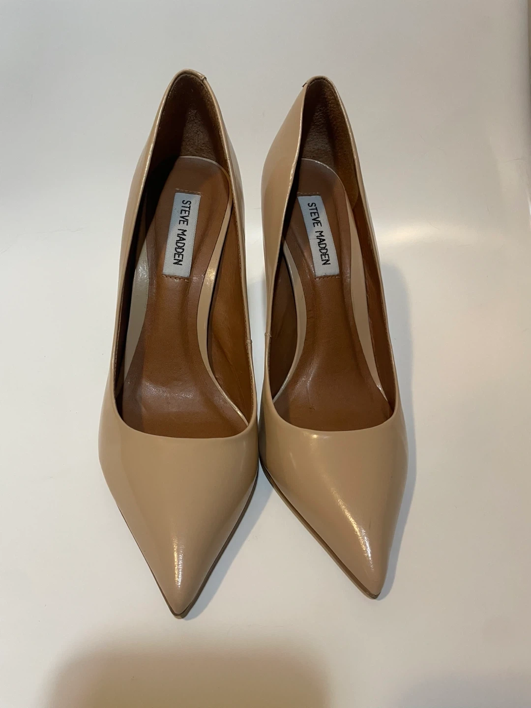 These Steve Madden pumps are made of nude patent leather. They have a pointed toe and a stiletto heel. These shoes are a versatile addition to any wardrobe!