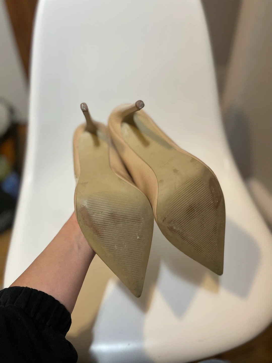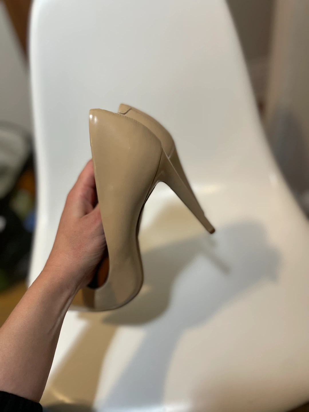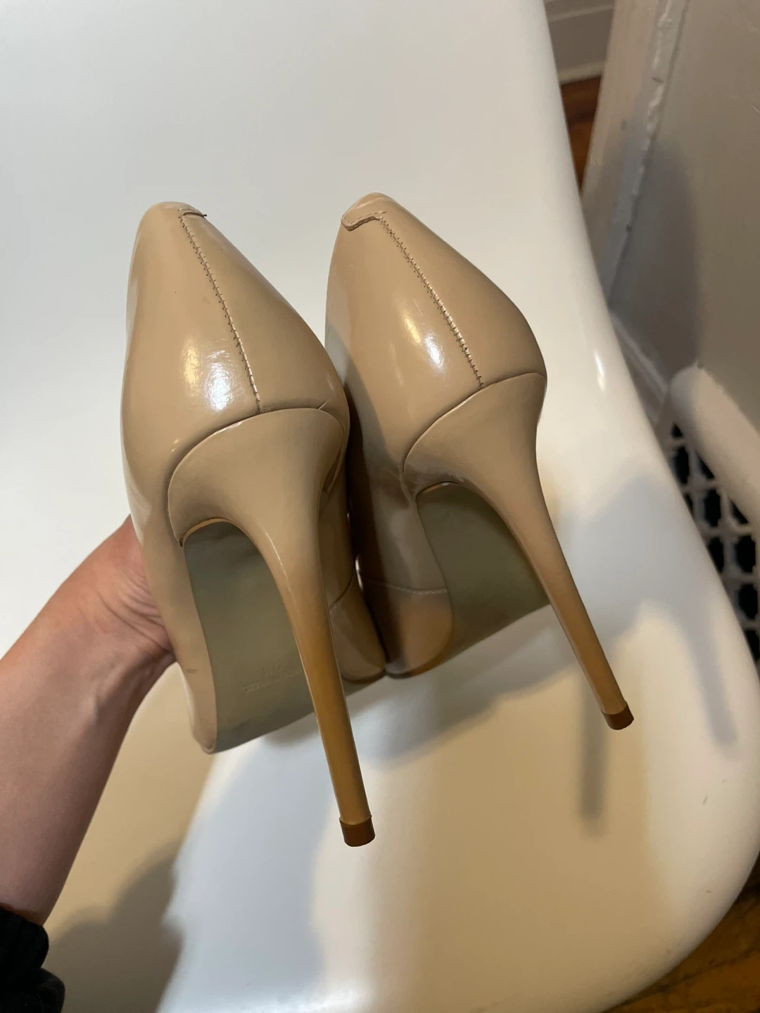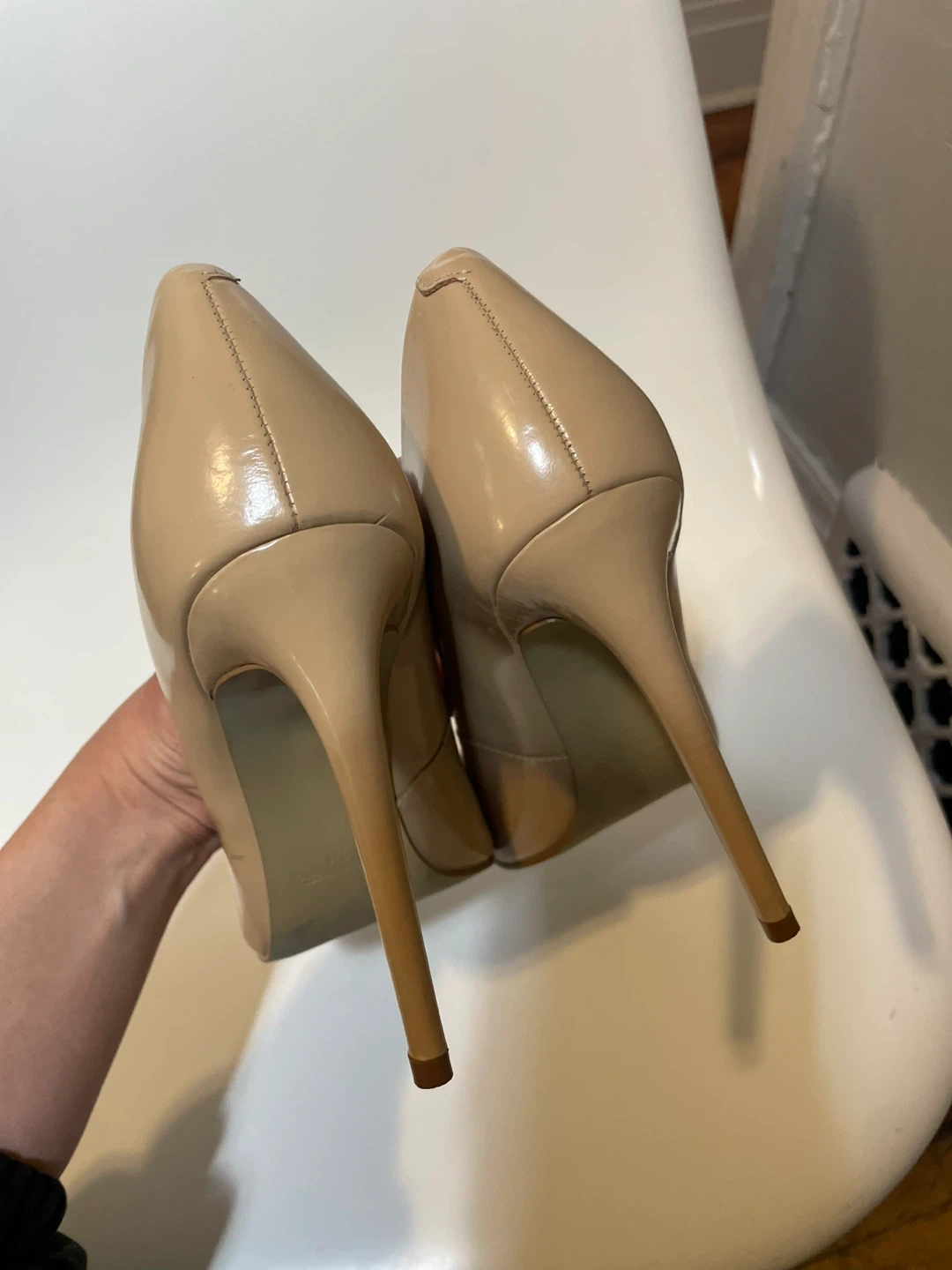 These Steve Madden pumps are made of nude patent leather. They have a pointed toe and a stiletto heel. These shoes are a versatile addition to any wardrobe!