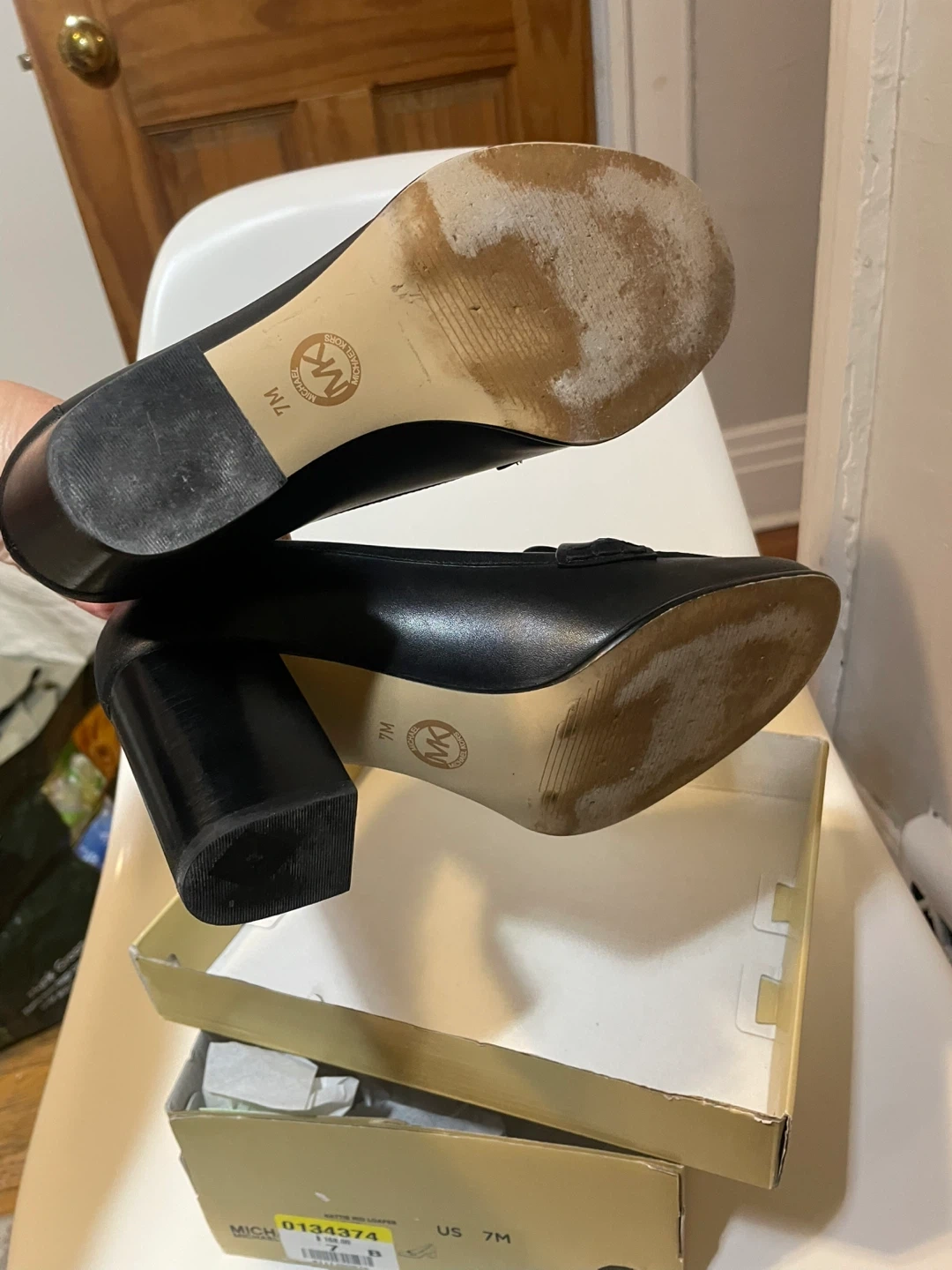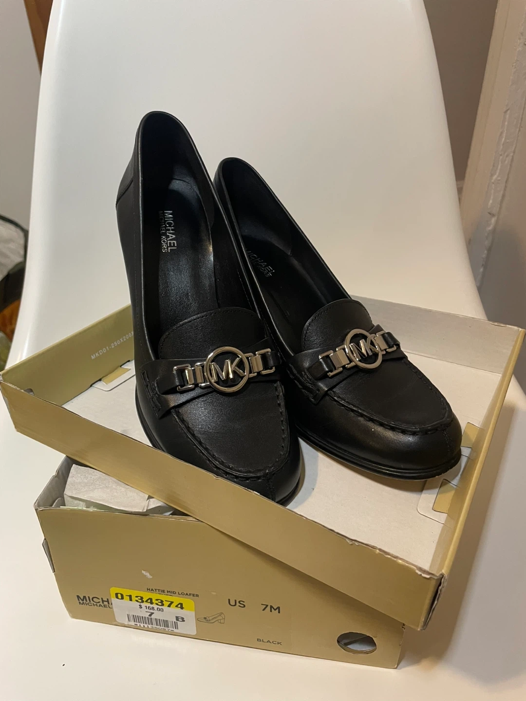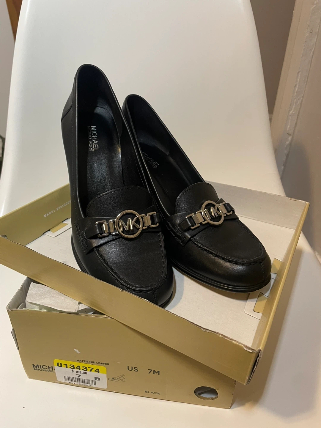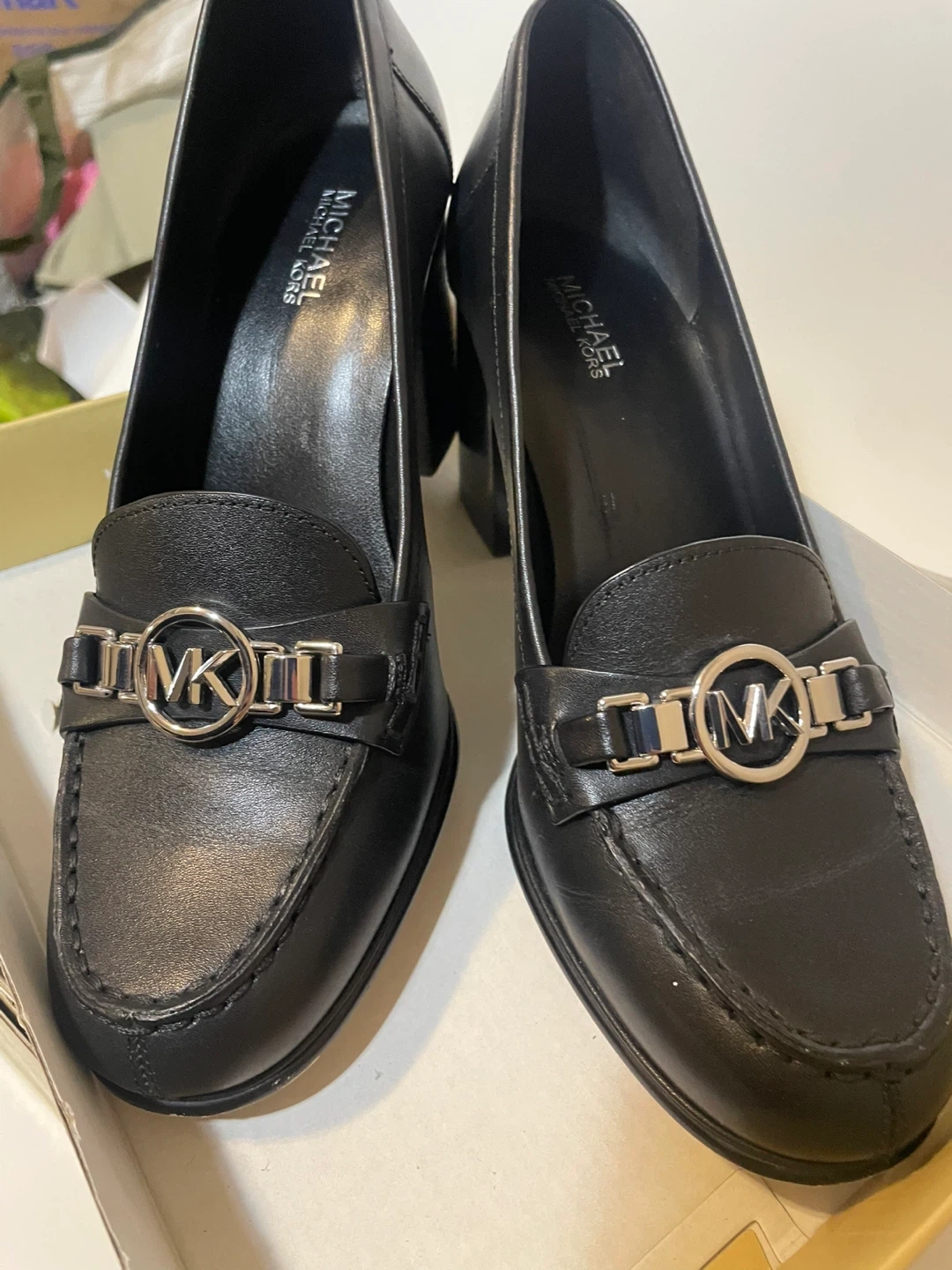 Michael Kors women's black leather loafer heels. Features a silver-tone MK logo embellishment. Includes original box. Size 7 US.