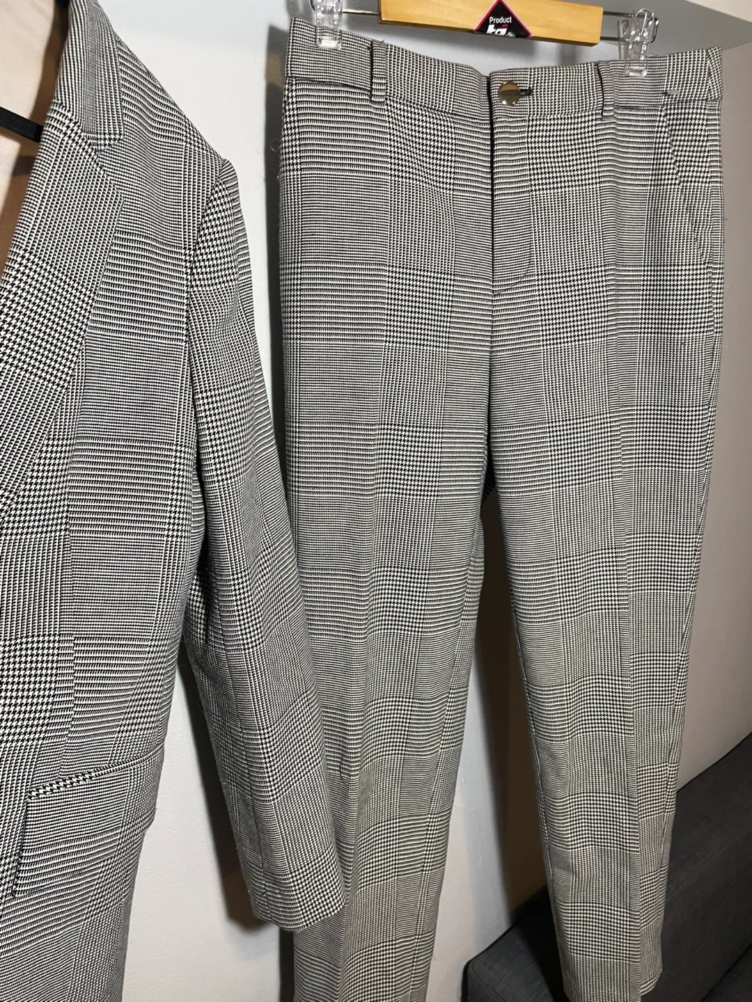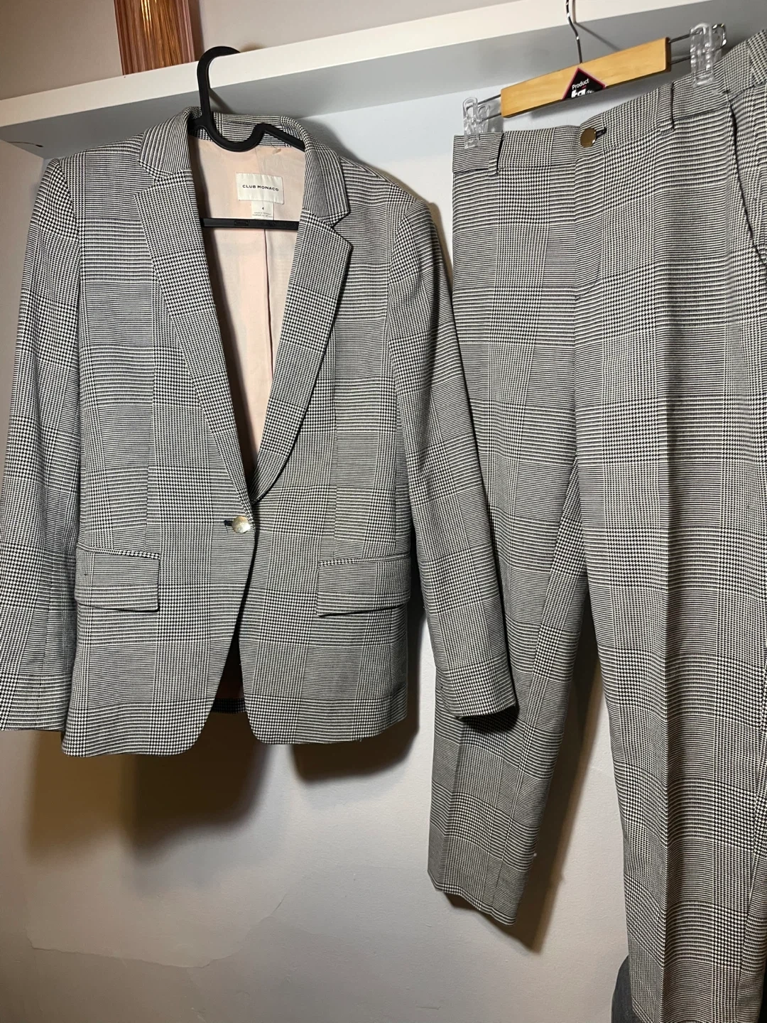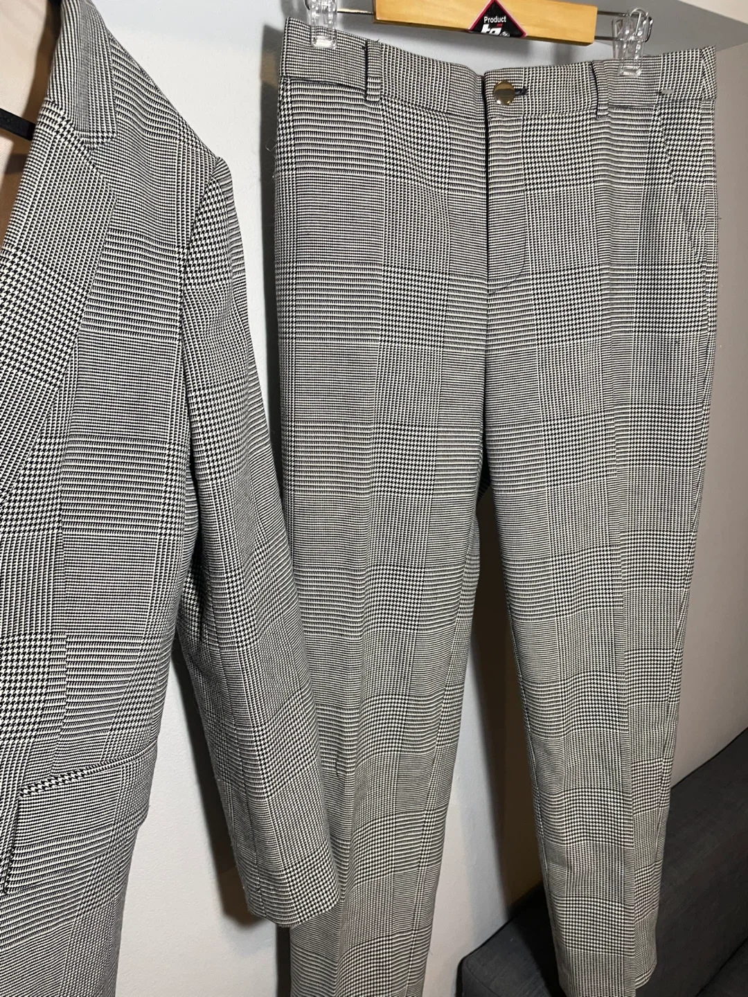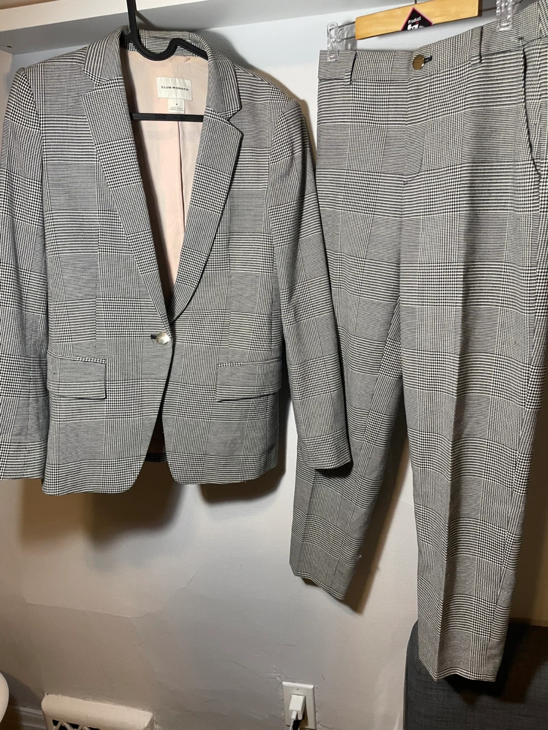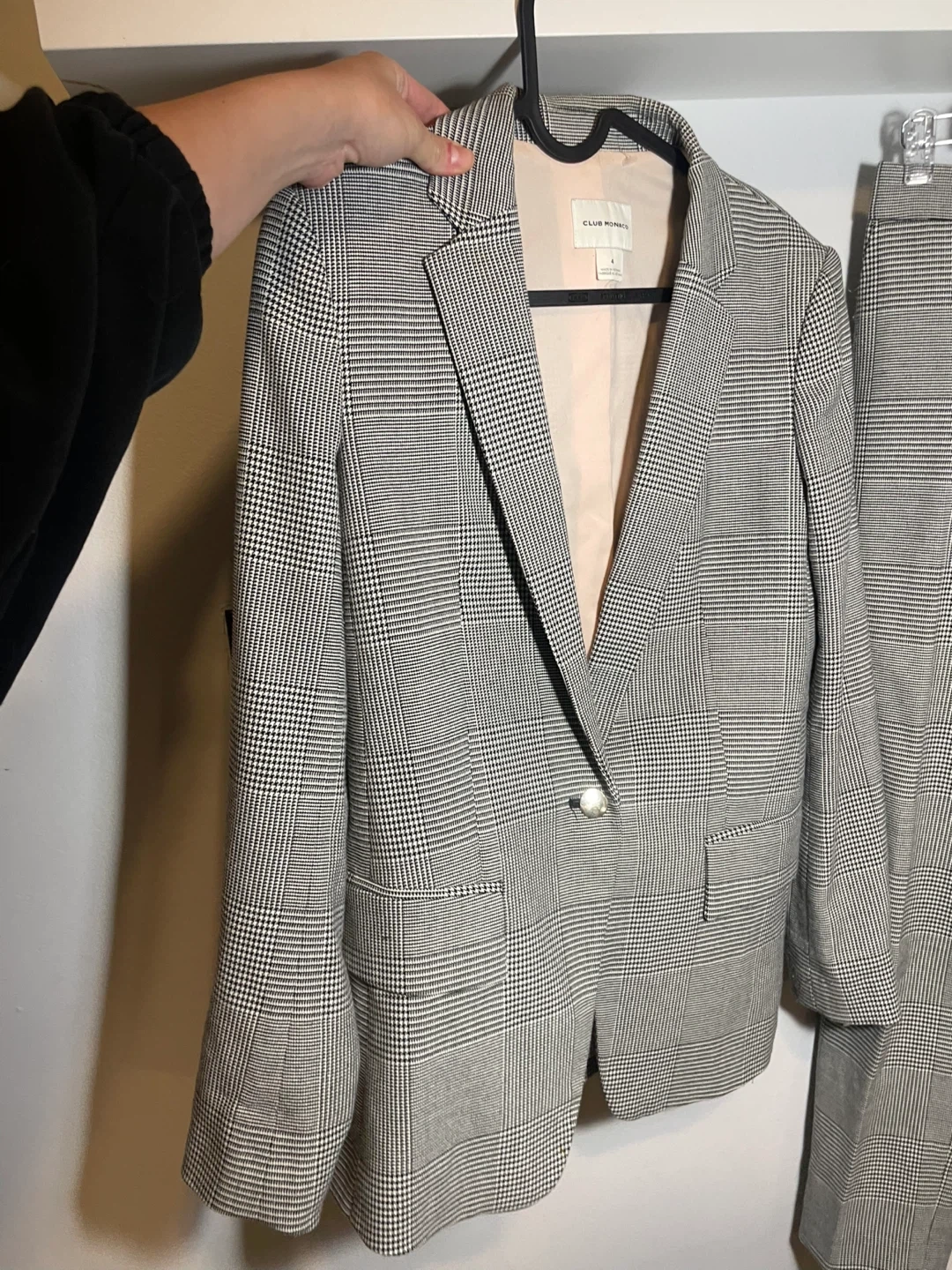 This is a two-piece set from Club Monaco, featuring a plaid pattern. It includes a blazer and matching pants. Blazer size is 4 Pants size 2.