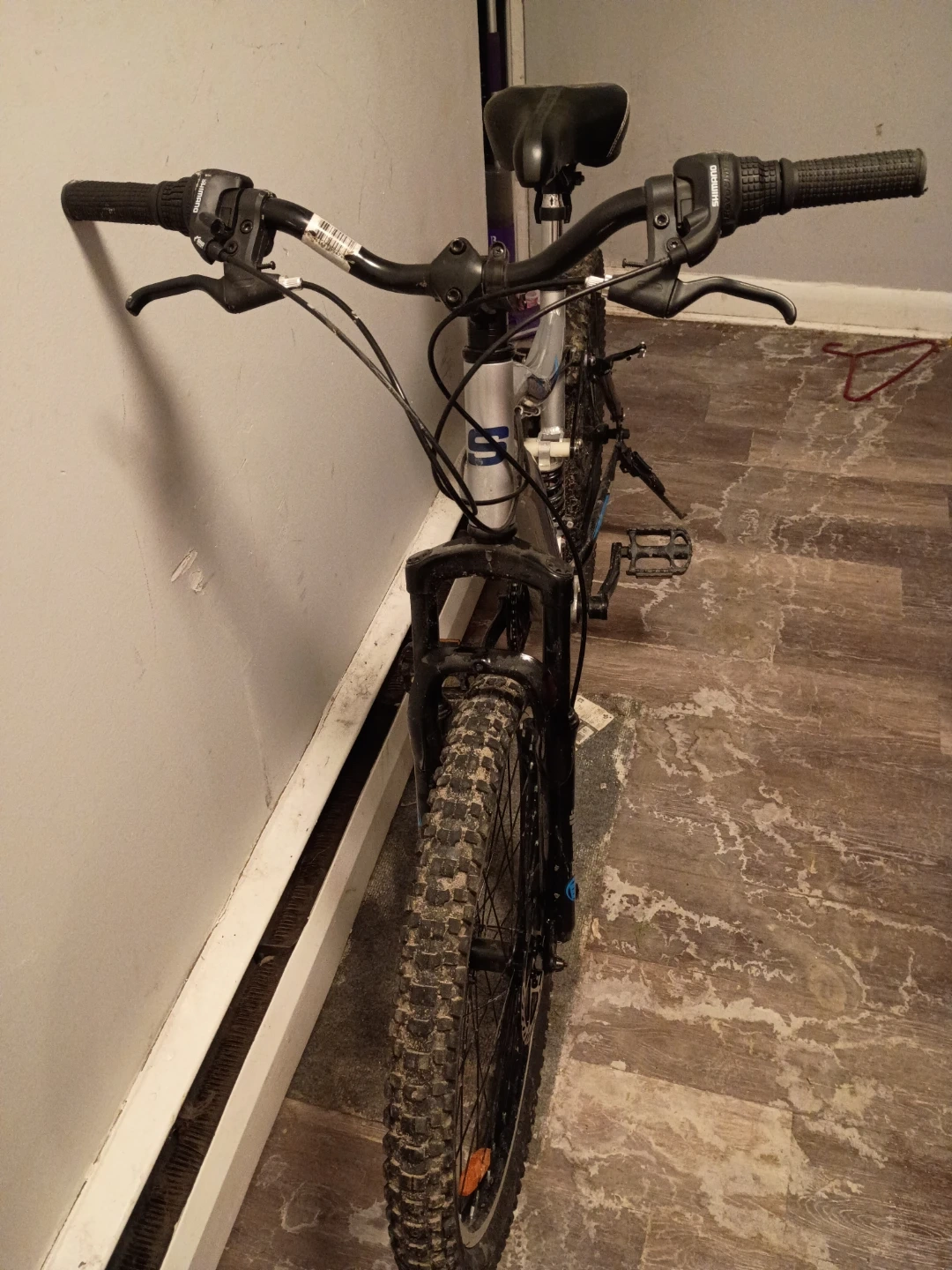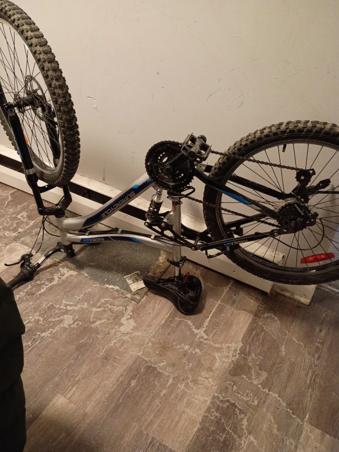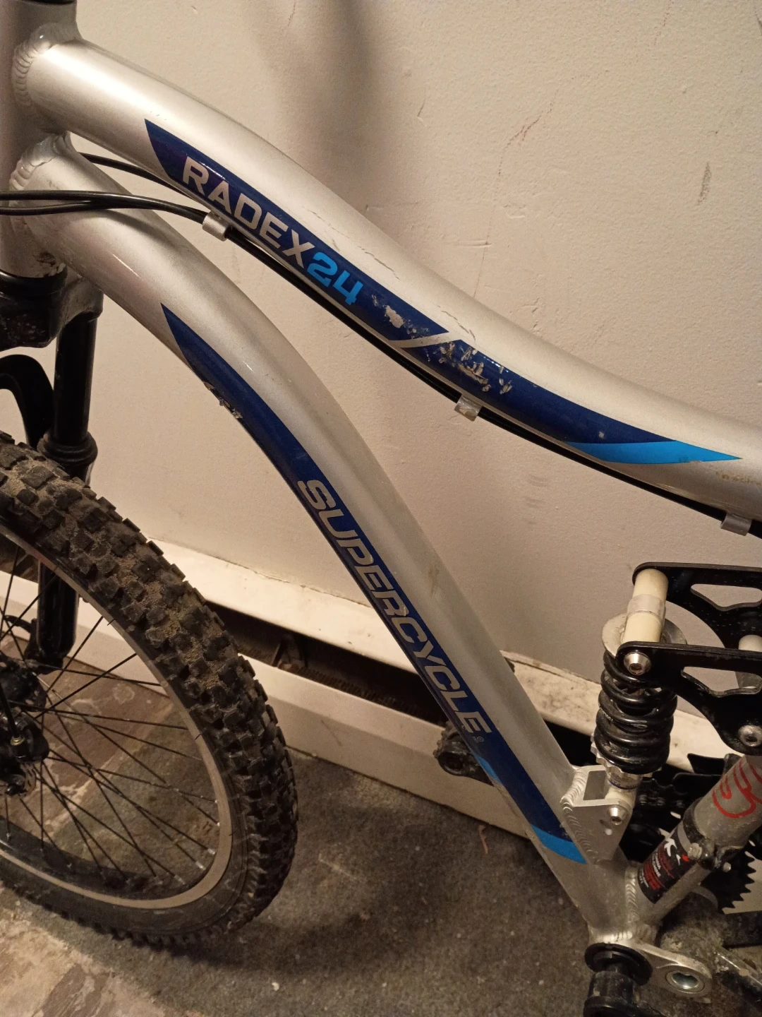 Silver Supercycle mountain bike with blue accents. Full suspension model. Great for trails! Need gone pick up only