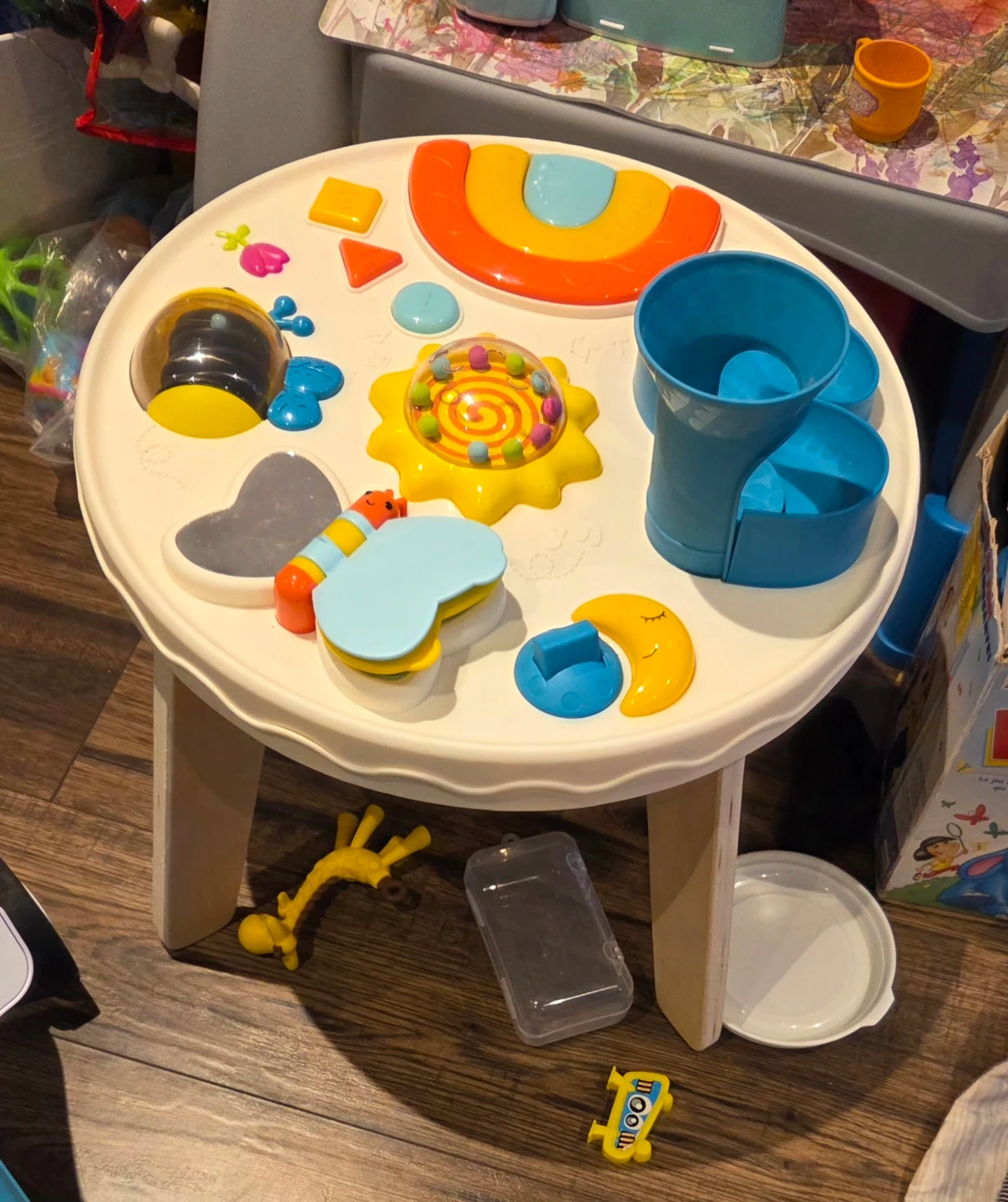 This is a baby activity play table. It has various interactive toys attached, including a sun, a bee, and a rainbow arch. The table is designed for little ones to explore and play with. It's made of plastic and has wooden legs for stability.