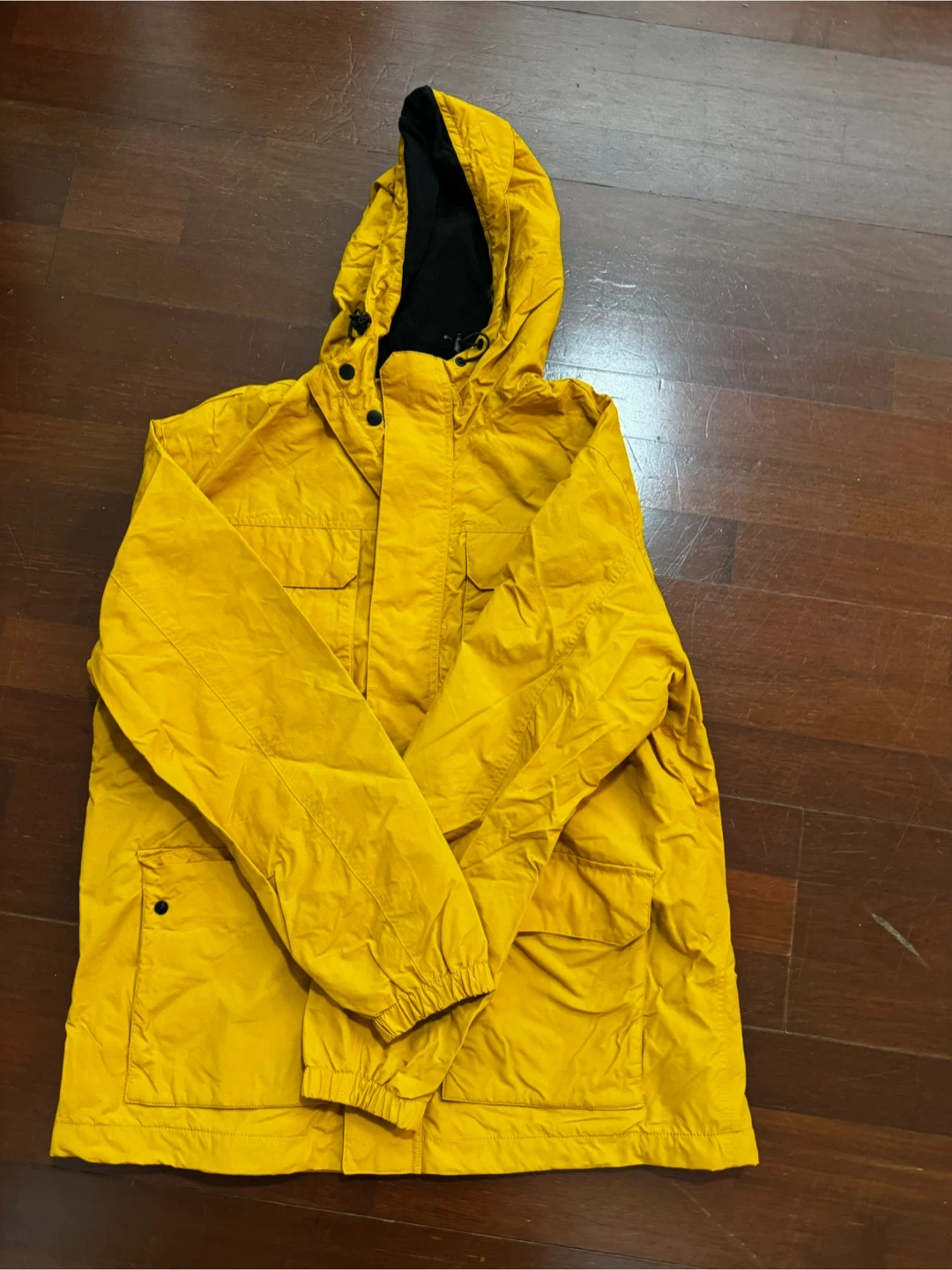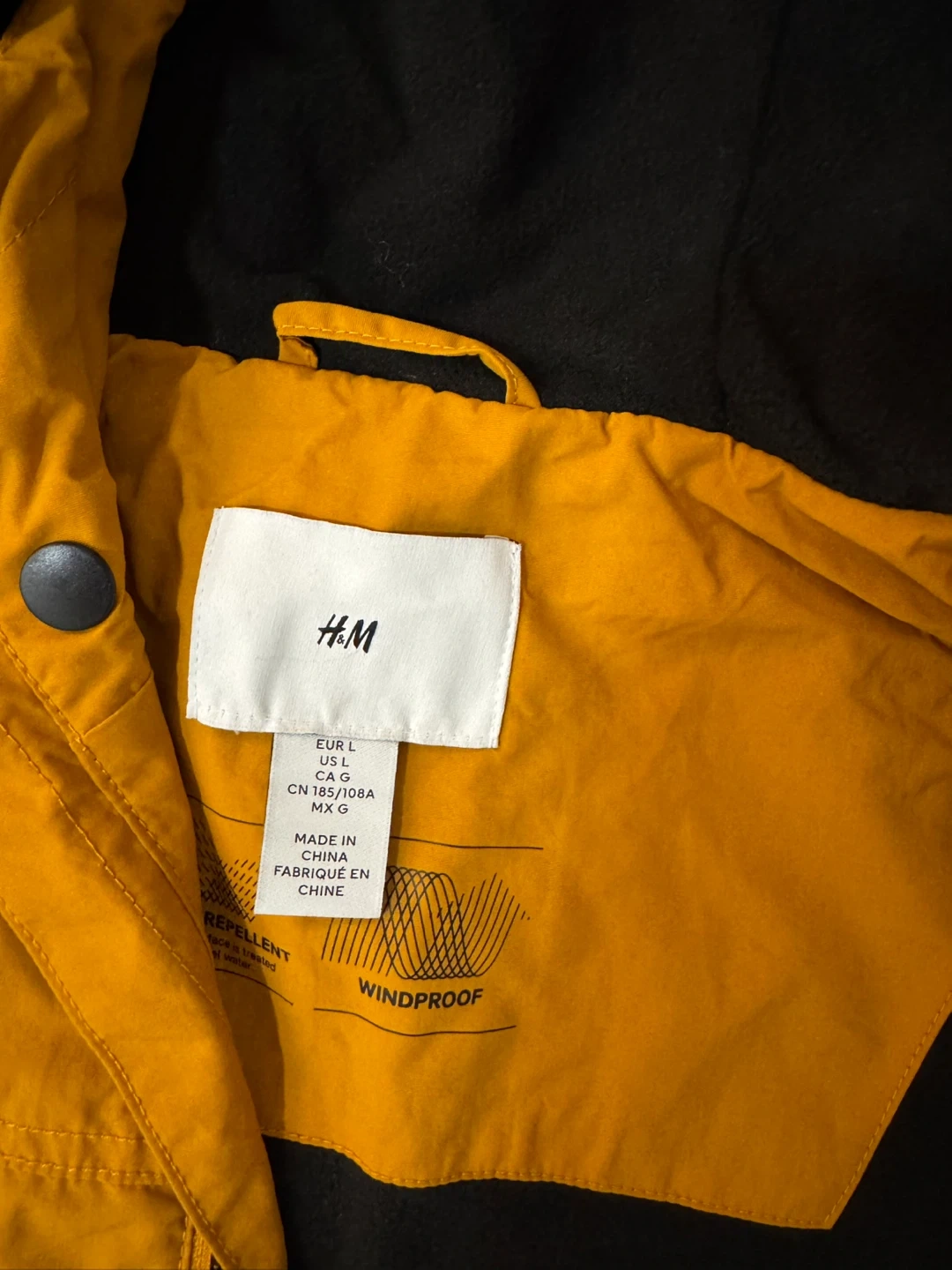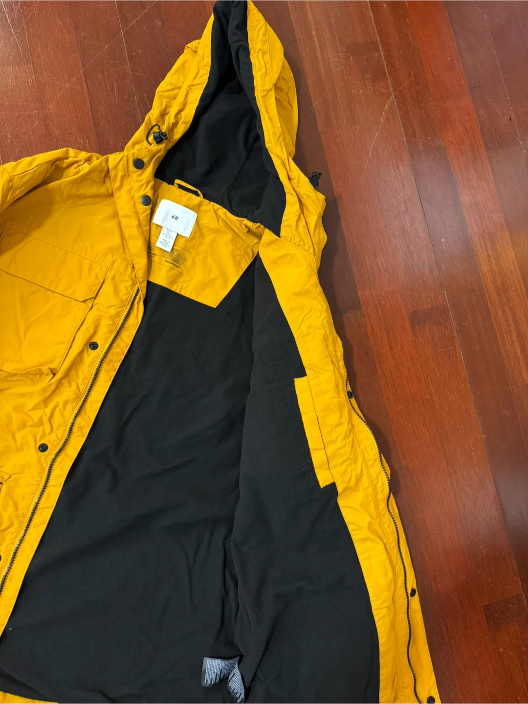 H&M yellow hooded jacket with a black lining. It's windproof and has multiple front pockets. Great for layering on cooler days!