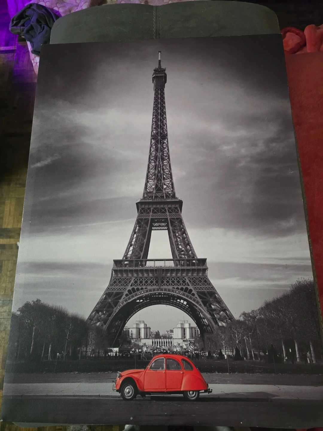 This canvas art features a black and white image of the Eiffel Tower with a red vintage car in the foreground. It's a striking piece of wall decor that adds a touch of Parisian charm to any room. Printed on canvas, it's ready to hang.
