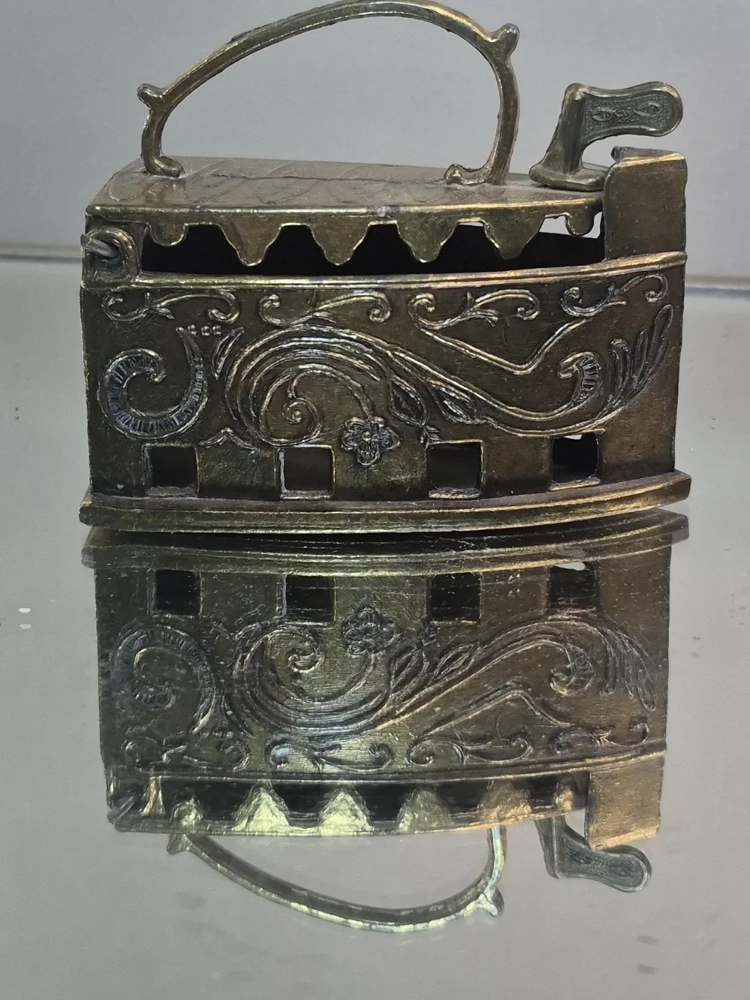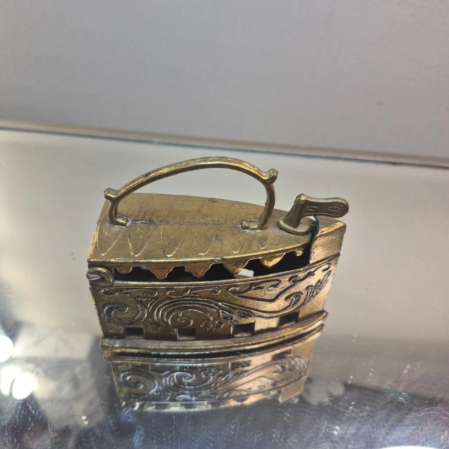 This is a charming miniature brass iron, perfect for display. It's made of metal and features decorative scrollwork. It's a unique decorative item or could be used as a unique holder.