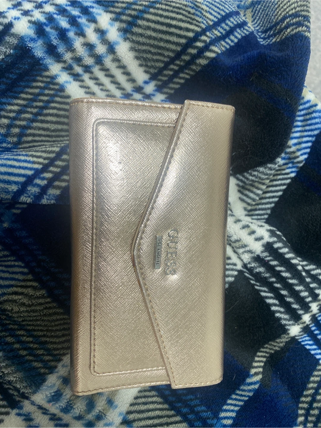 This is a rose gold wallet from Guess. It's made of a textured faux leather material. Plenty of room for cards and cash! Pick up cash only