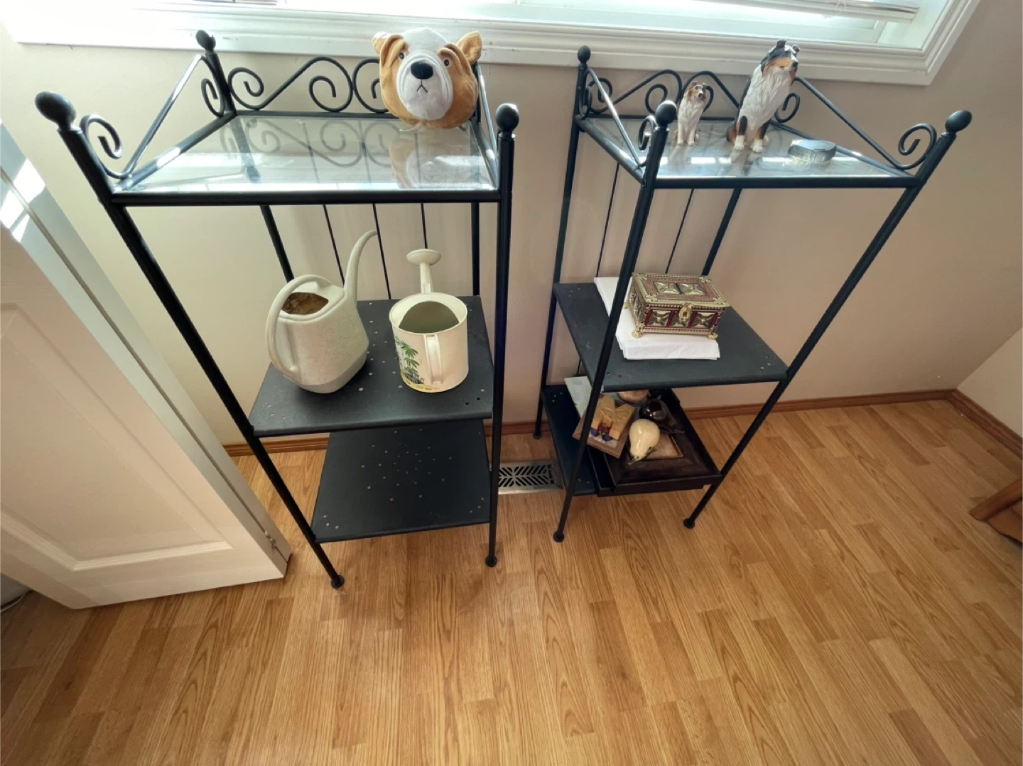 Two Black Metal Plant Stands with Glass Shelves