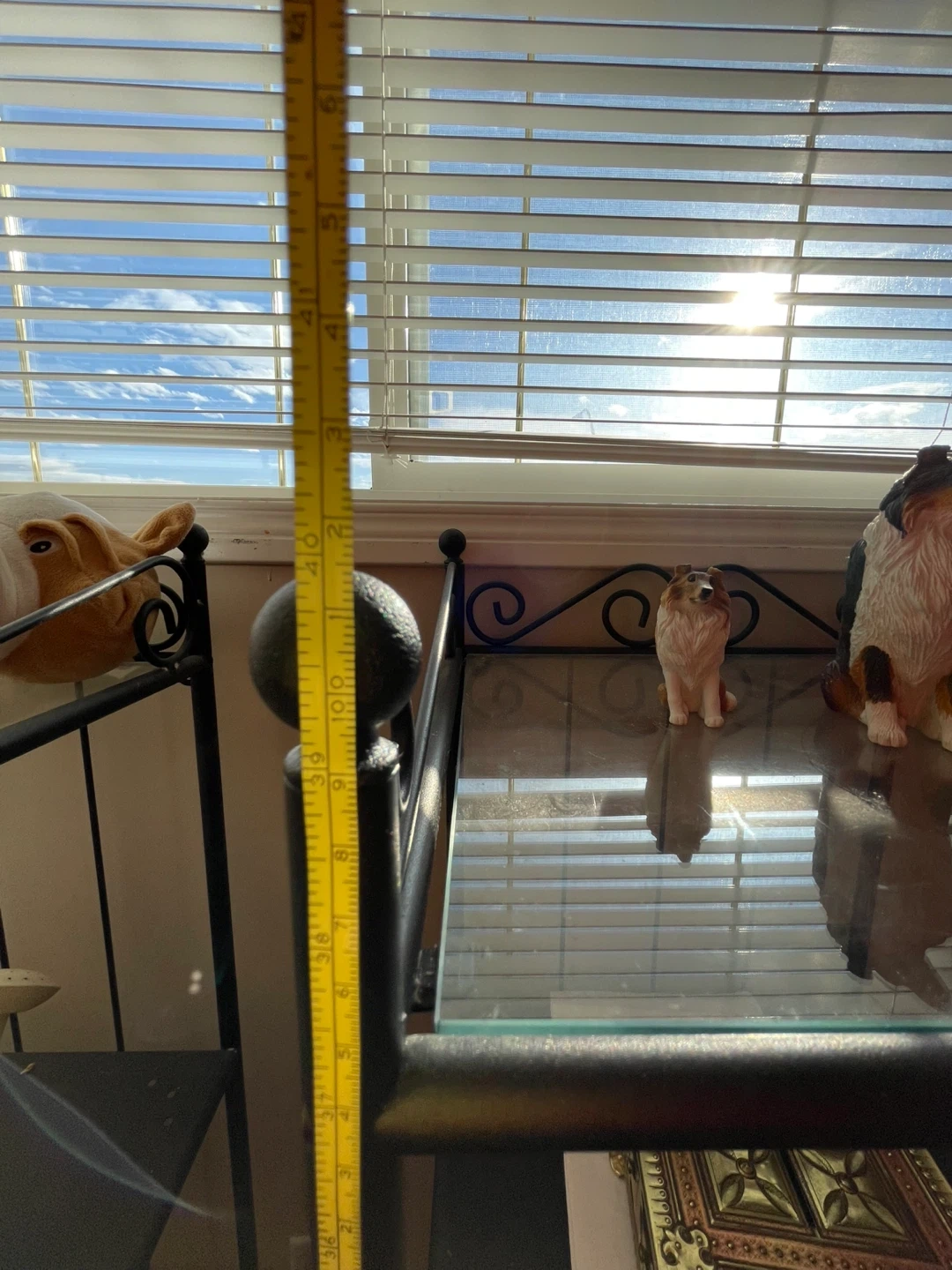 Two-tier black metal plant stand with decorative scrollwork and glass shelves. It's about 40 inches tall and 15 inches wide. This rack is suitable for kitchens or small spaces. It holds items like pots, pans, or decorative pieces.